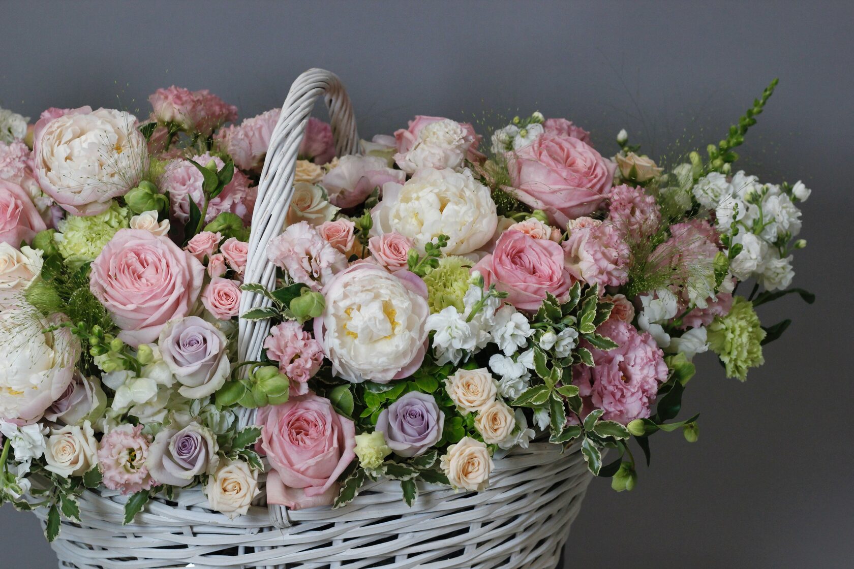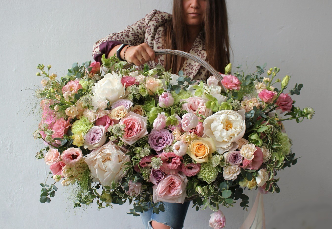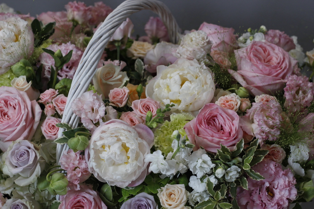 В составе: пионы, пионовидные розы Пинк Охара, маттиола, эустома, диантус, хелеборус, розы Монинг Дью, Мемори Лейн, астранция, зелень питоспорума, эвкалипт