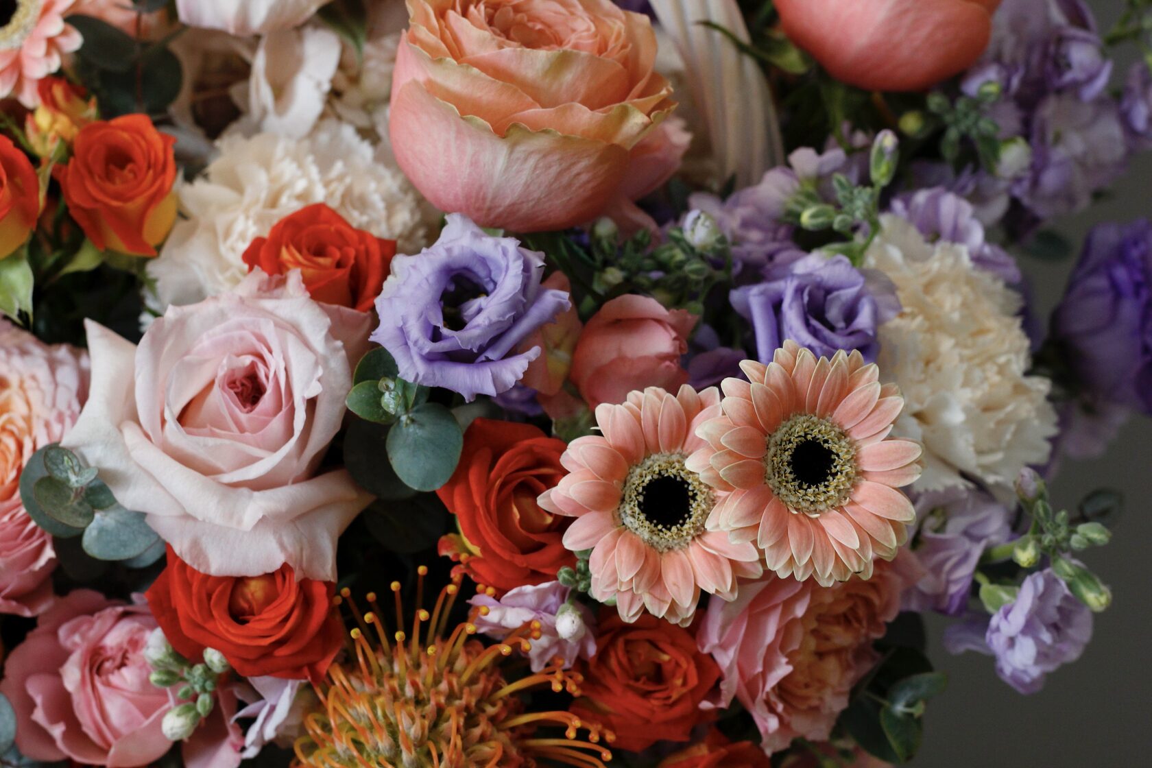 В составе: пионовидные розы Пинк Охара, Джульетта, махровая эустома, гортензии, маттиола, леукасперум, гермини, диантус.