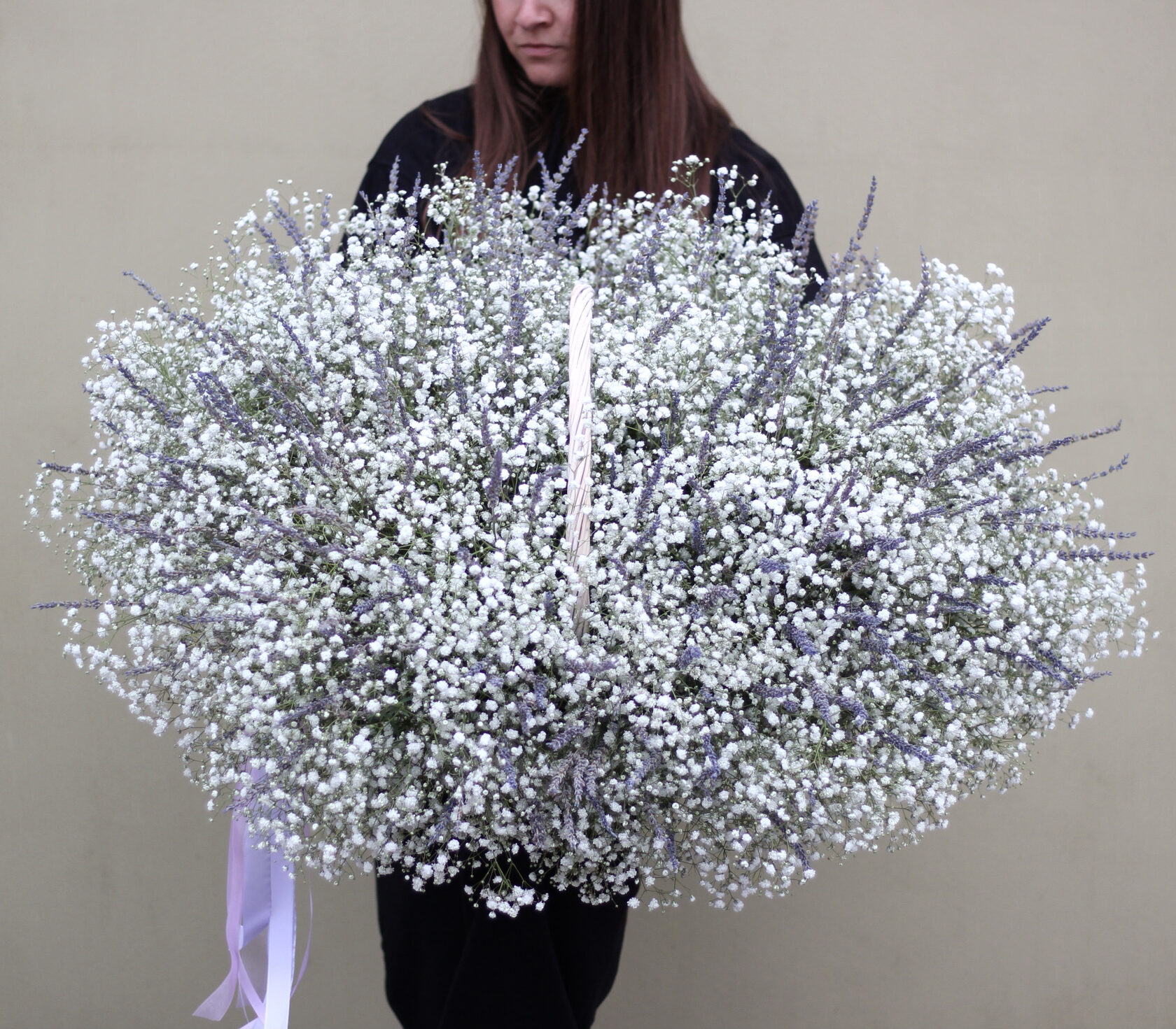 Воздушная композиция в корзине из гипсофилы и ароматной лаванды.
