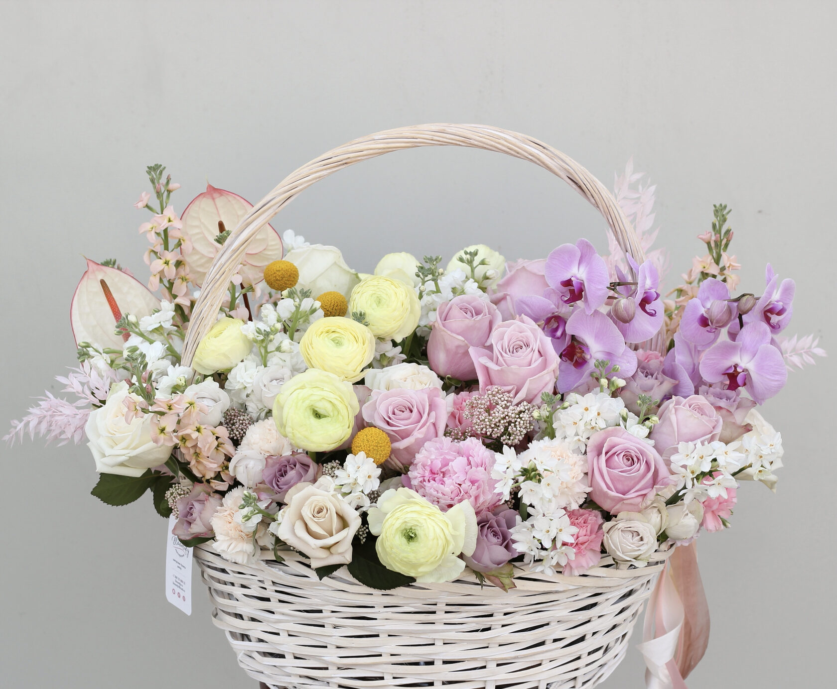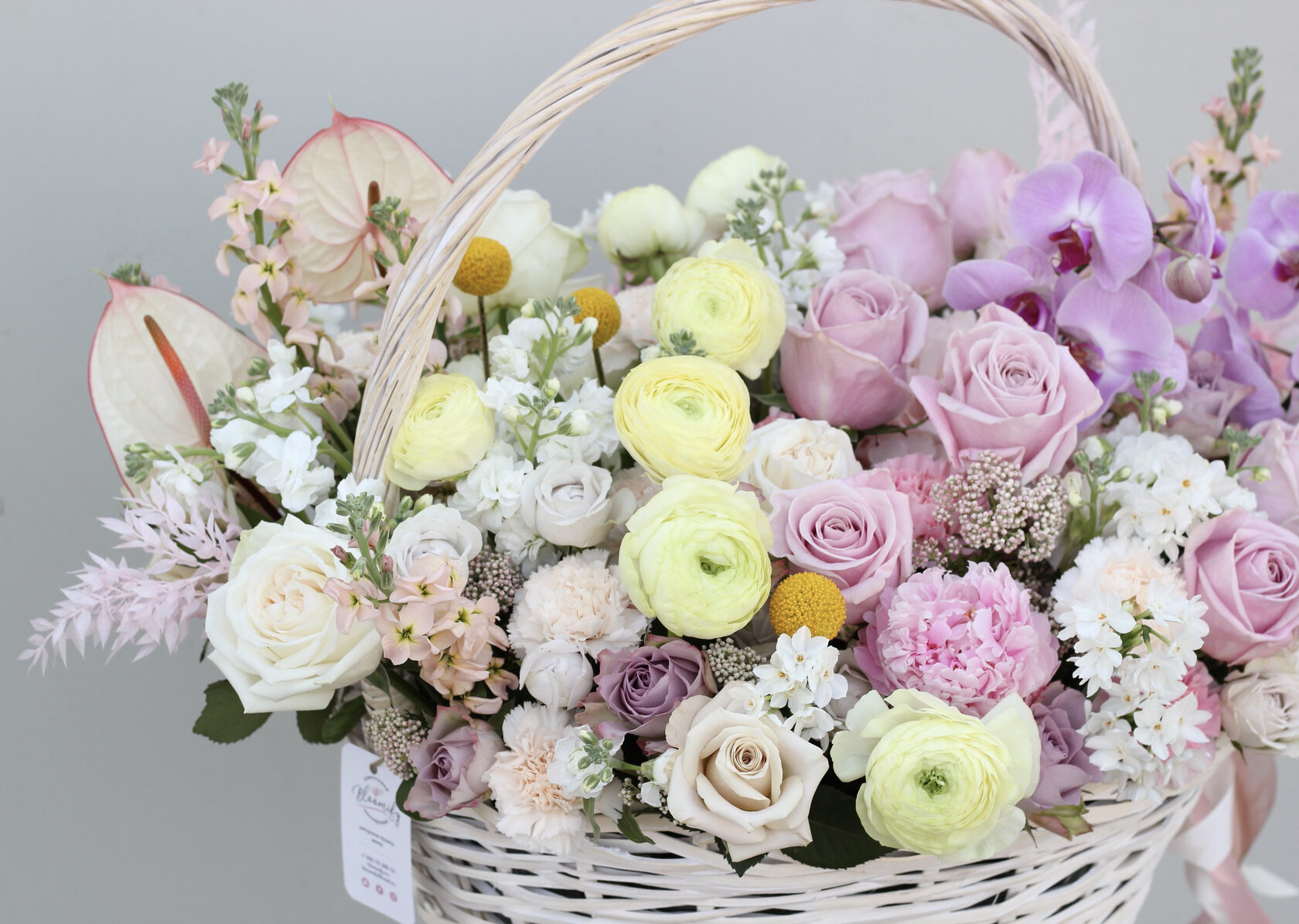 Объемная невероятно ароматная композиция в корзине в нежной весенней гамме.