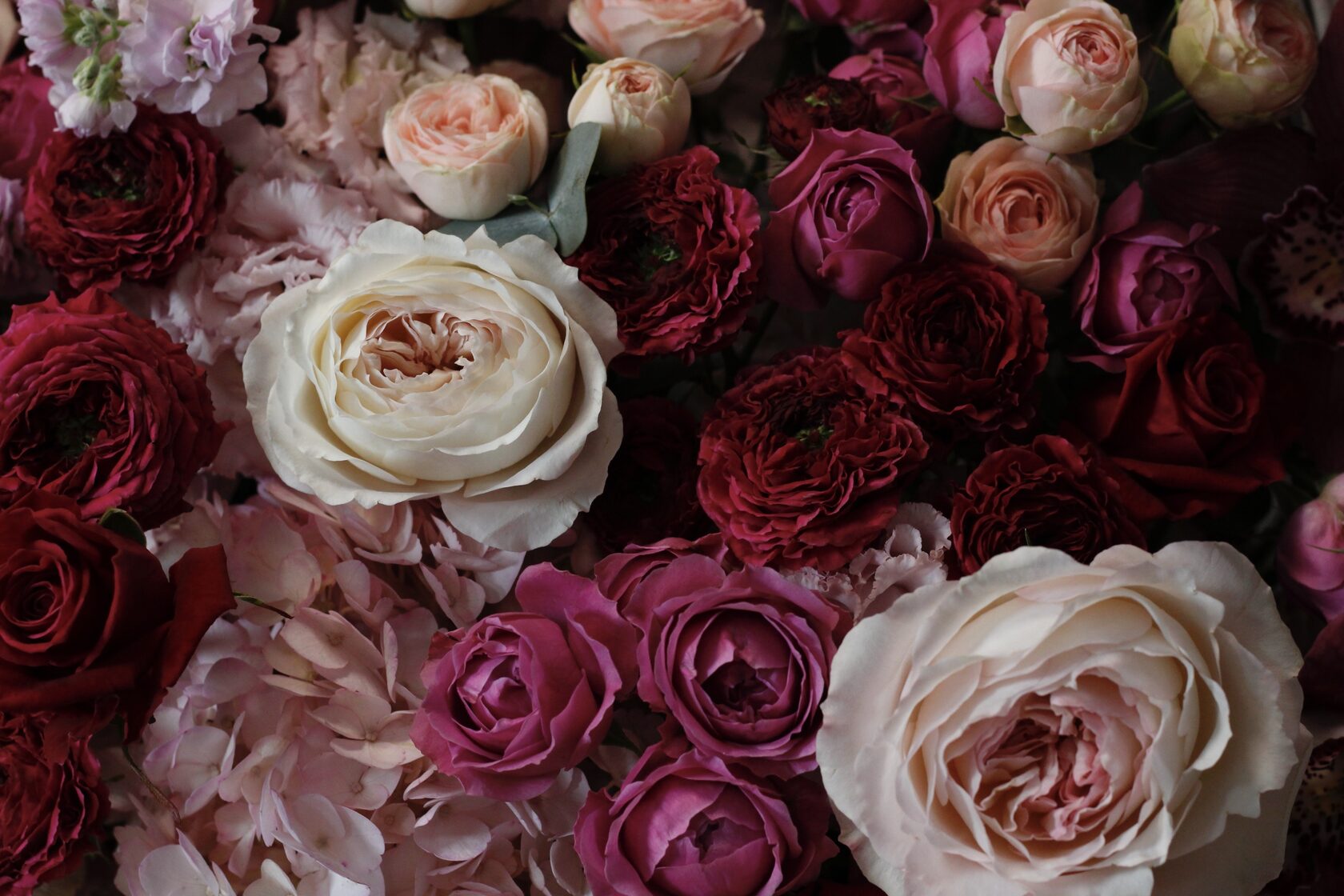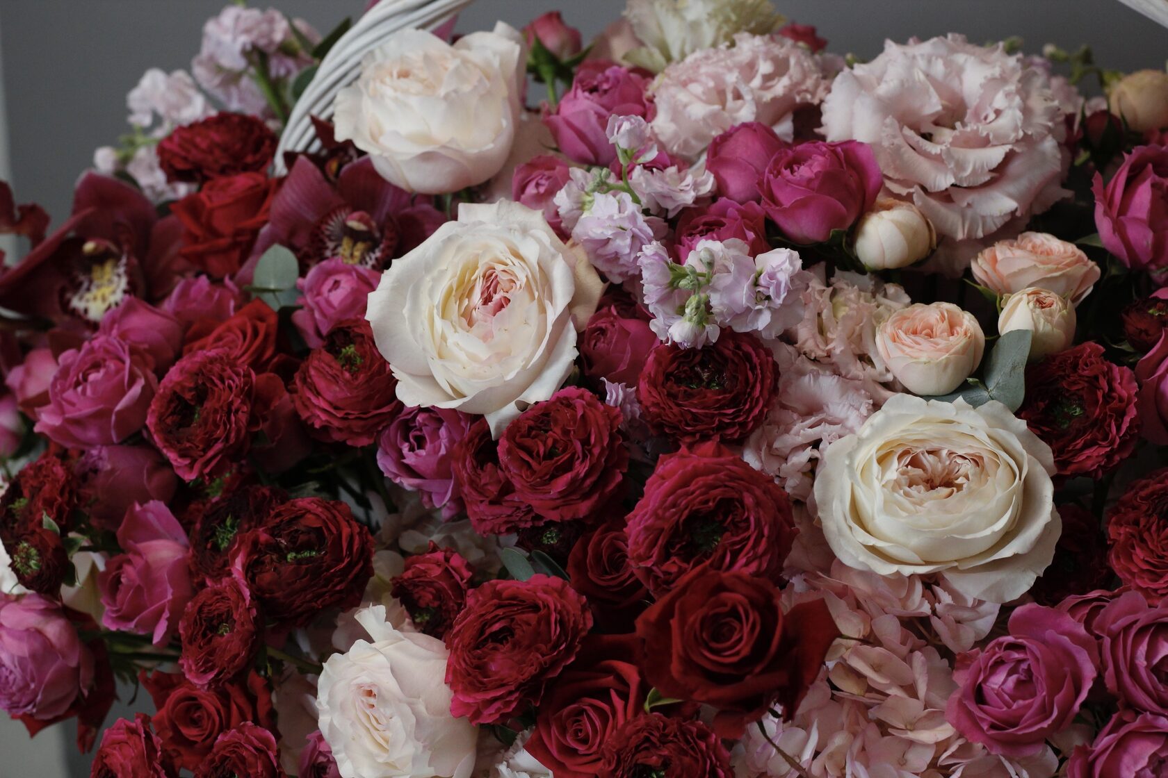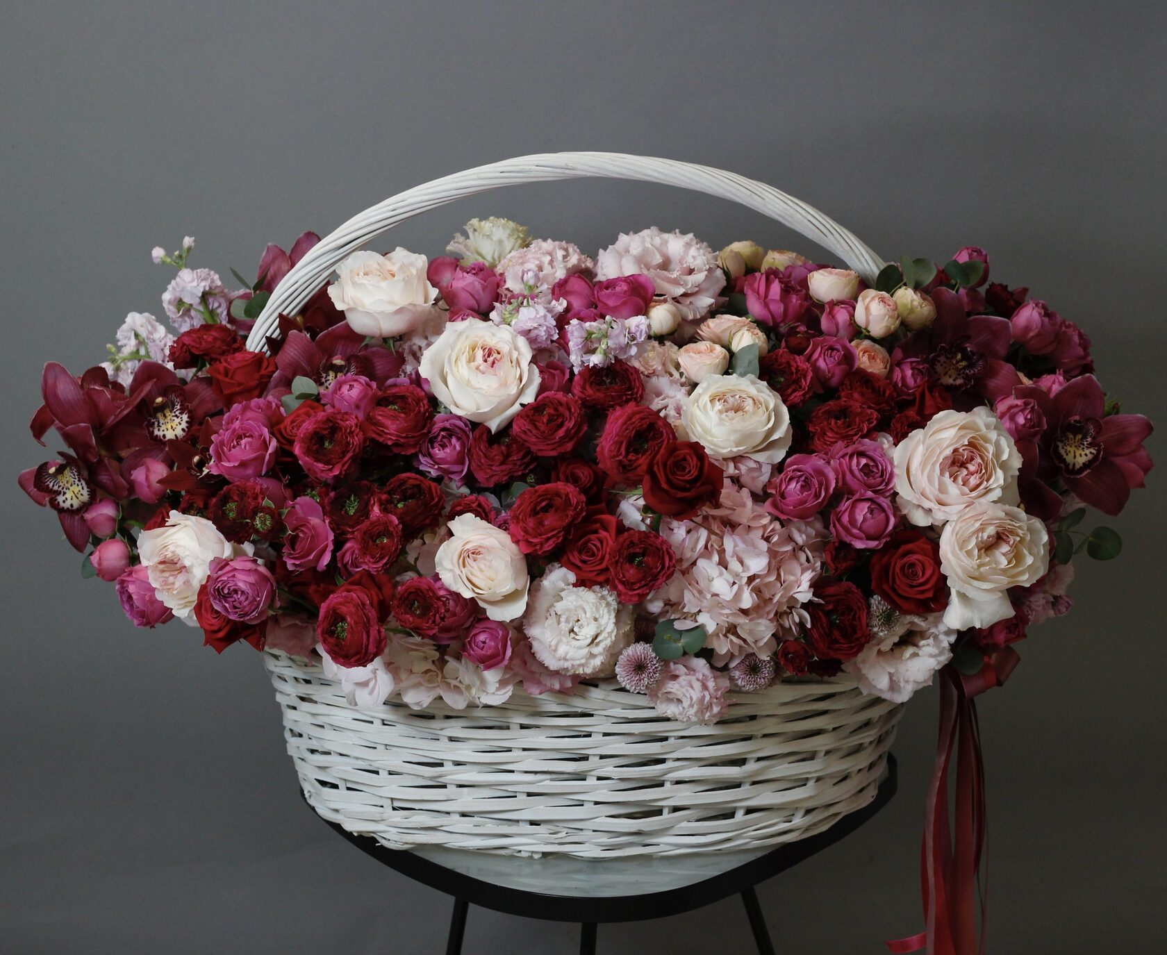 В составе: пионовидные кустовые розы нескольких сортов, пионовидные садовые розы Кейра, орхидеи, гортензии, маттиола, эустома, зелень эвкалипта