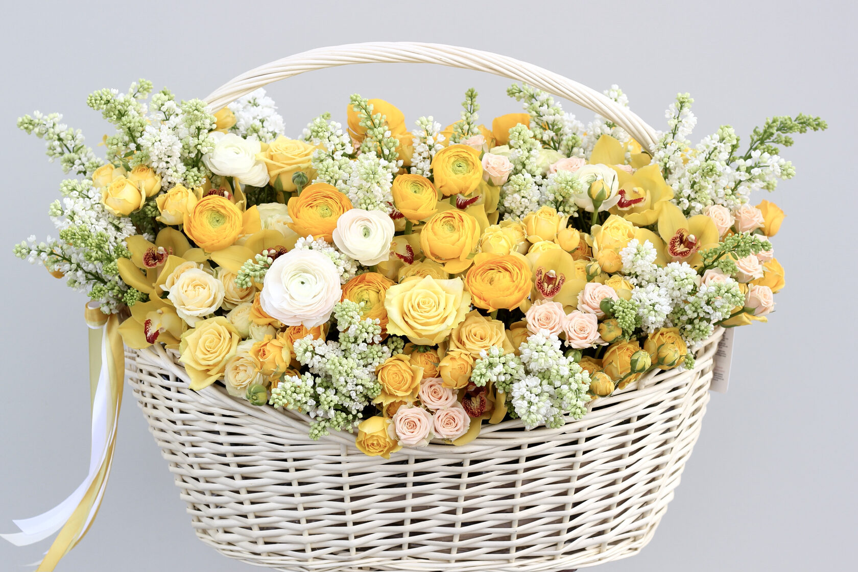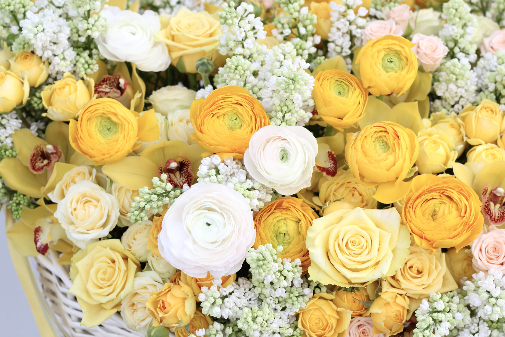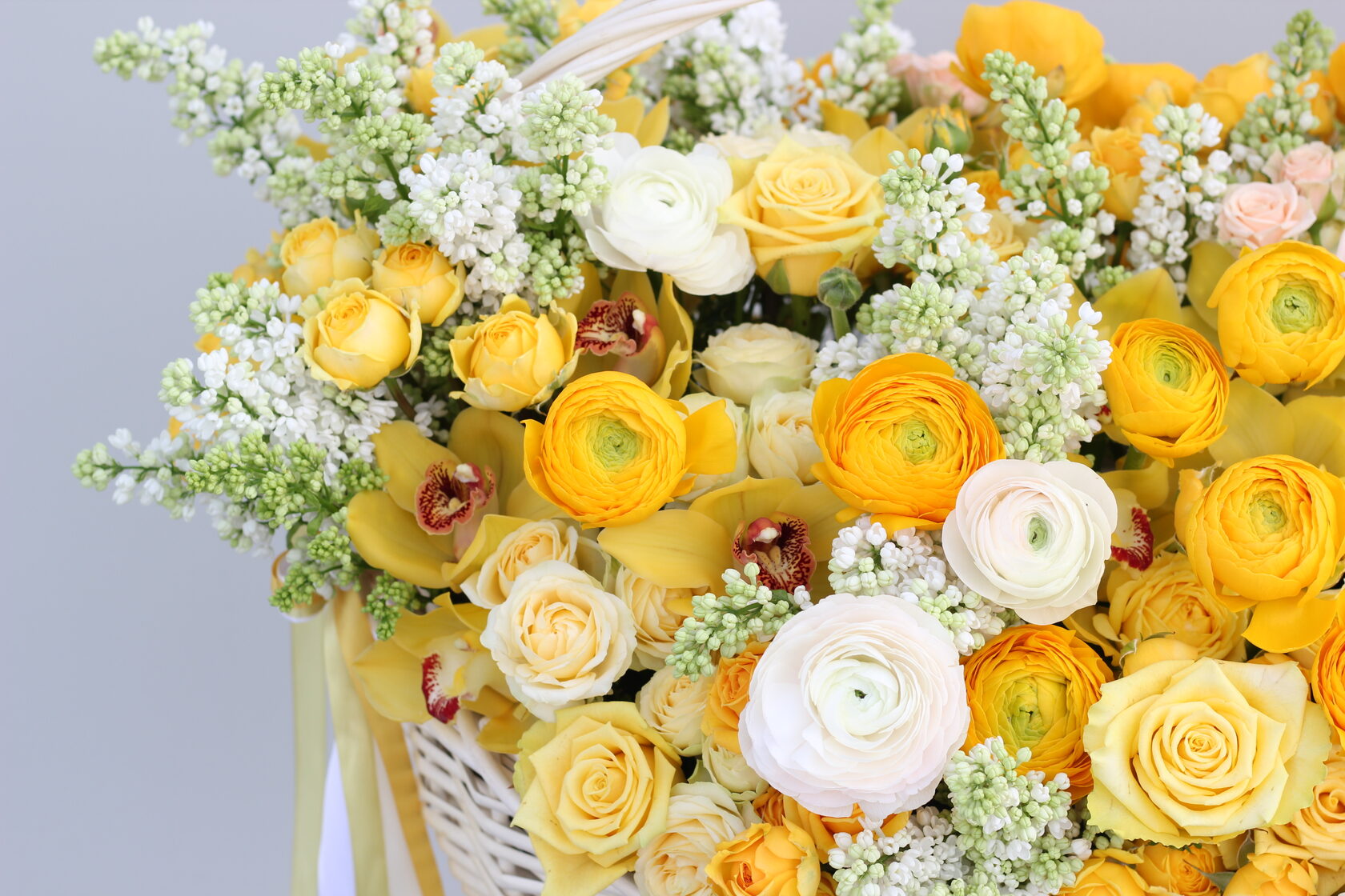 В составе: сирень, ранункулюсы, орхидеи, несколько сортов пионовидных роз.