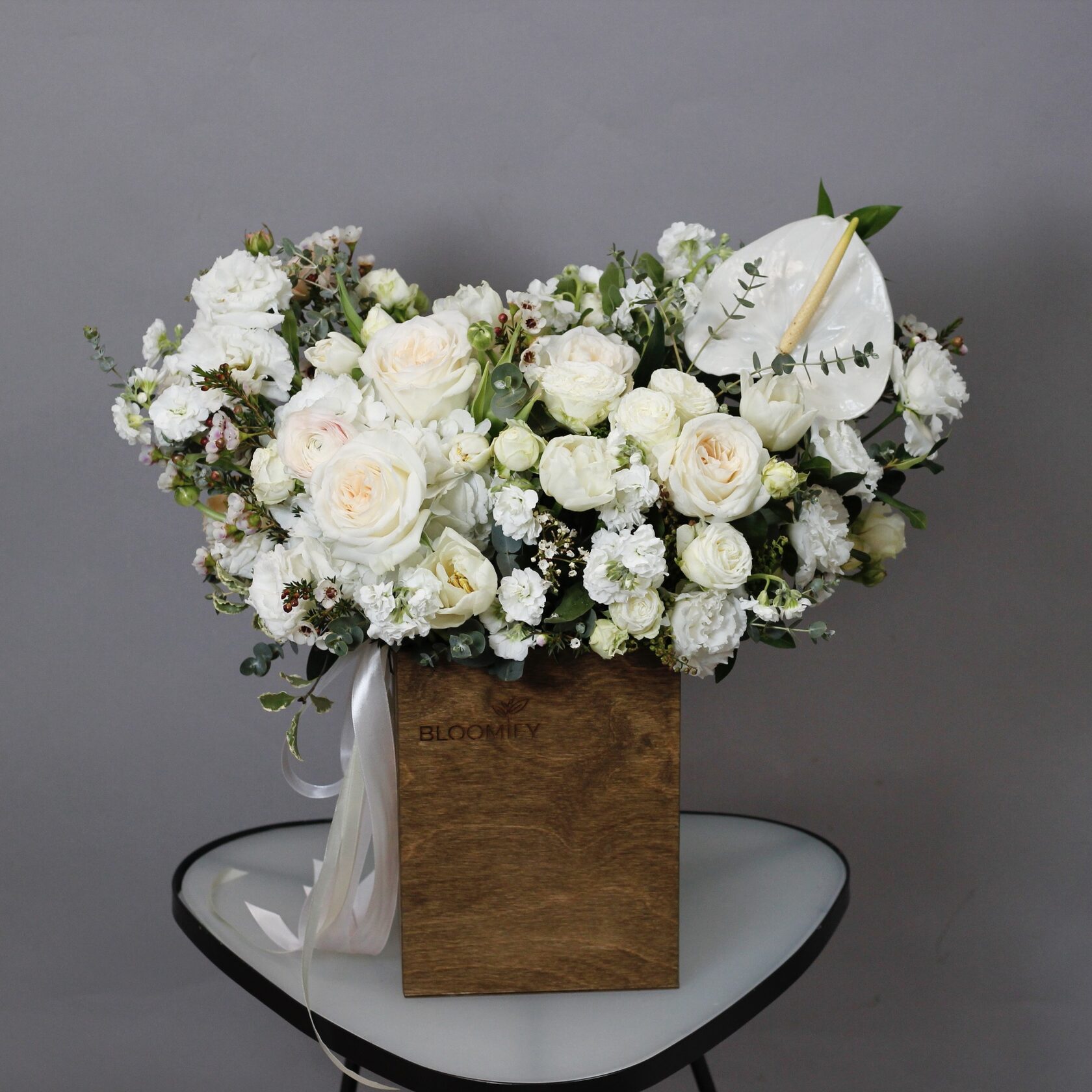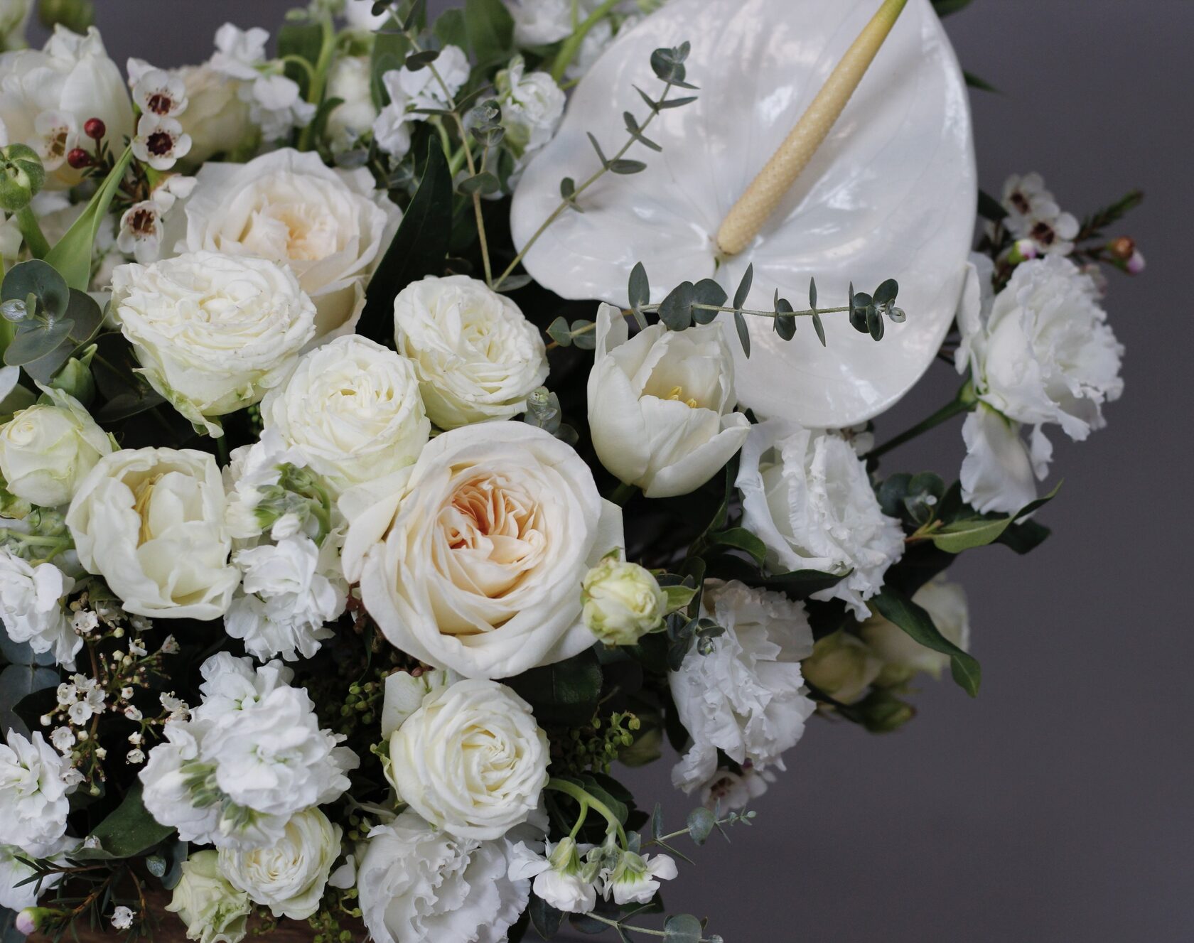 В составе: амариллисы, пионовидные розы, дельфиниум, антуриум, эустома, орхидеи, зелень эвкалипта.