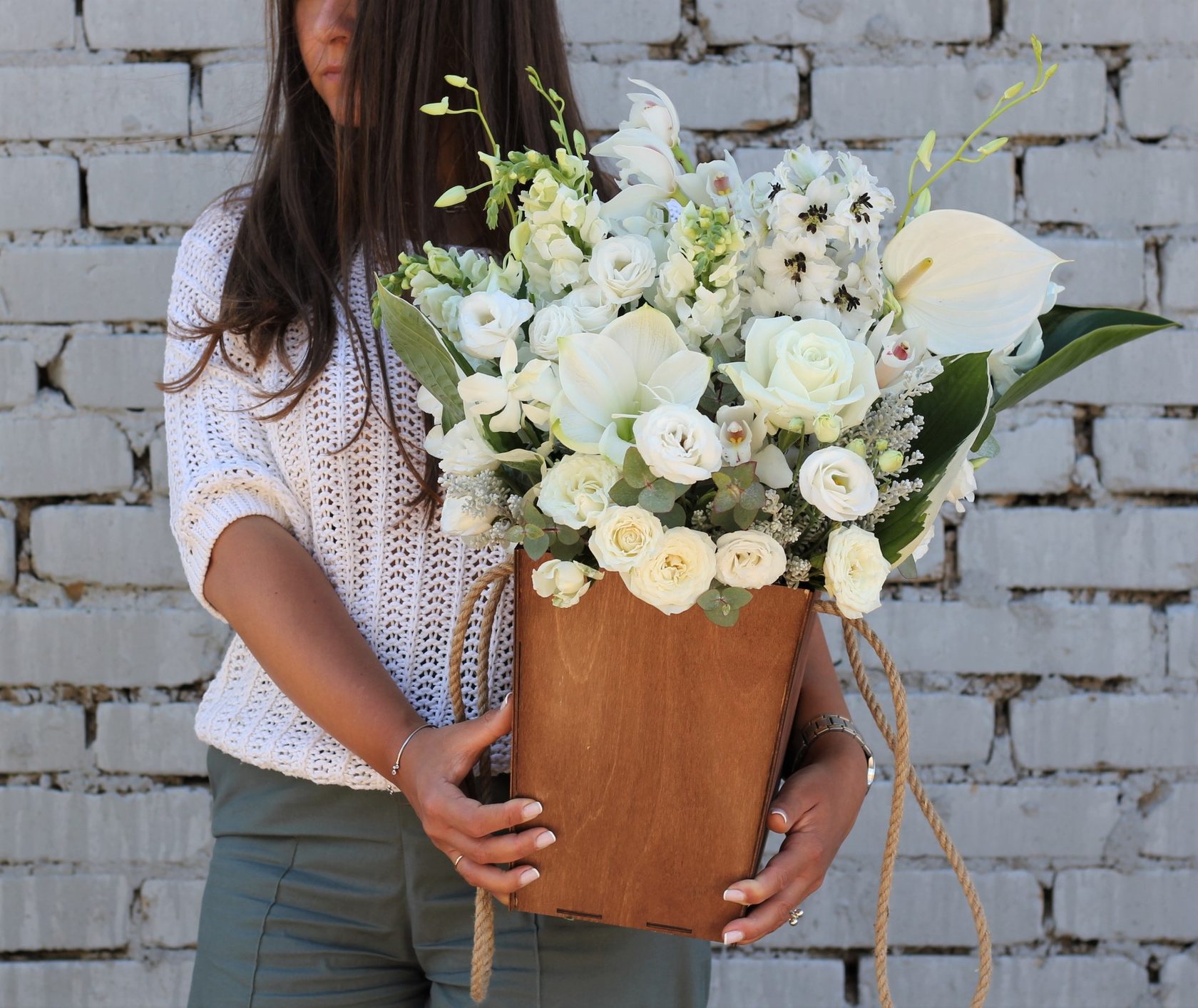 Авторская композиция в деревянном кашпо в монохромной бело-зеленой гамме.