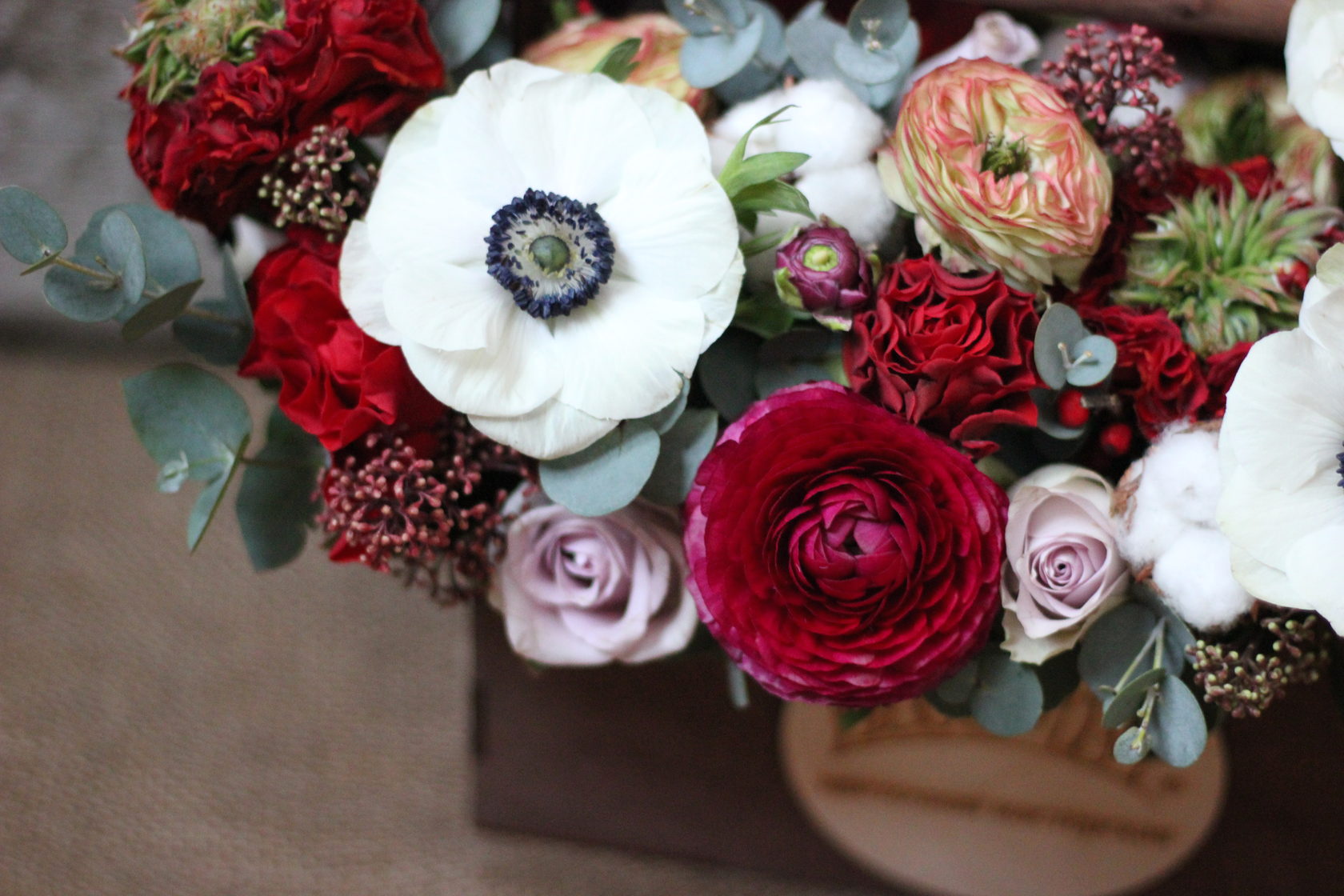 В составе: анемоны, ранункулюсы Клуни, пионовидные розы Ред Ай, розы Эль Торро, розы Моинг Дью, скимия, розы Латин помпон, хлопок, зелень эвкалипта