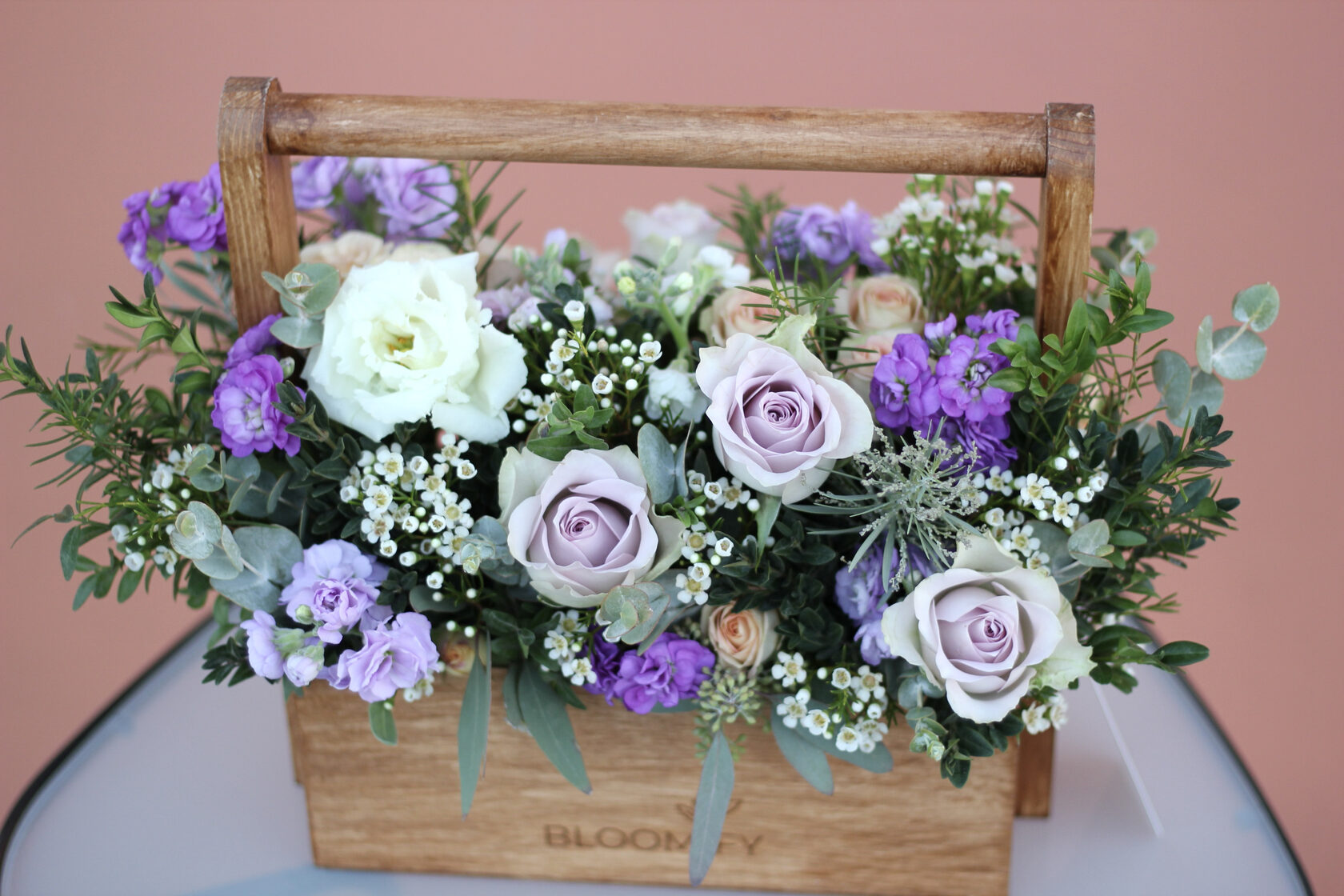 В составе: розы Мента, кустовые пионовидные розы Павлова, диантус, шамилациум, зелень эвкалипта