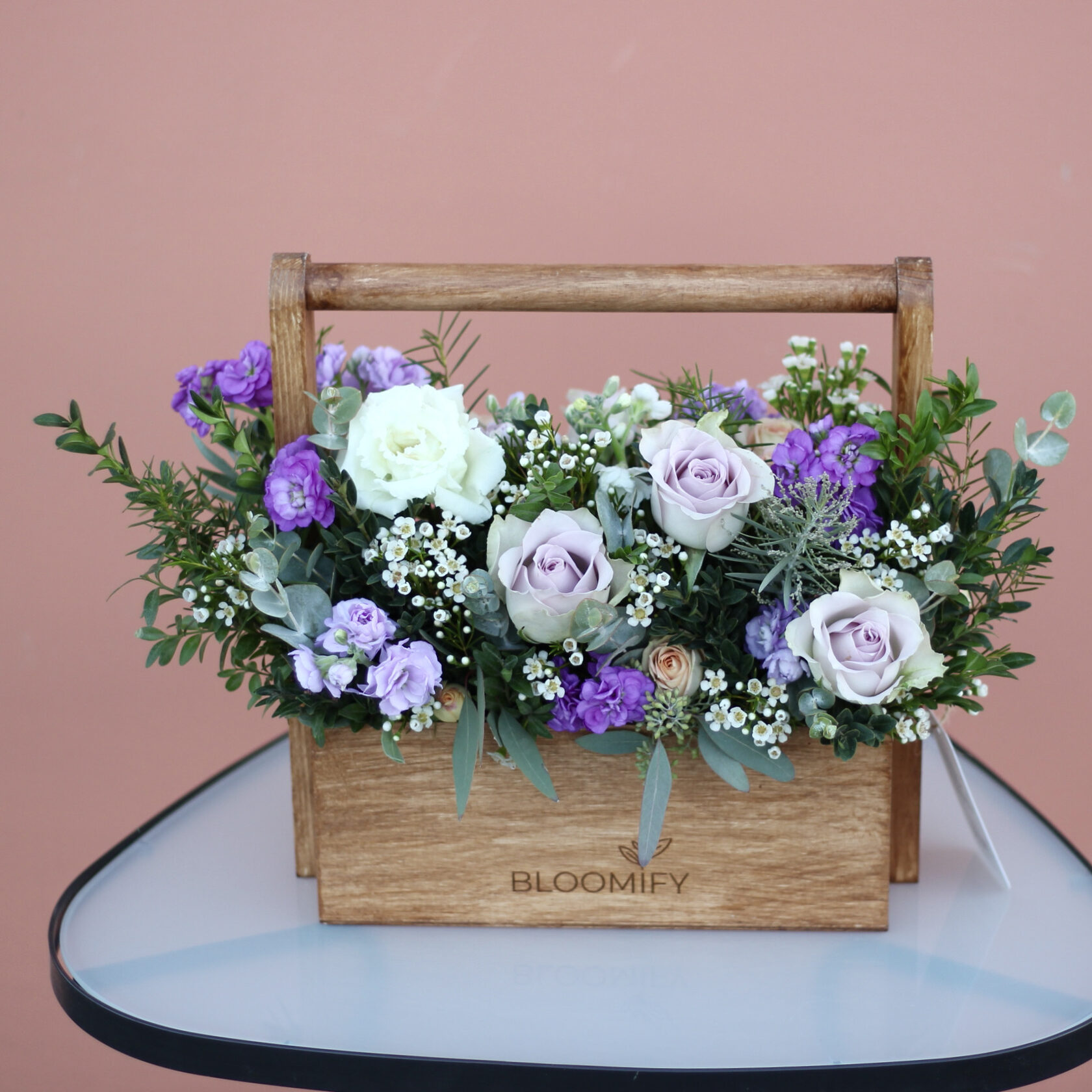 Размер композиции - 35 см. (цветы выбиваются за пределы ящика)