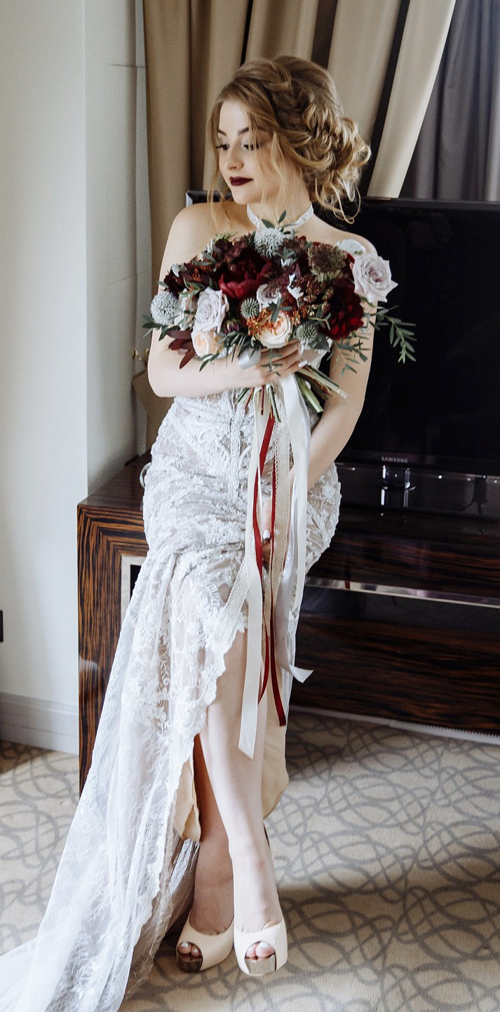 В составе: винные пионы, пионовидные розы Анжи, амми, розы мента, эрингиум, сенецио, зелень эвкалипта
