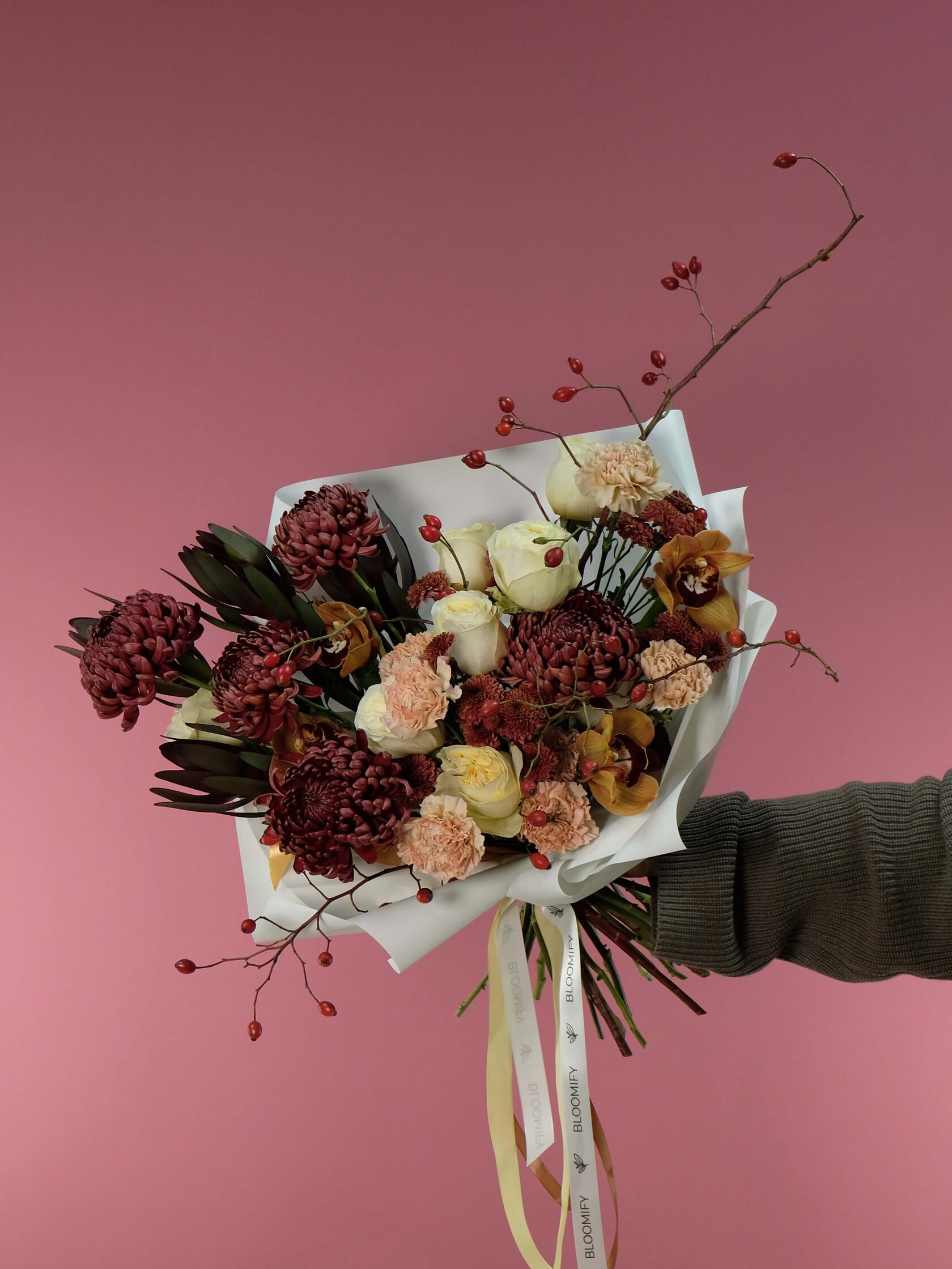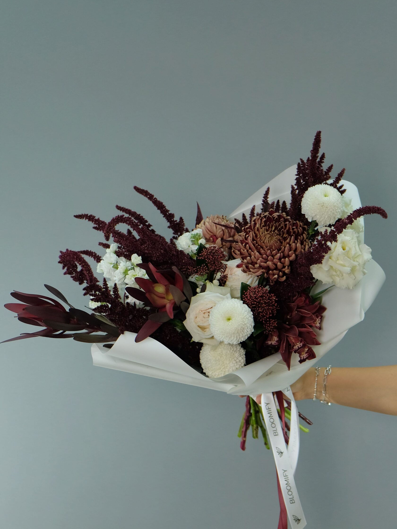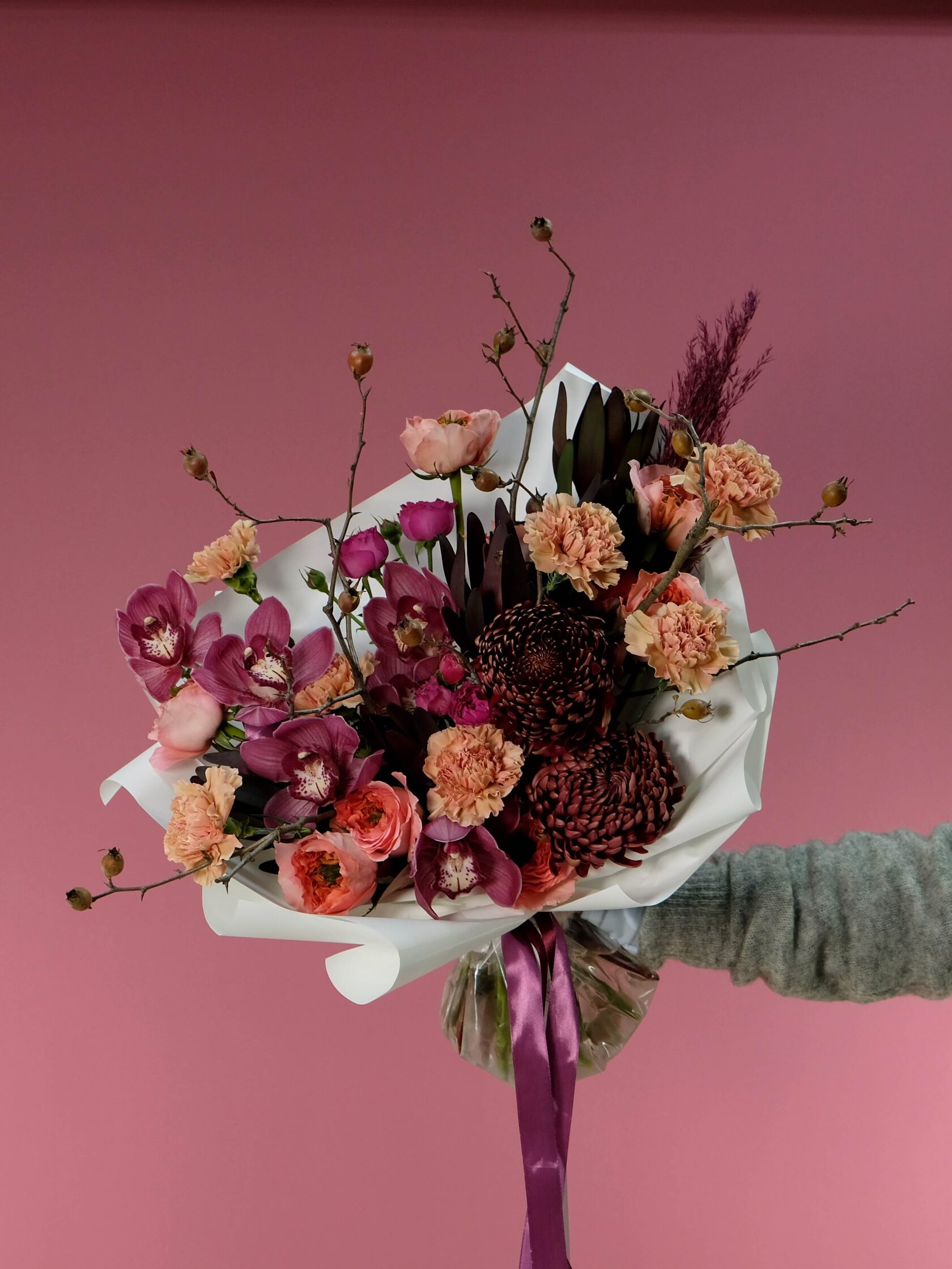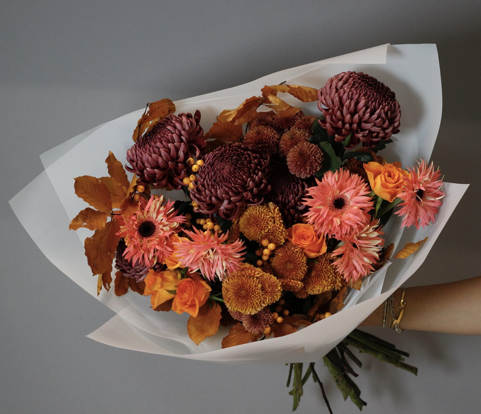 Заказать авторские букеты из актуальных и стильных осенних цветов. Купить оригинальные дизайнерские букеты на заказ в мастерской с доставкой на дом или офис в Москве.