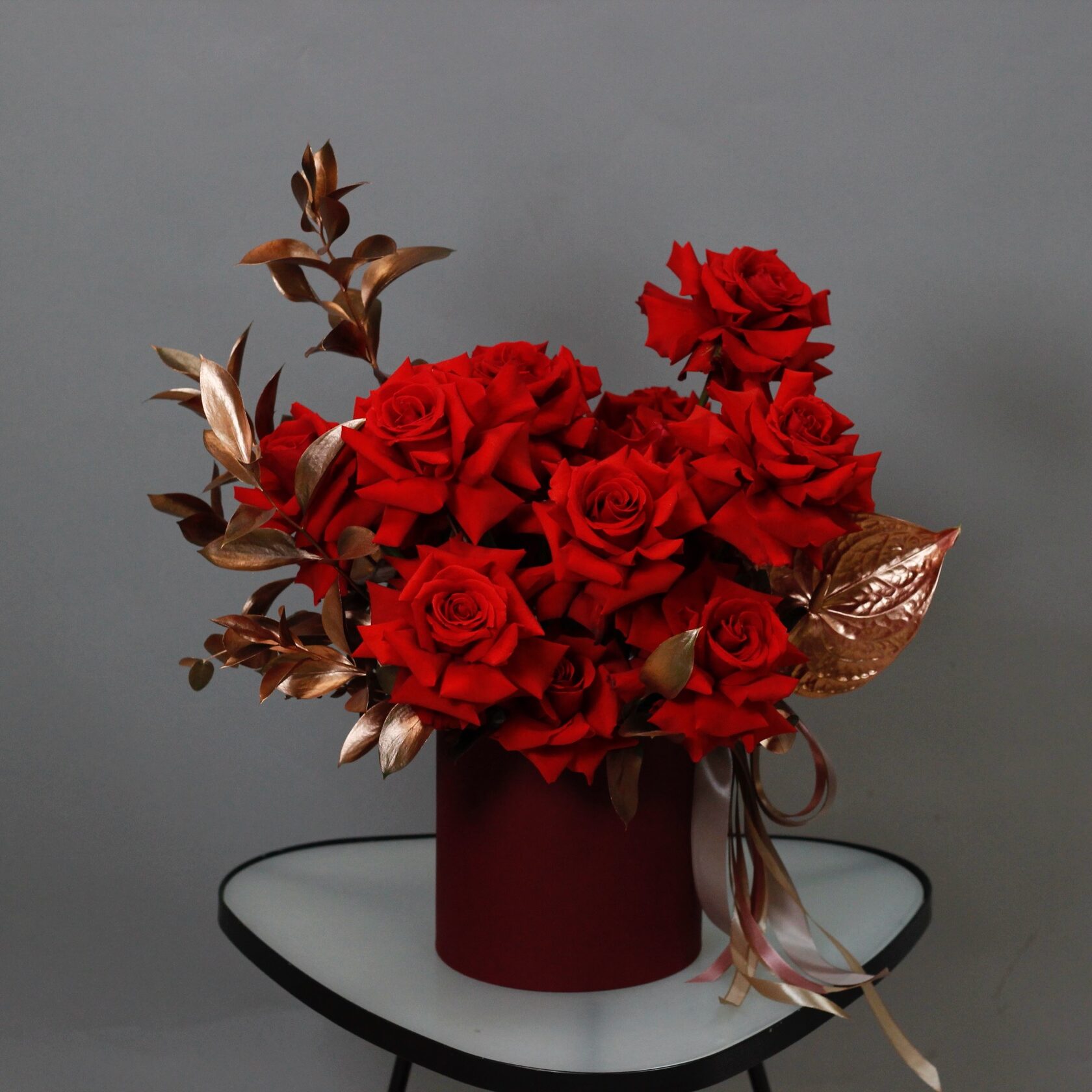 Композиция из алых роз в шляпной коробке. Современное прочтение вечной классики.