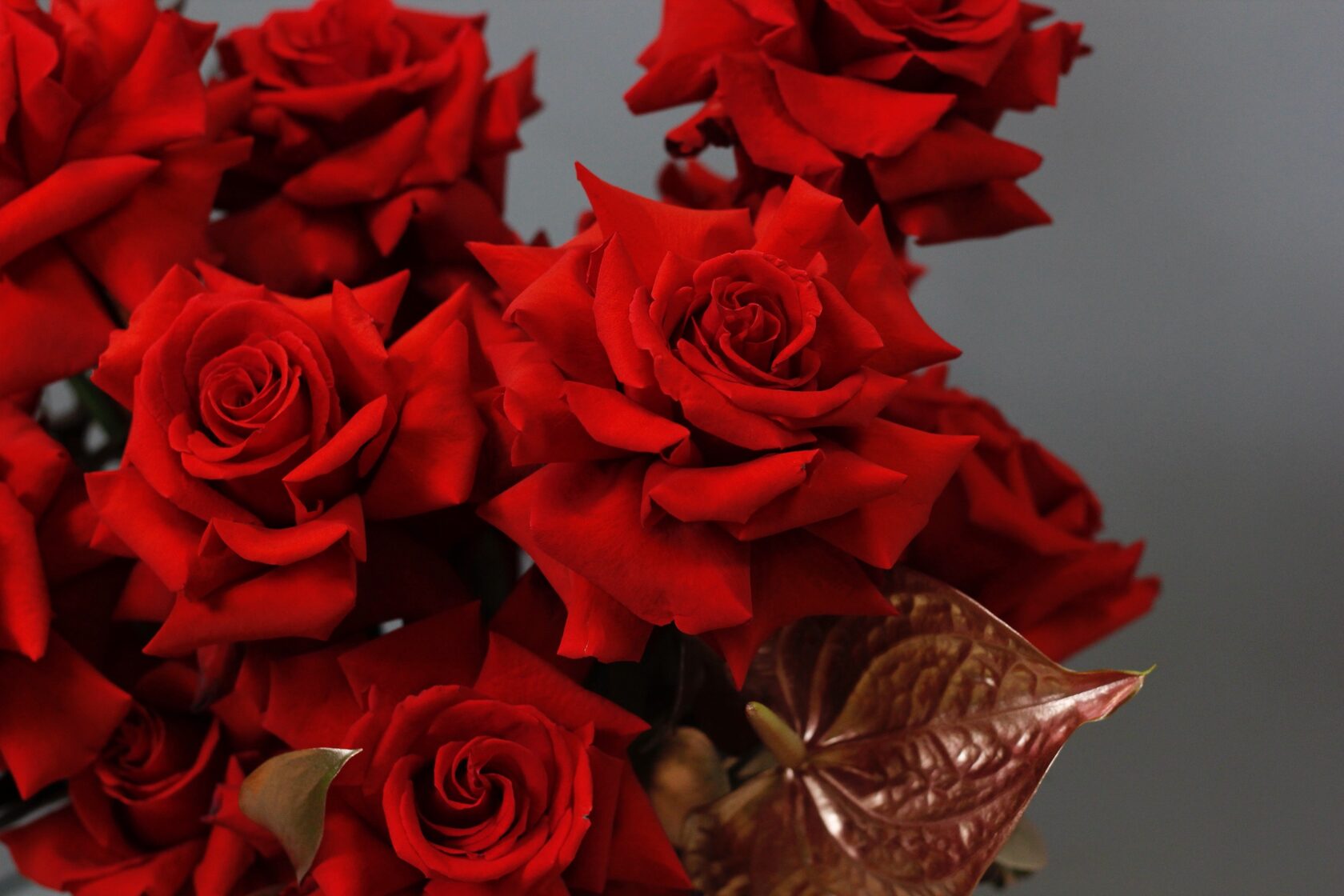 В составе композиции: алые розы сорта Нина, антуриумы, крашеный рускус