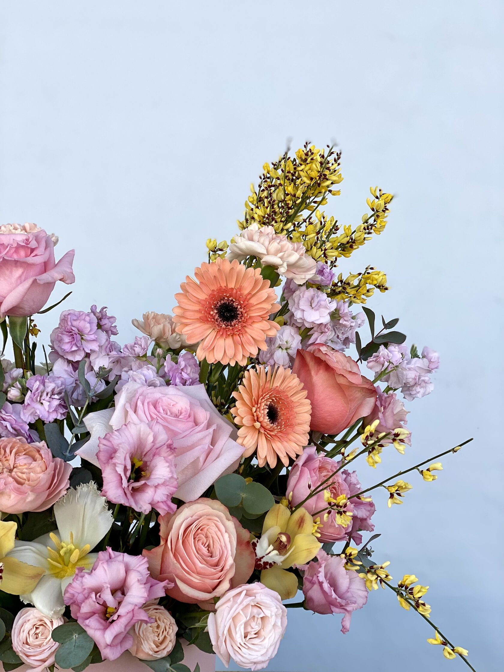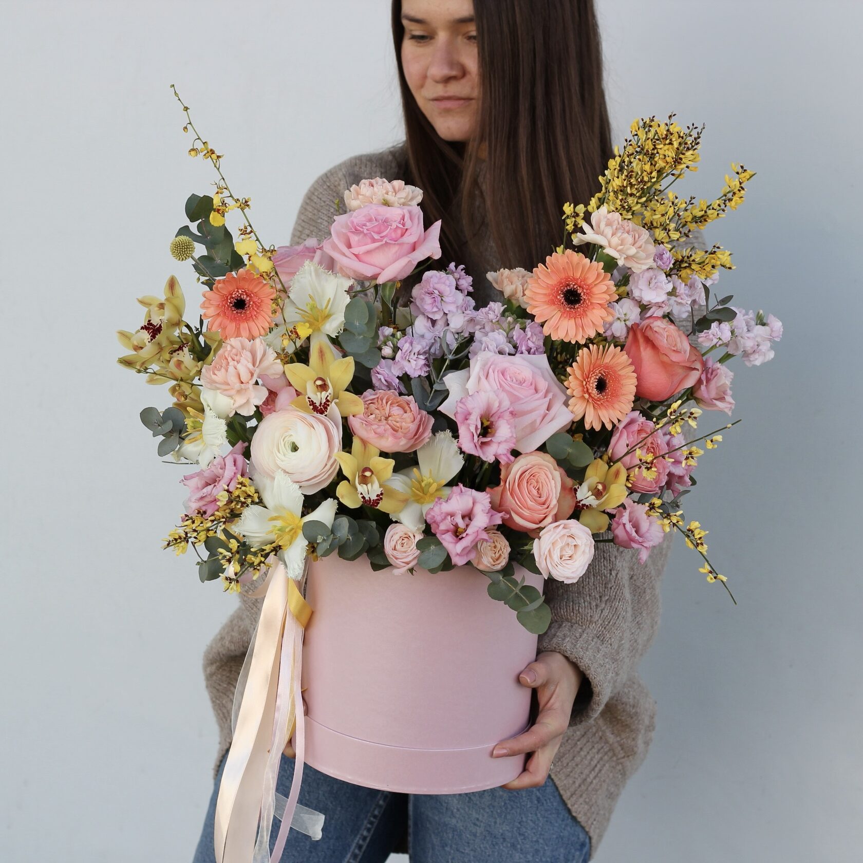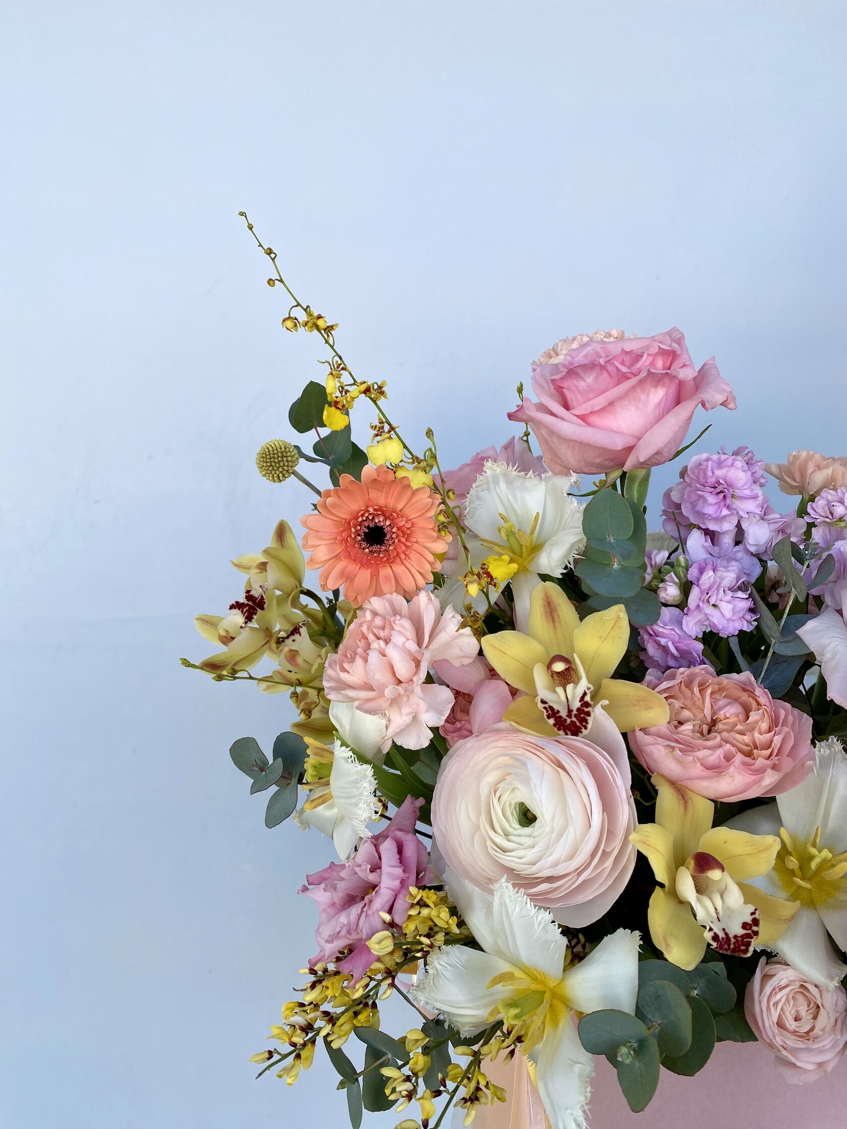 В составе: ранункулюсы, пионовидные розы, махровая эустома, герберы, маттиола, тюльпаны, орхидеи, диантусы, гениста, зелень эвкалипта.