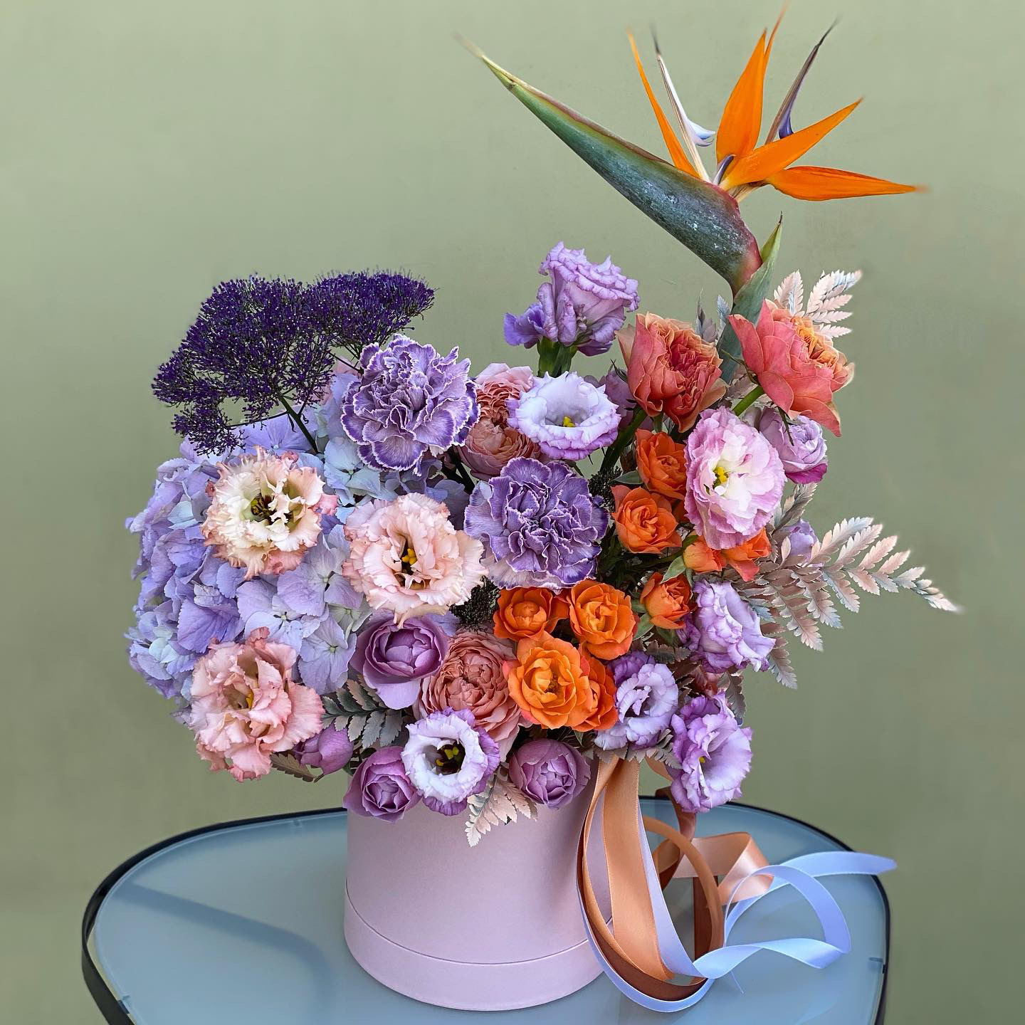 В составе: махровая эустома, кустовые розы, пионовидные розы, гортензия, диантус, трахелиум, папоротник, стрелиция.