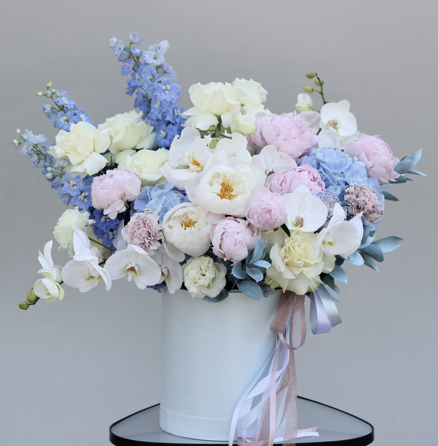 В составе: нежно-розовые пионы, кремовые пионы, гортензии, фаленопсис, дельфиниум, розы, диантусы, крашеные веточки рускуса.