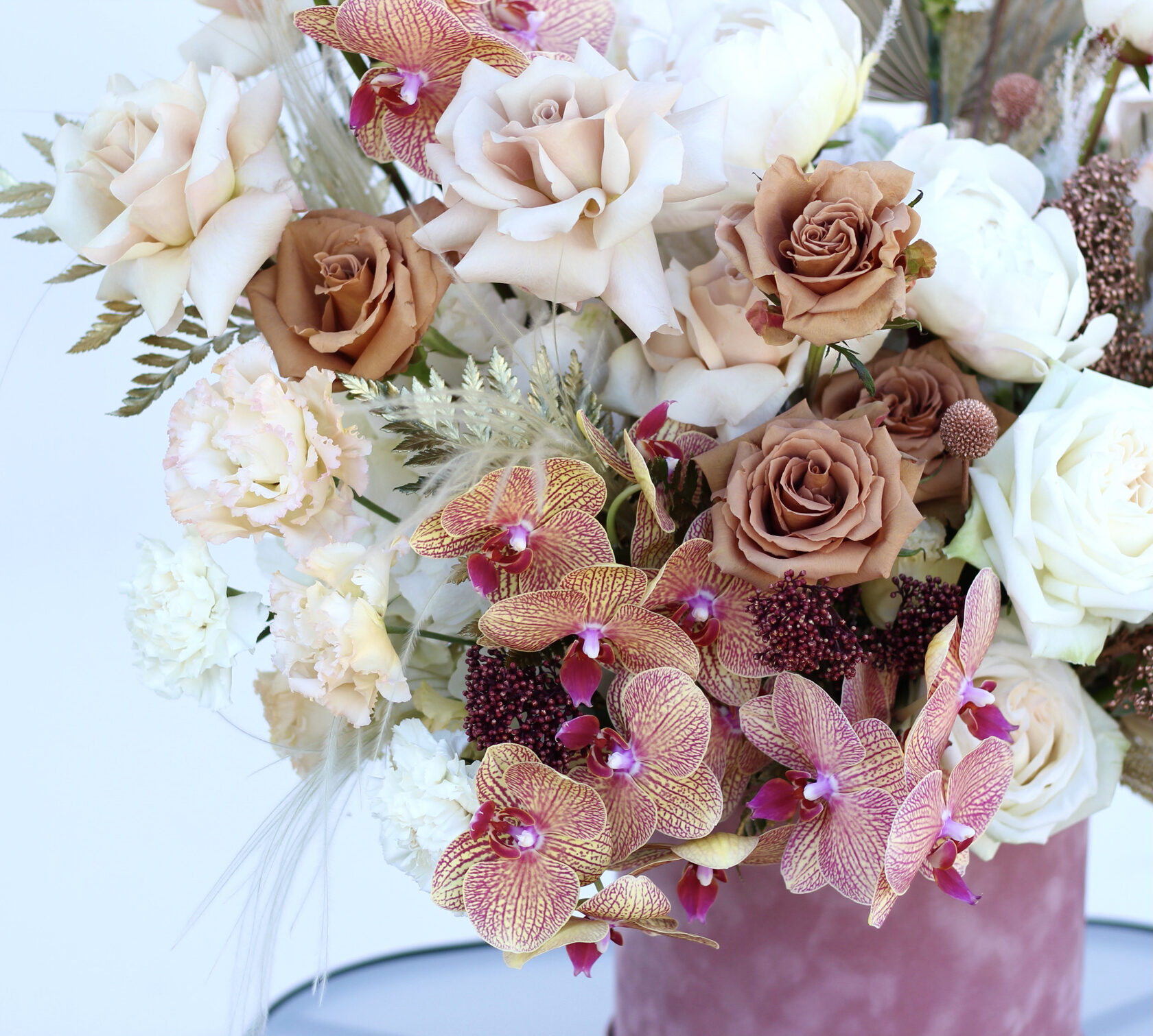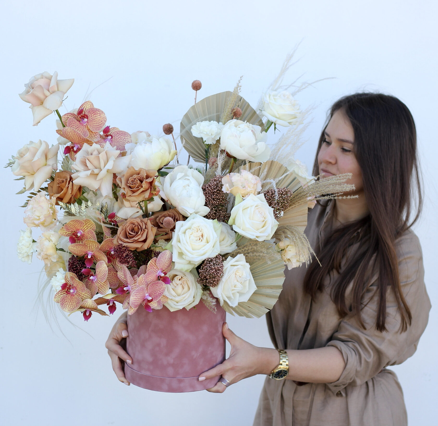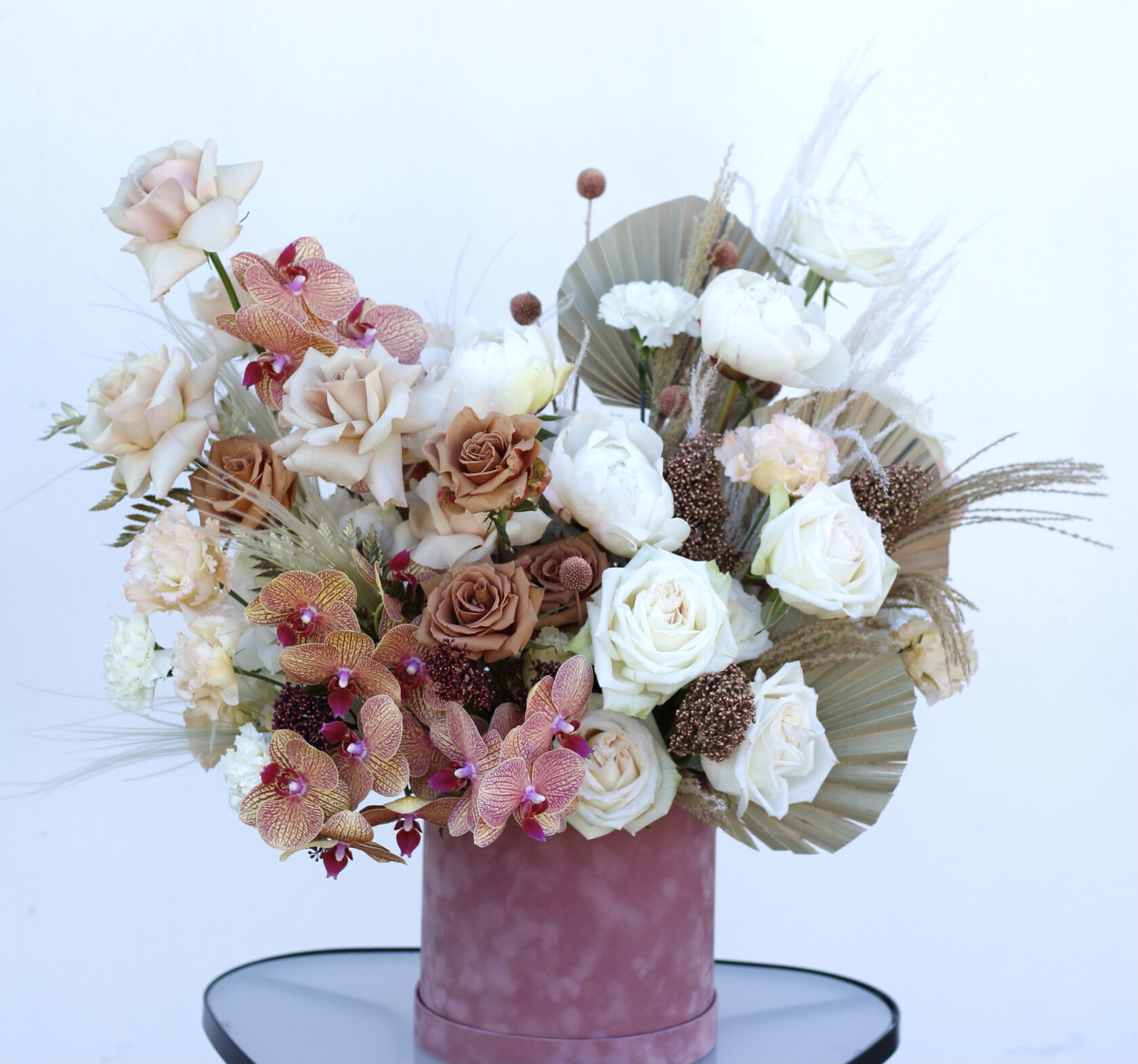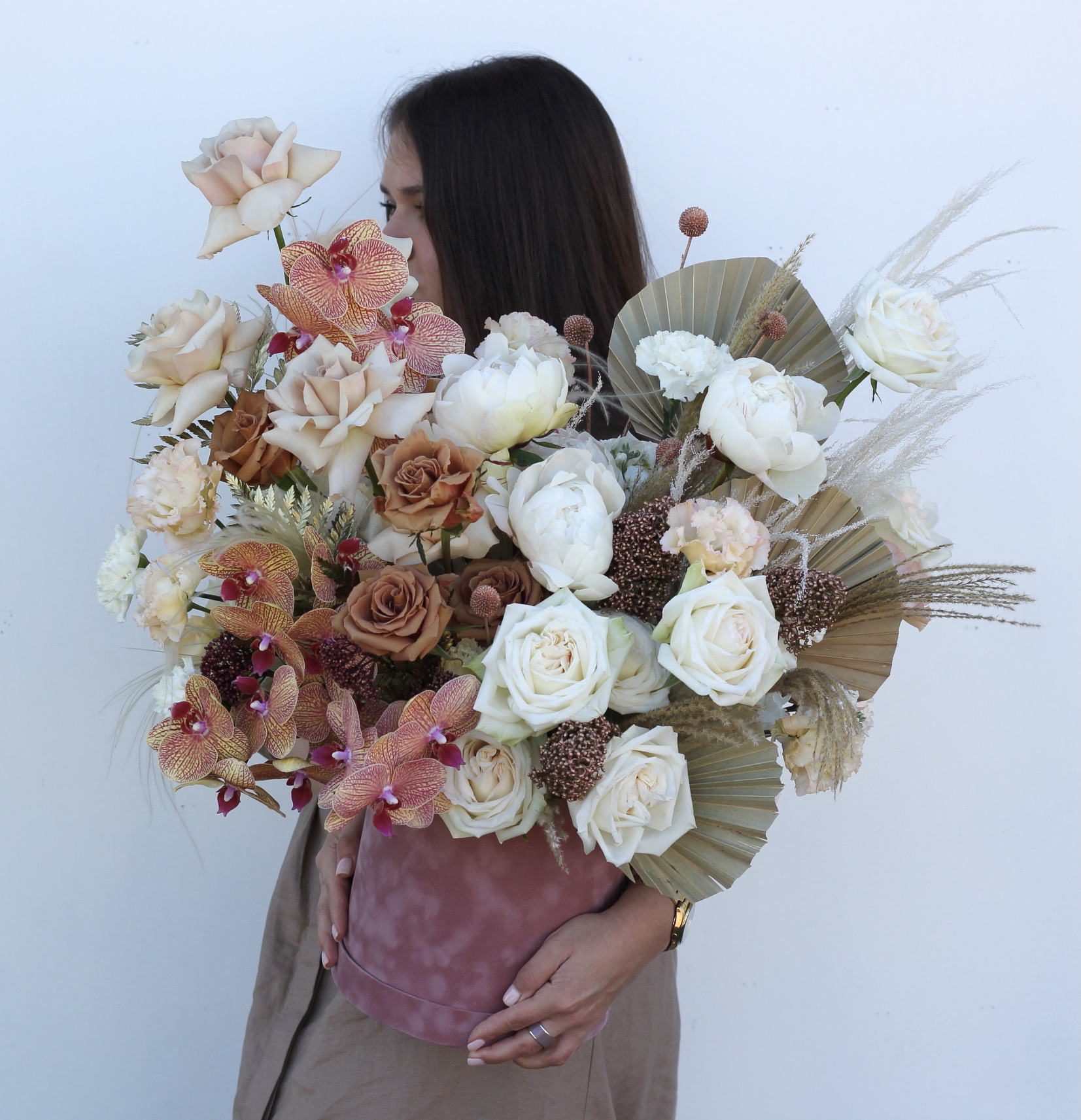 В составе: кофейные розы Тоффи, пионы, пионовидные розы Охара, пудровые розы Квик Сенд, эустома, орхидея фаленопсис, скимия, сухоцветы, листья пальмы.