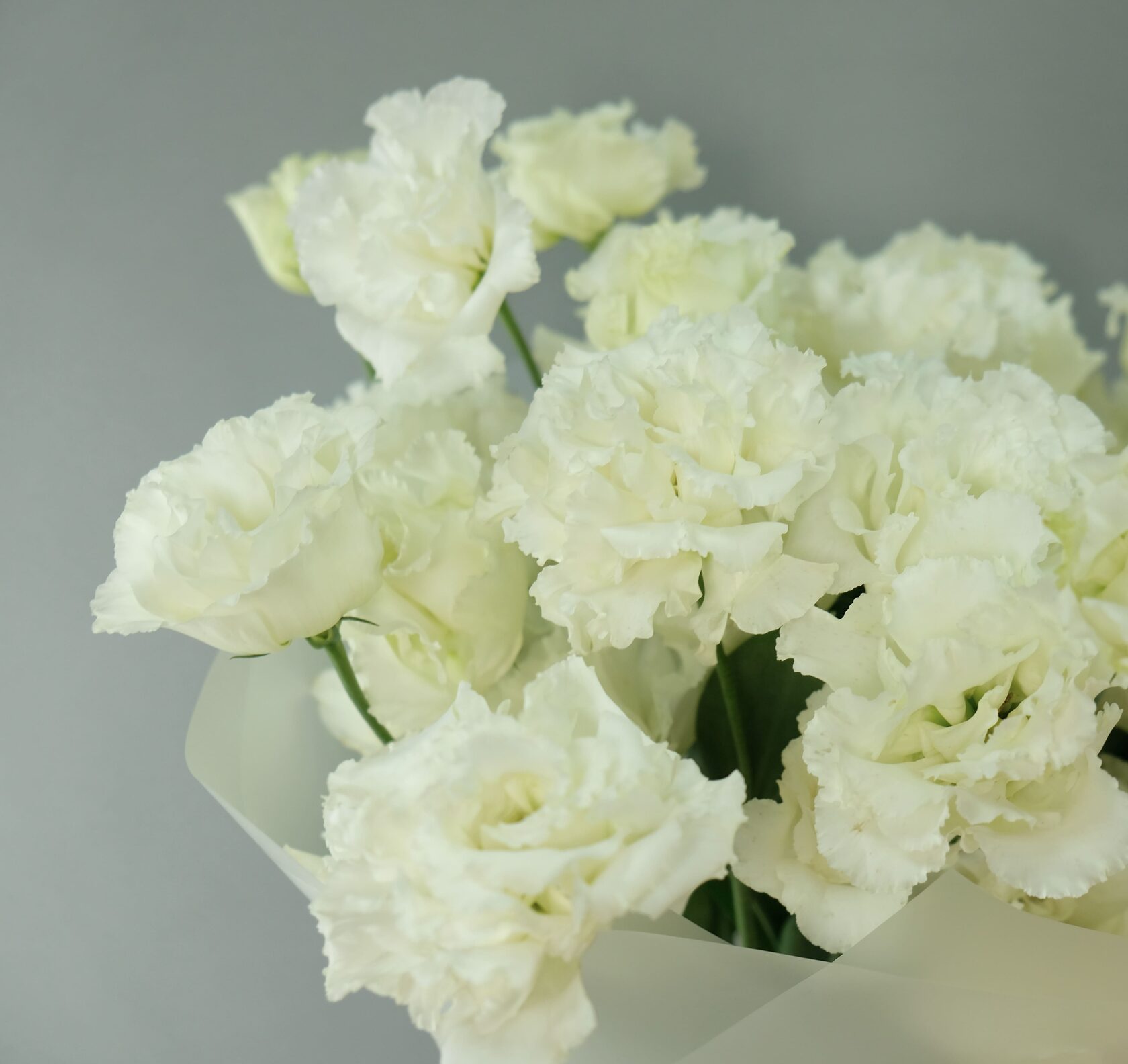 Воздушный монобукет из махровой эустомы кристально белого оттенка. Эустома - кустовой цветок, на одной веточке находится от 2 до 5 соцветий. Отличается особой стойкостью, очень стильно смотрится в вазе и украсит любой интерьер.