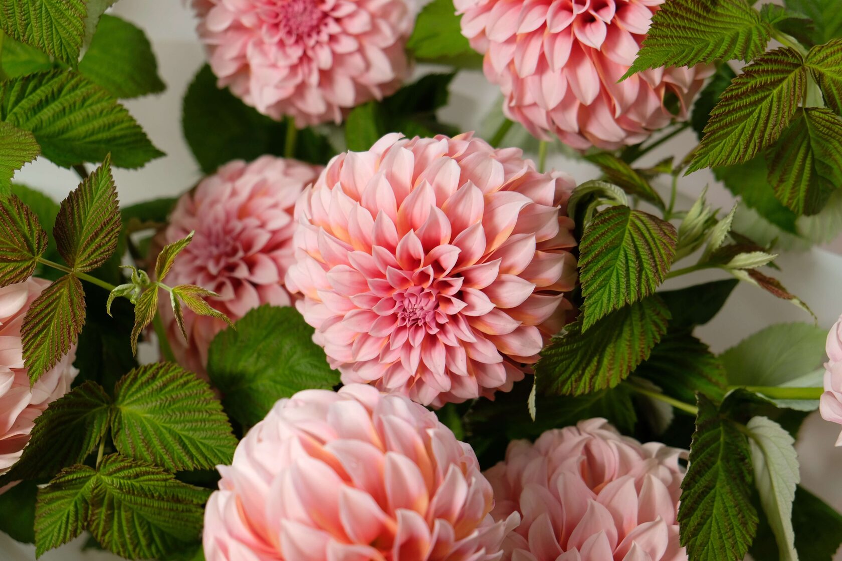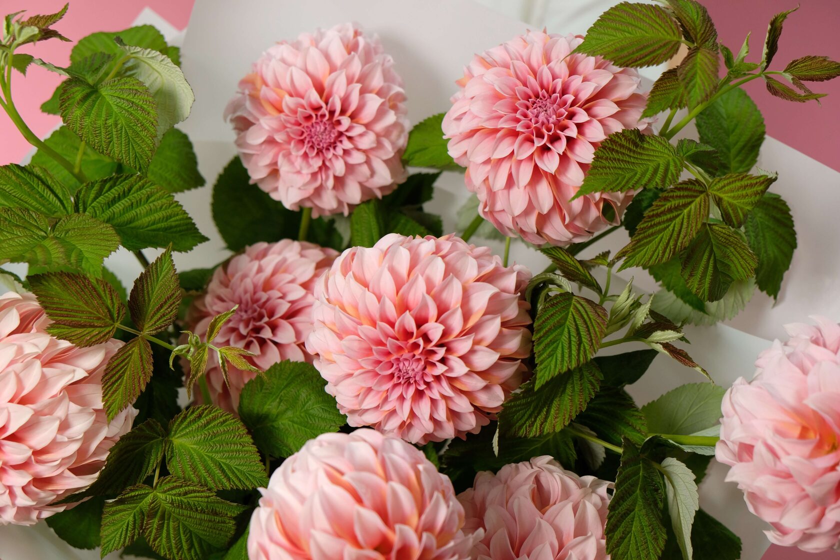 Монобукет из волшебных сортовых георгинов ссезонными веточками малины.
