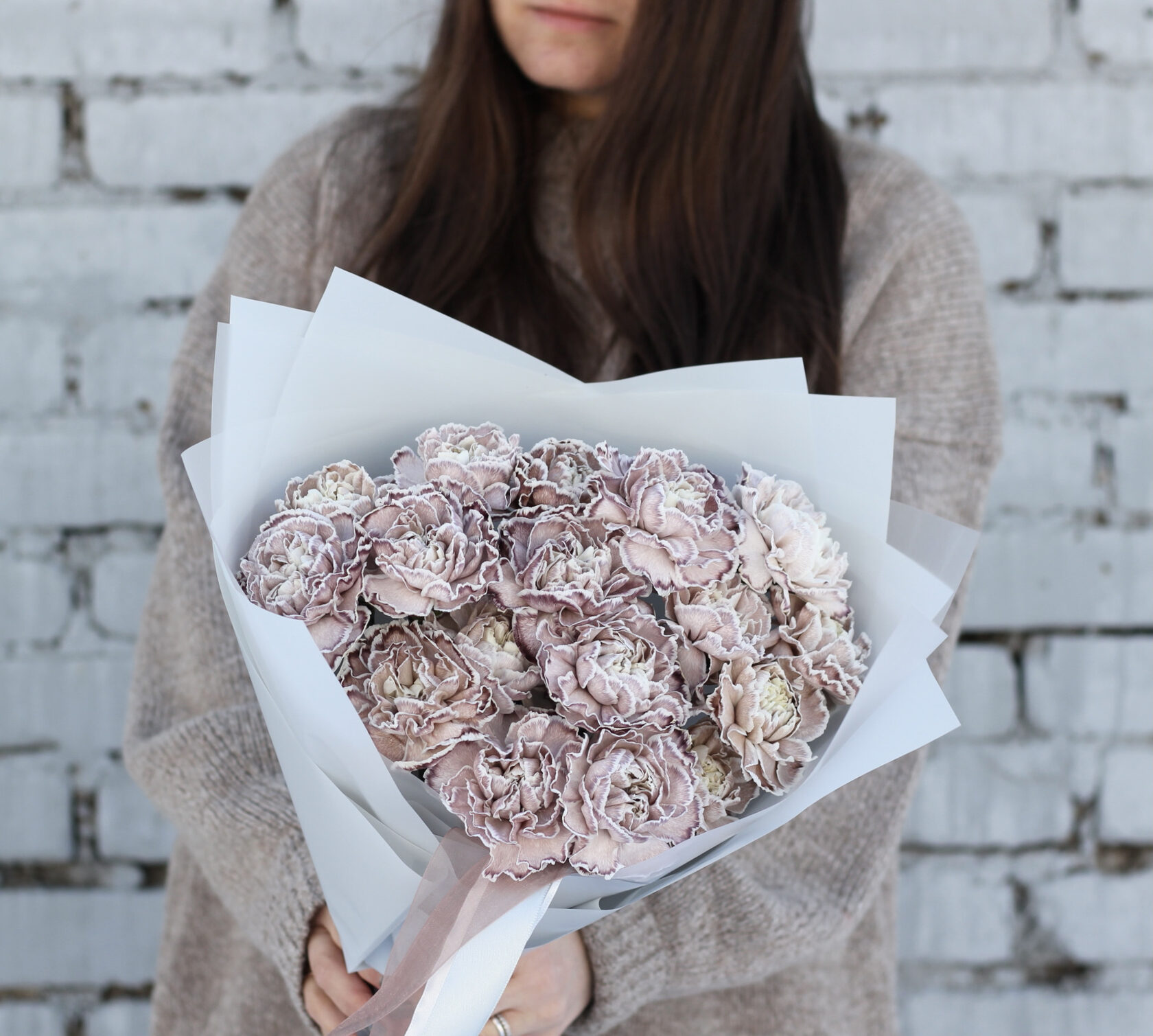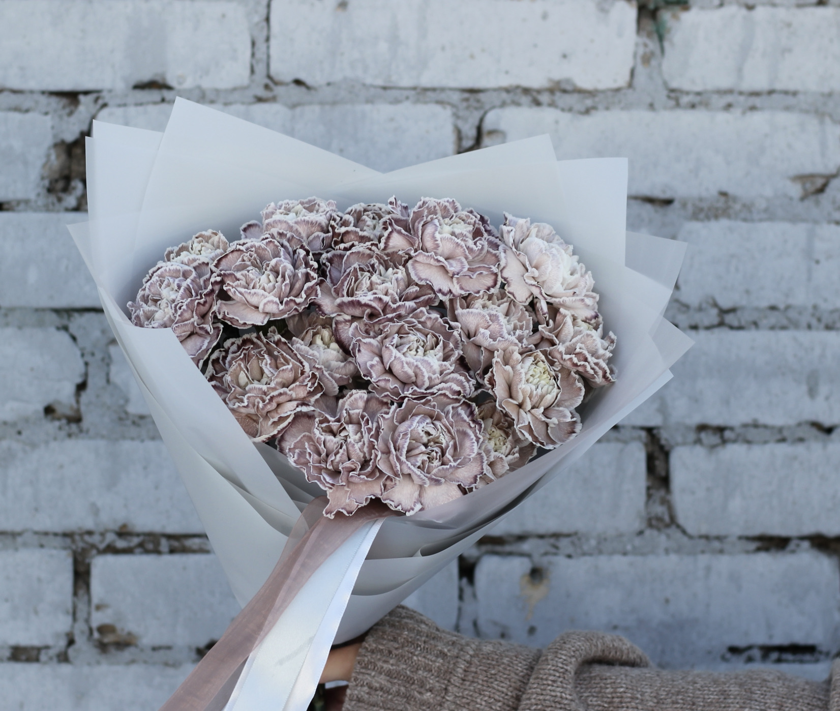 Монобукет из крашеных диантусов невероятного кофейного оттенка с завораживающими прожилками. Идеально впишется в любой интерьер и точно произведет впечатление на эстета. Диантусы обладают хорошей стойкостью и легким ароматом.