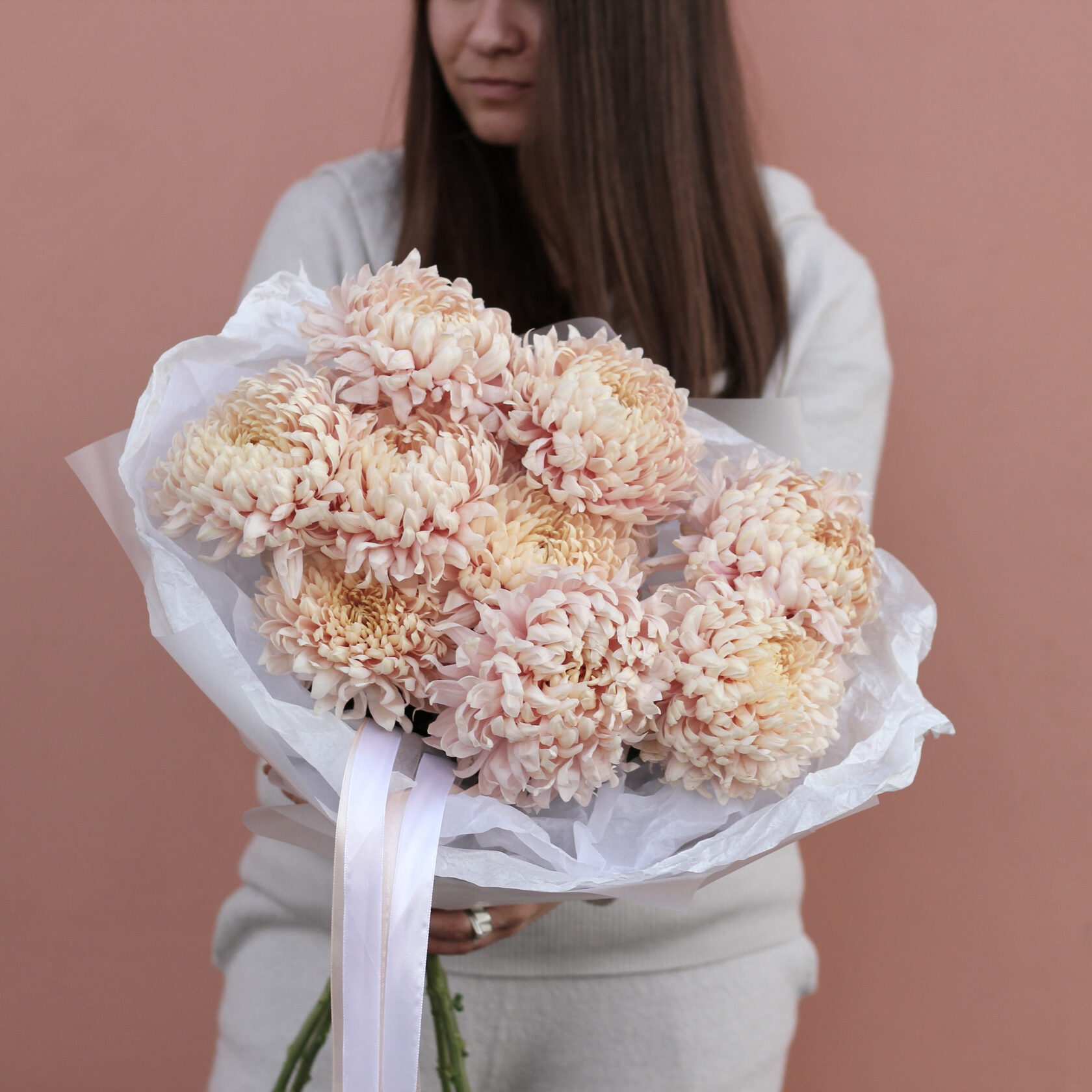 Монобукет из сортовых лососевых хризантем.