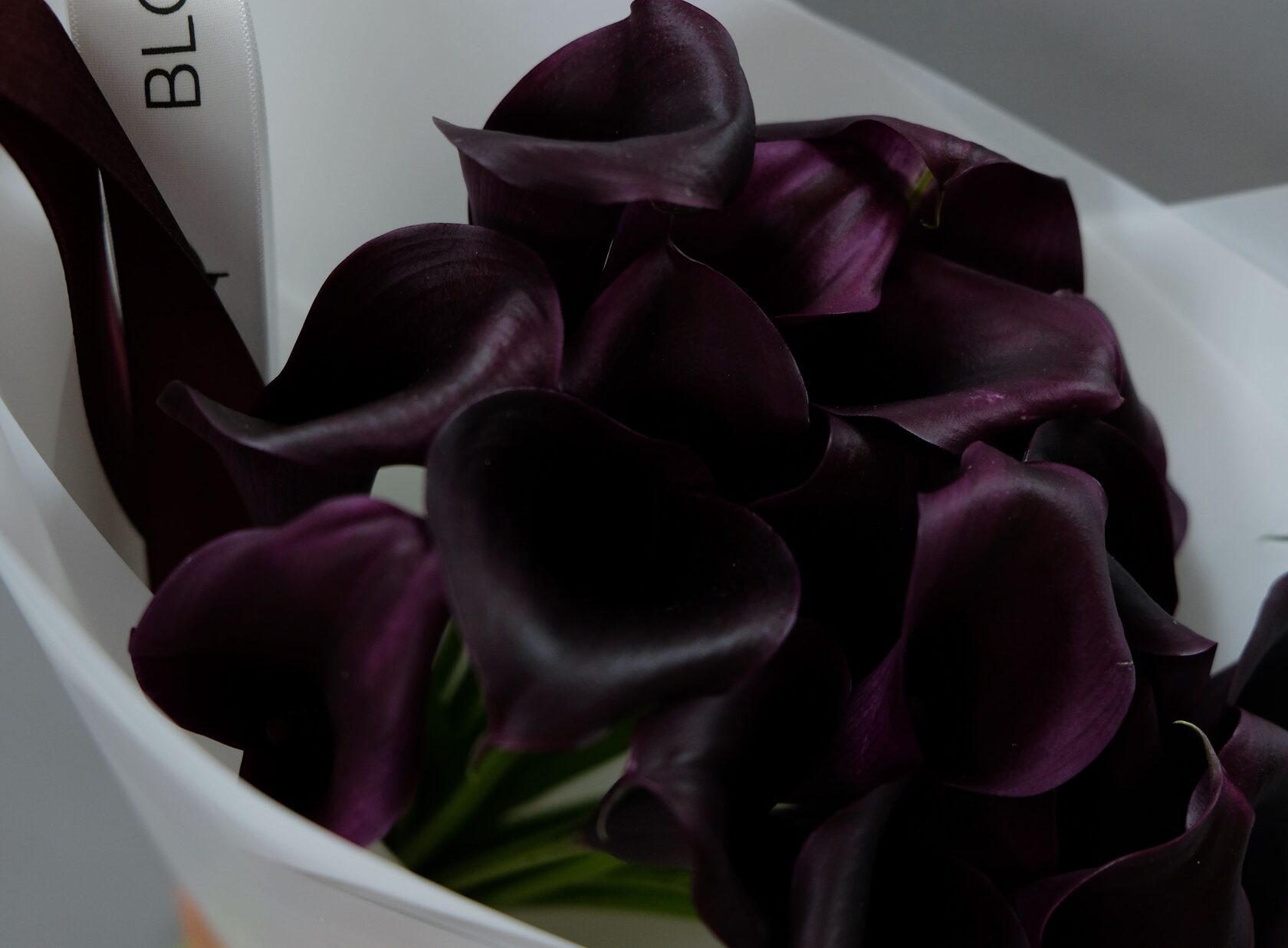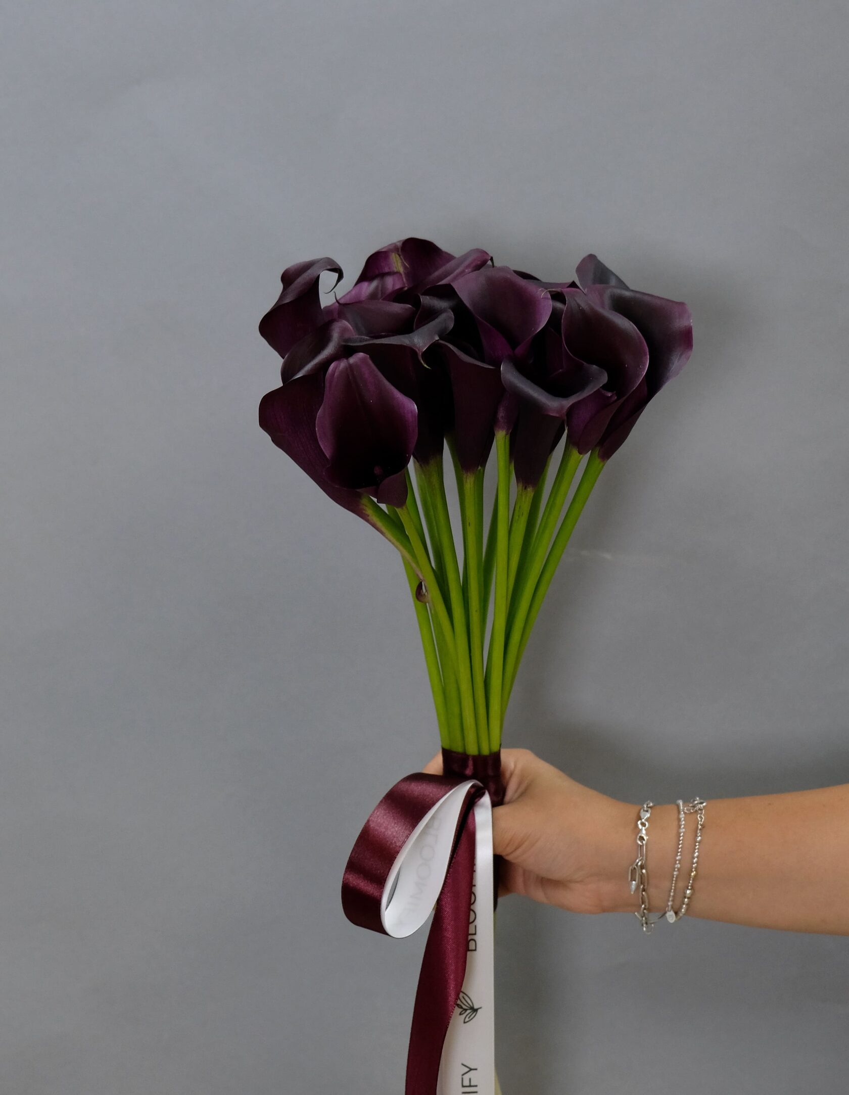 Монобукет из элегантных черничных калл. Утонченные, минималистичные и невероятно стильные. Упаковка может быть изменена по Вашему запросу.
