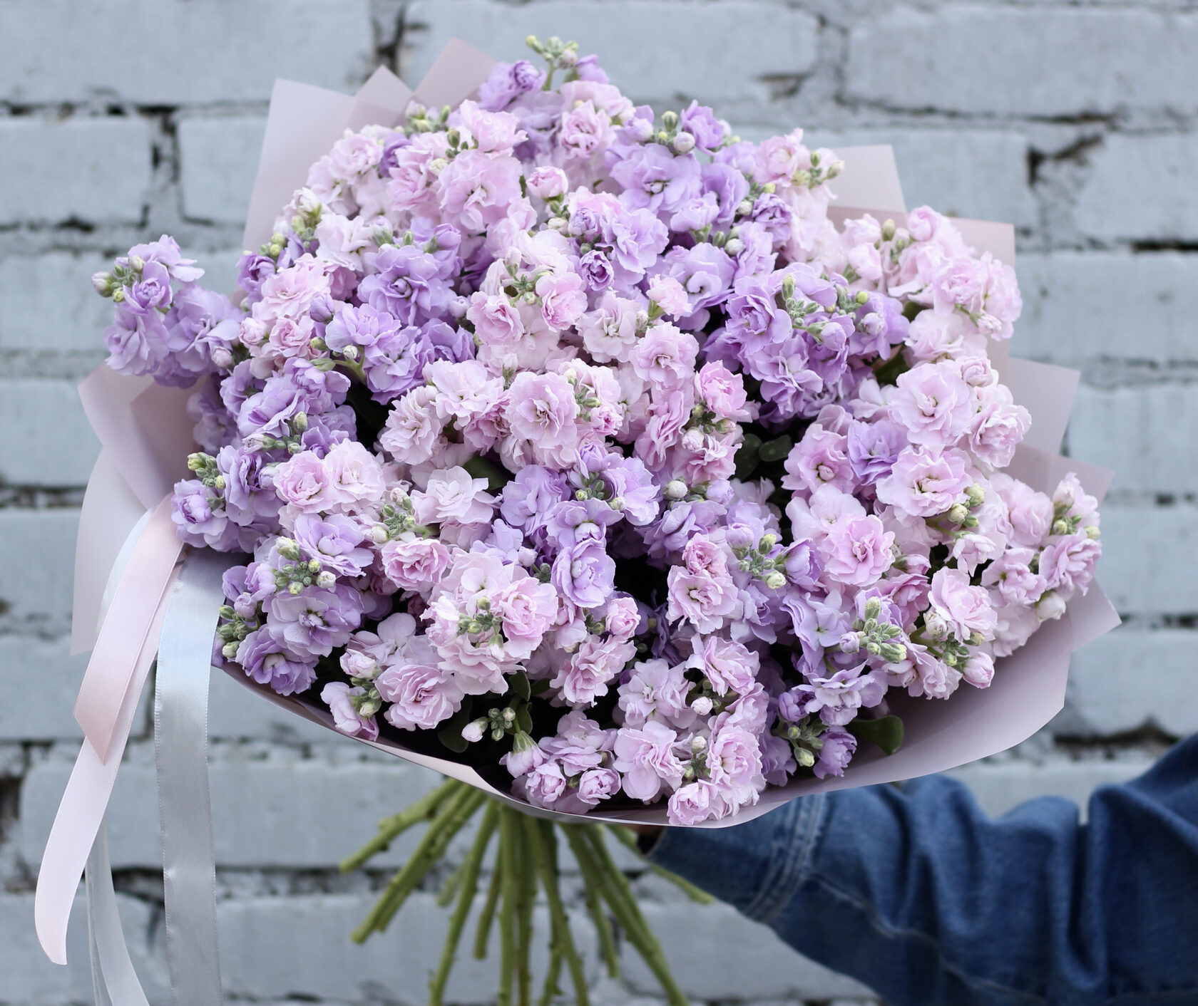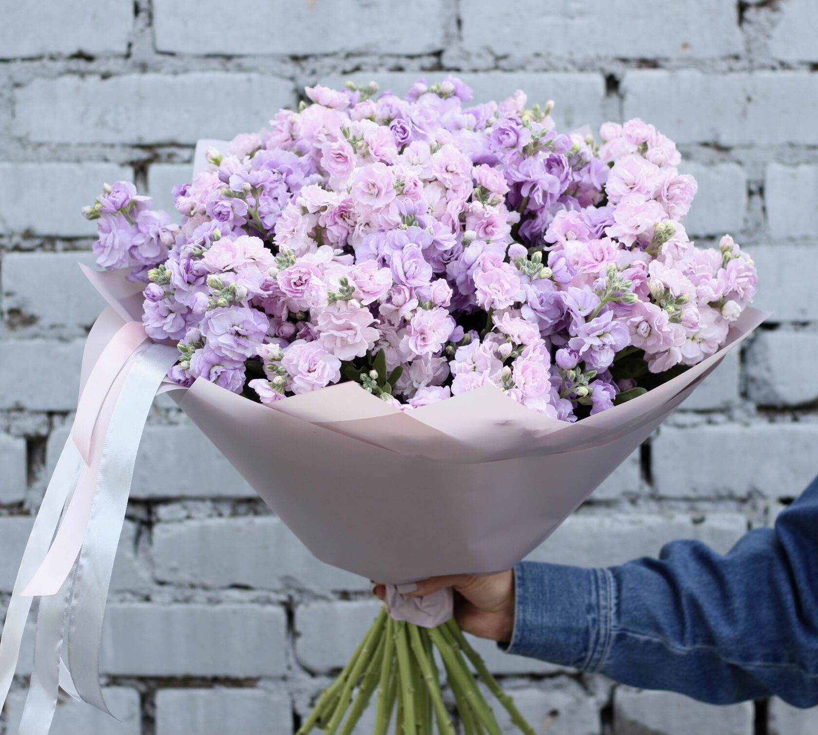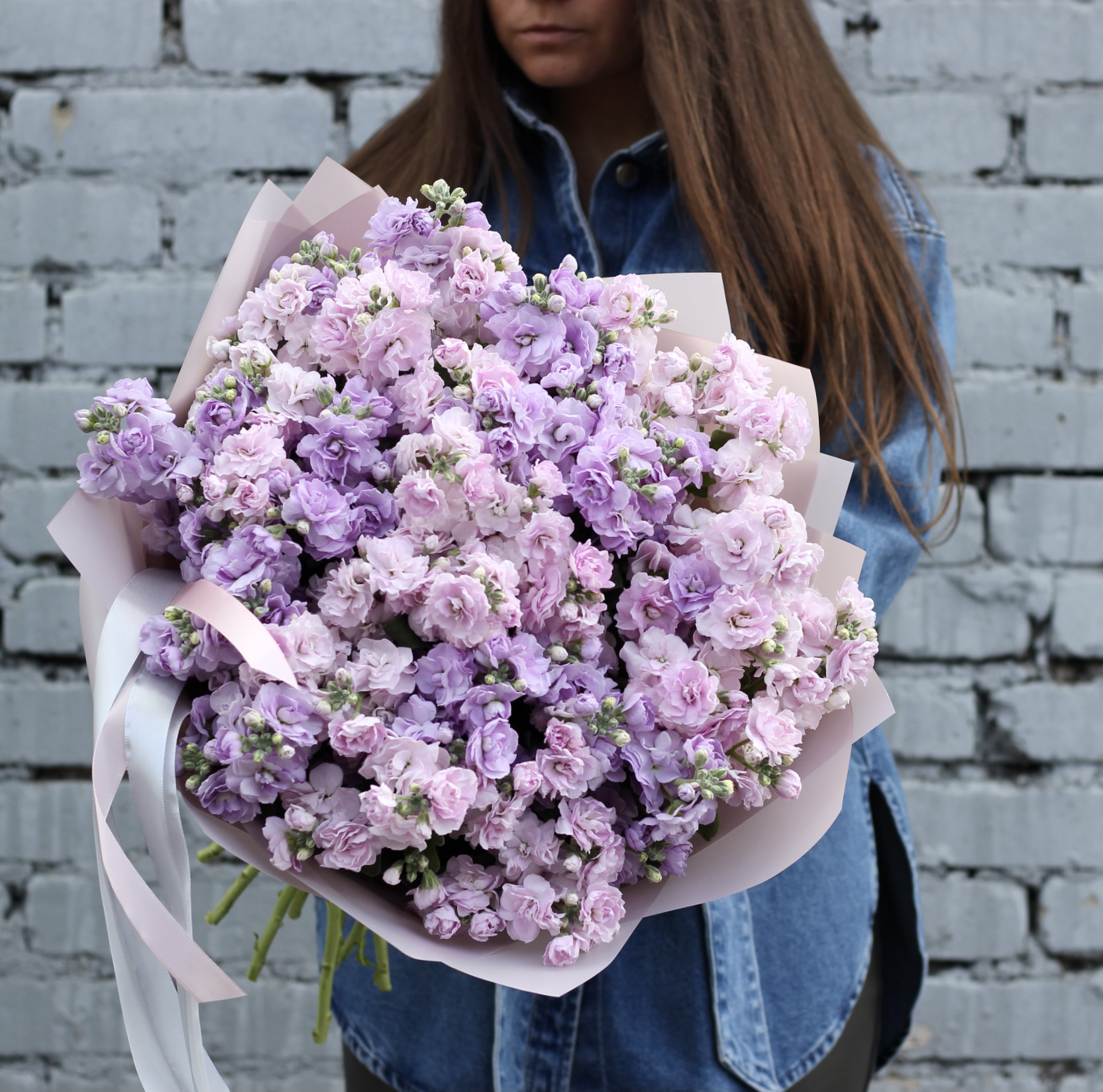 Монобукет из ароматной кустовой маттиолы лавандового и белого оттенка.