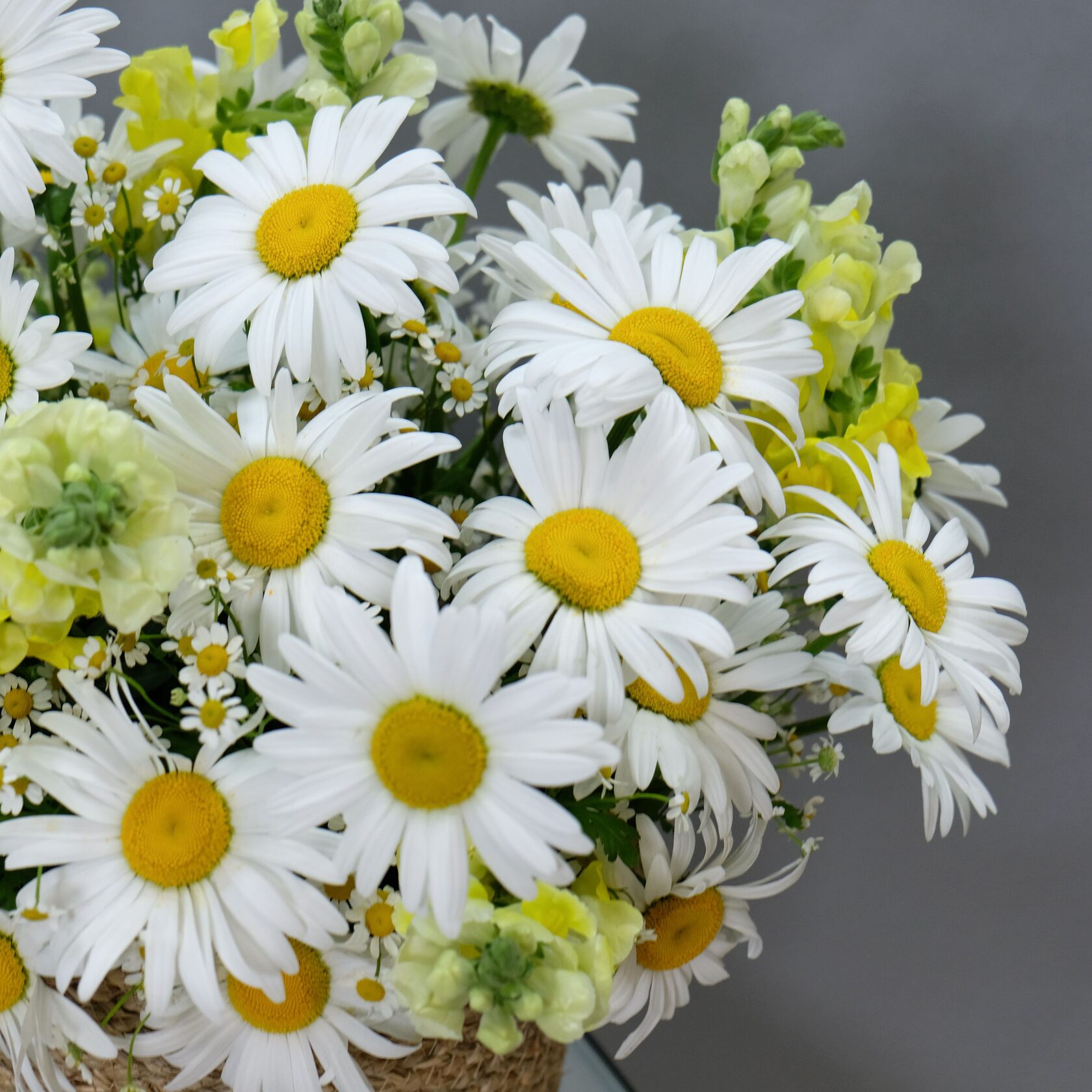 В составе: сортовые одноголовые ромашки, ромашки танацетум, антирринум.