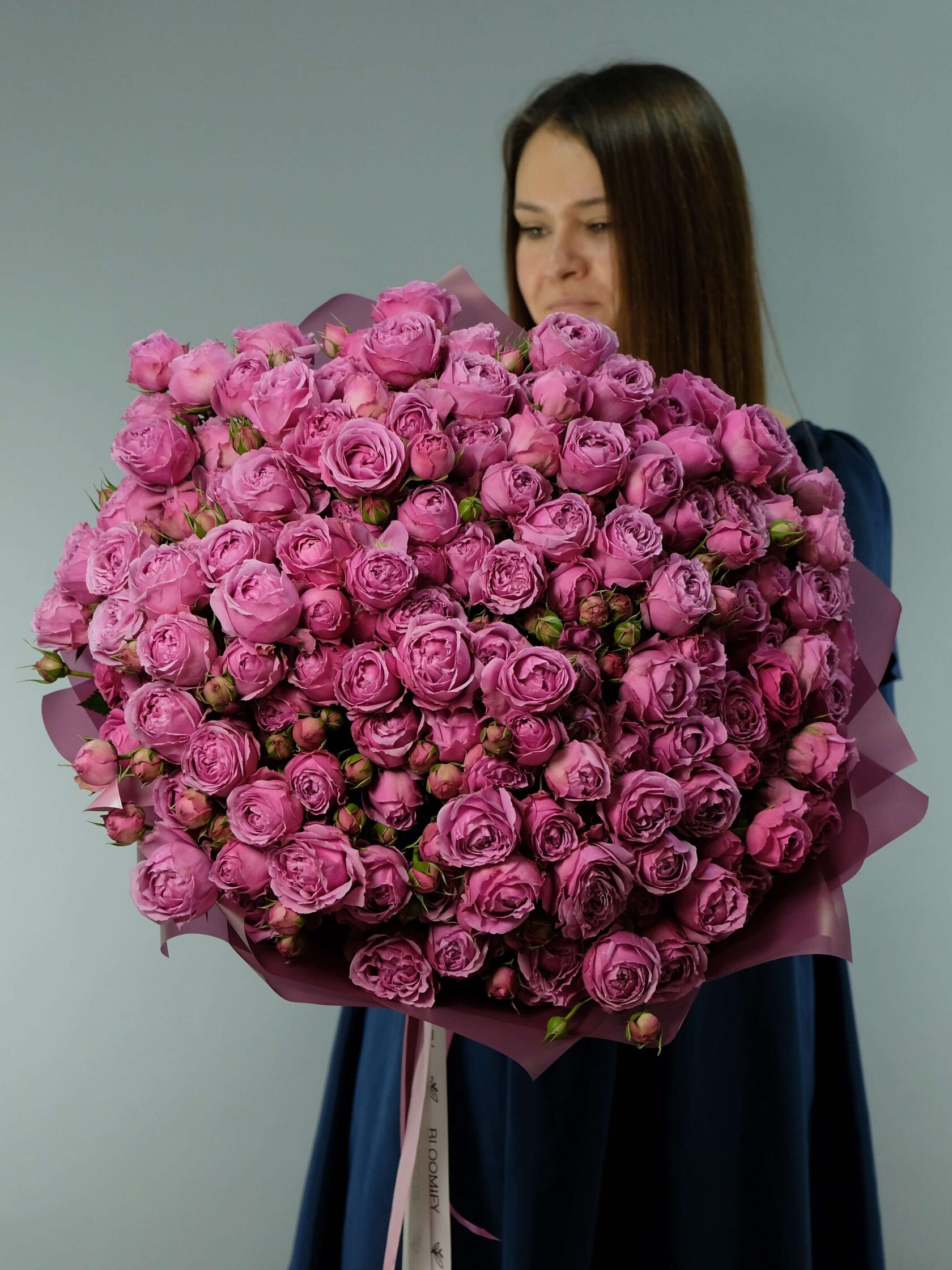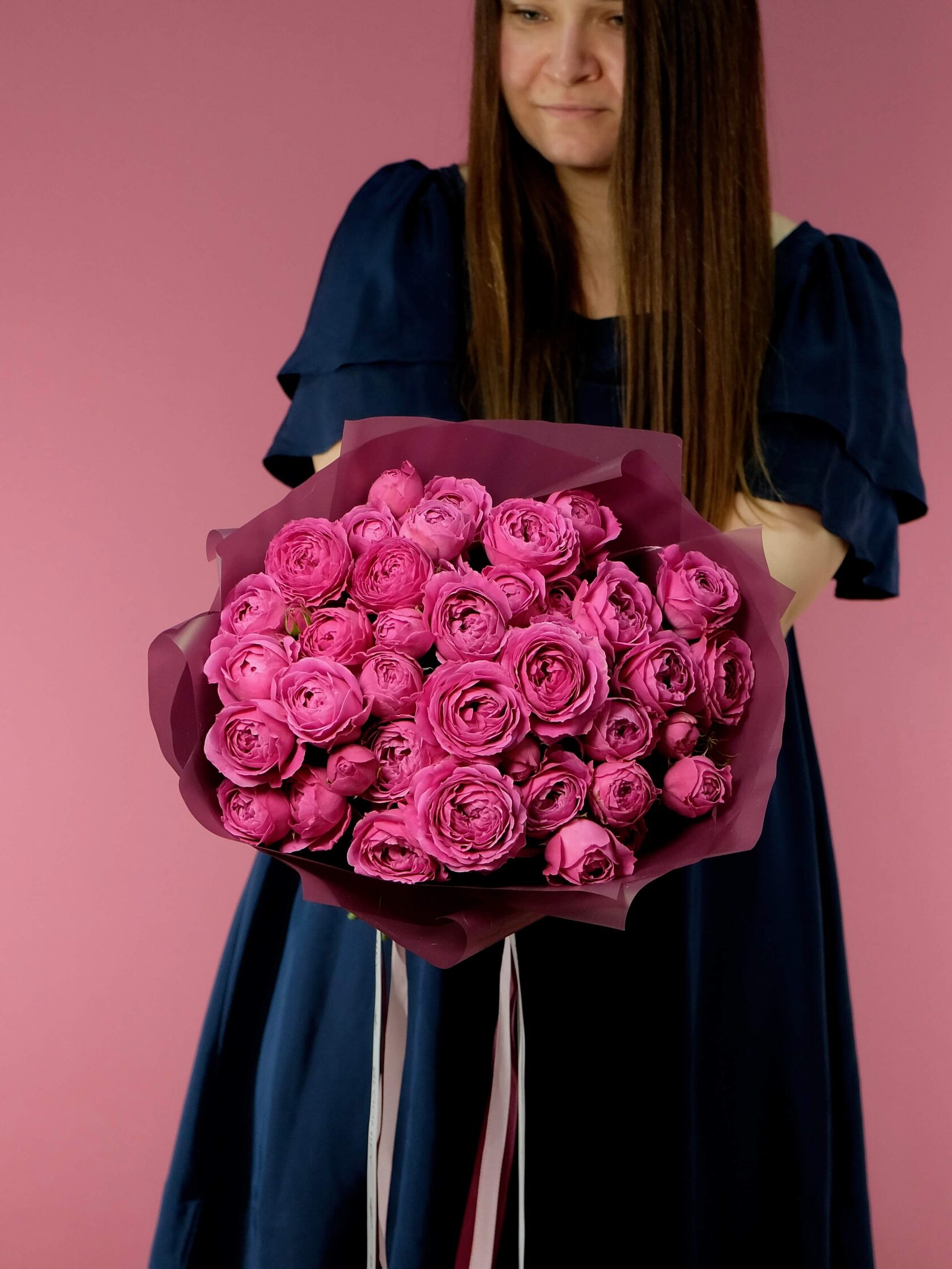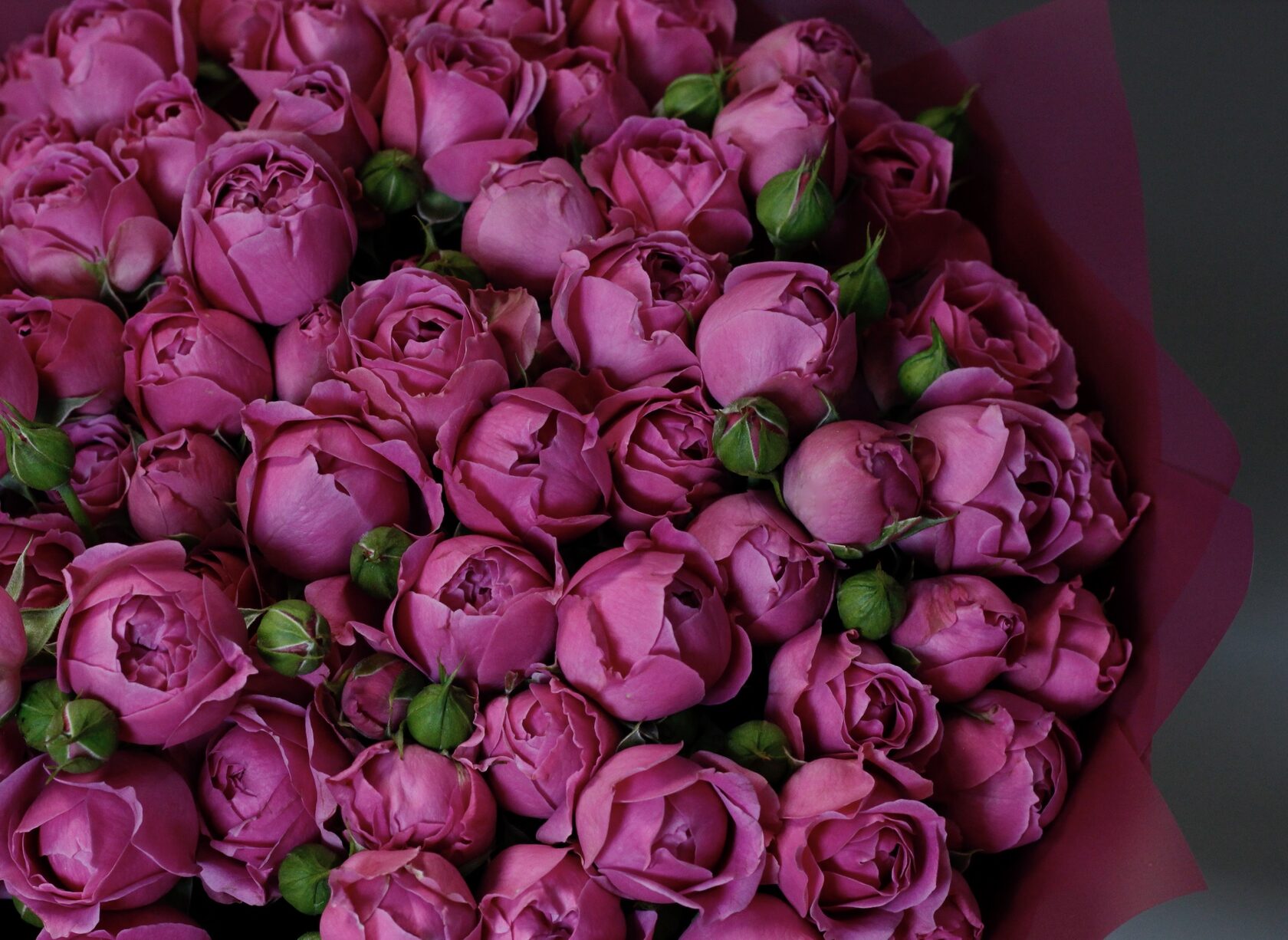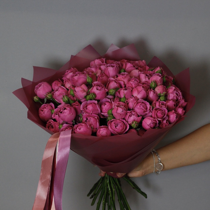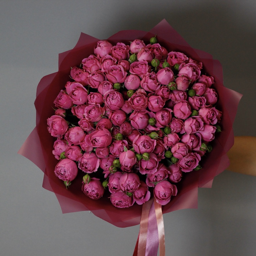 Монобукет из ароматных пионовидных кустовых роз Мисти Баблзнасыщенного оттенка фуксии