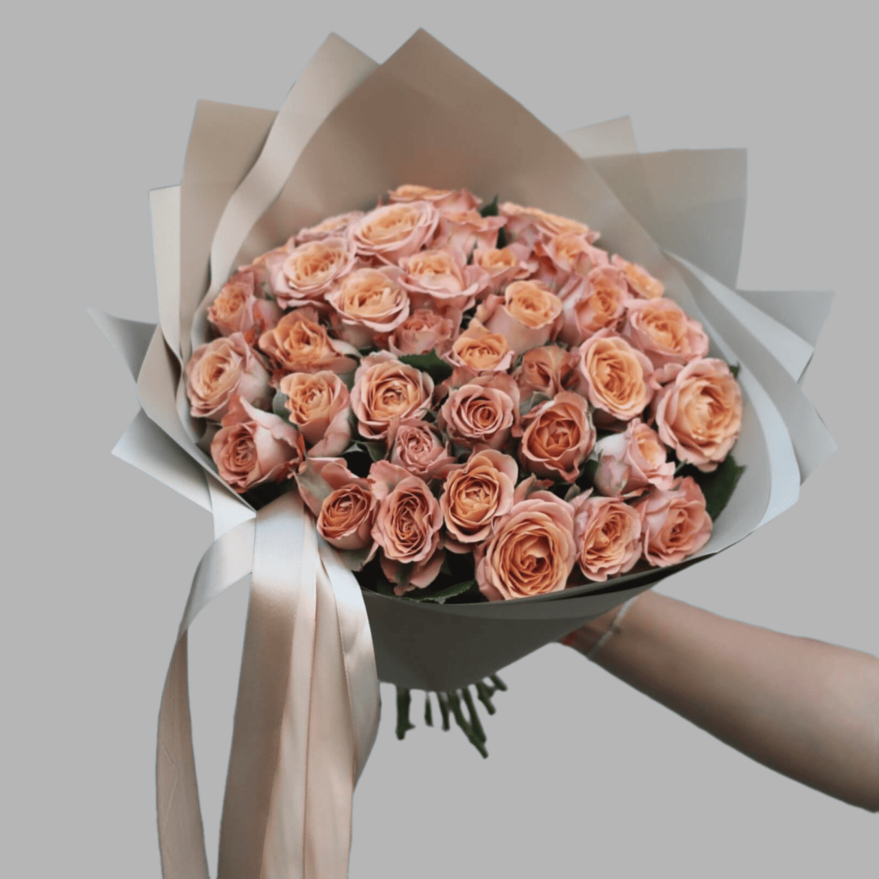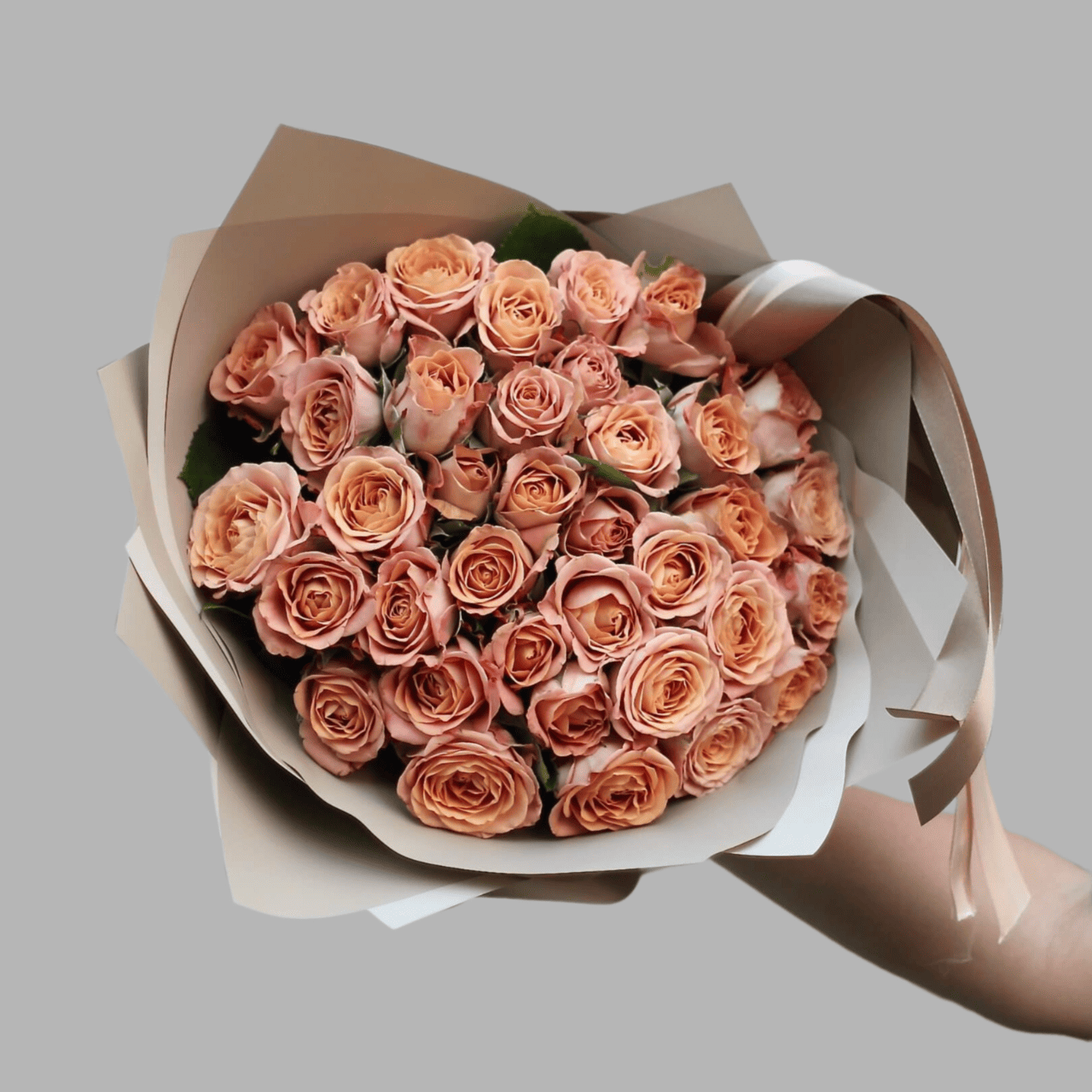 Монобукет из кофейных роз сорта Капучино теплого кофейного оттенка.