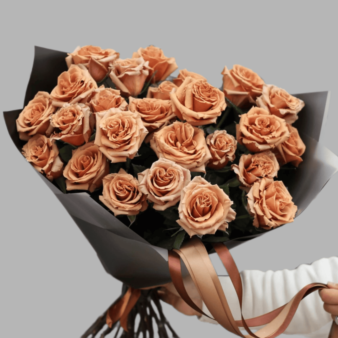 Монобукет из восхитительных кофейных роз сорта Тоффи в темной матовой упаковке. Элегантный оттенок и завитки бутонов этих пионовидных роз абсолютно точно произведут впечатление!