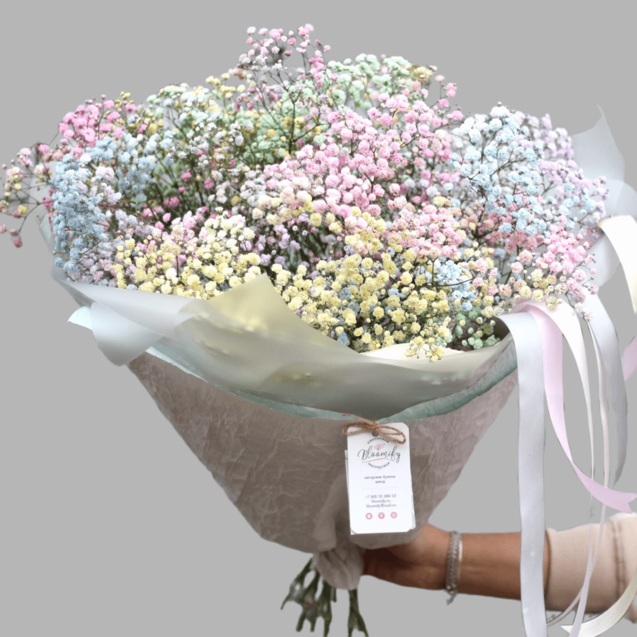 Монобукет из воздушной радужной гипсофилы, абсолютный тренд вот уже несколько сезонов. Гипсофила неприхотлива в уходе и с течением времени не увядает, а красиво высыхает, сохраняя свой вид.