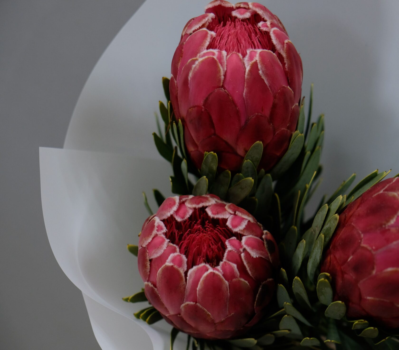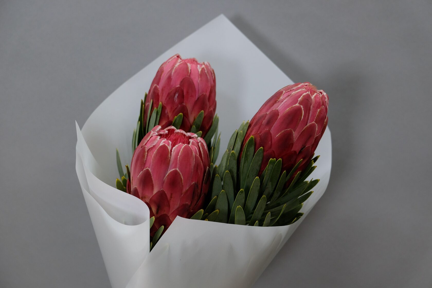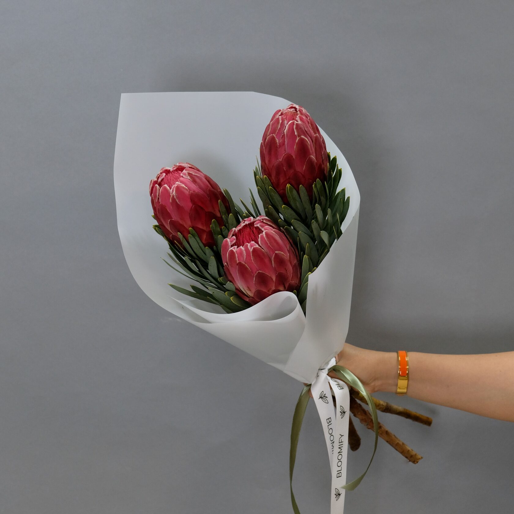 Букет из экзотических восхитительных африканских протей. Очень стойкий букет - протея может сохранять свежесть около двух недель, а после высыхания не теряет яркость цвета и форму, поэтому очень красиво смотрится в интерьере.