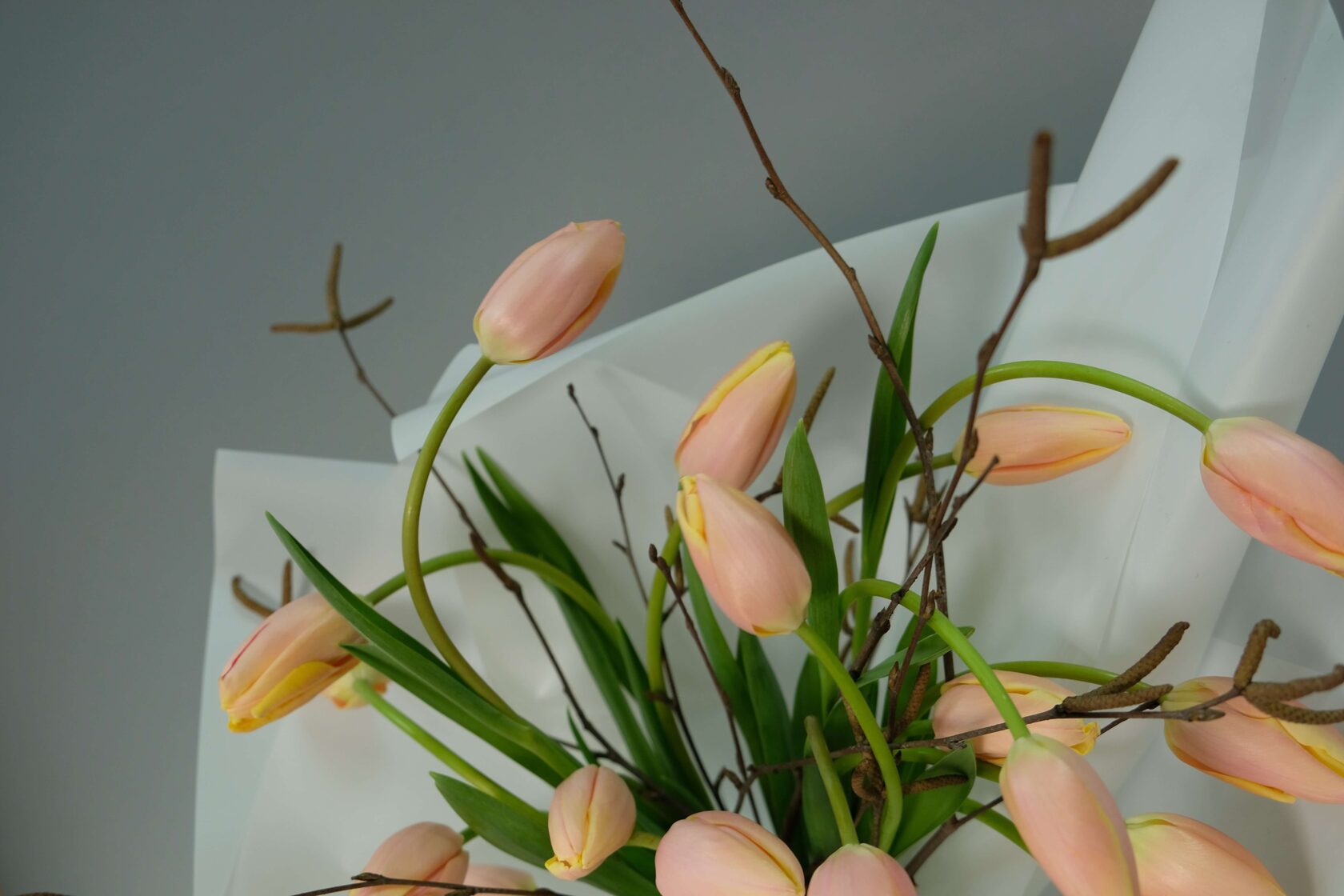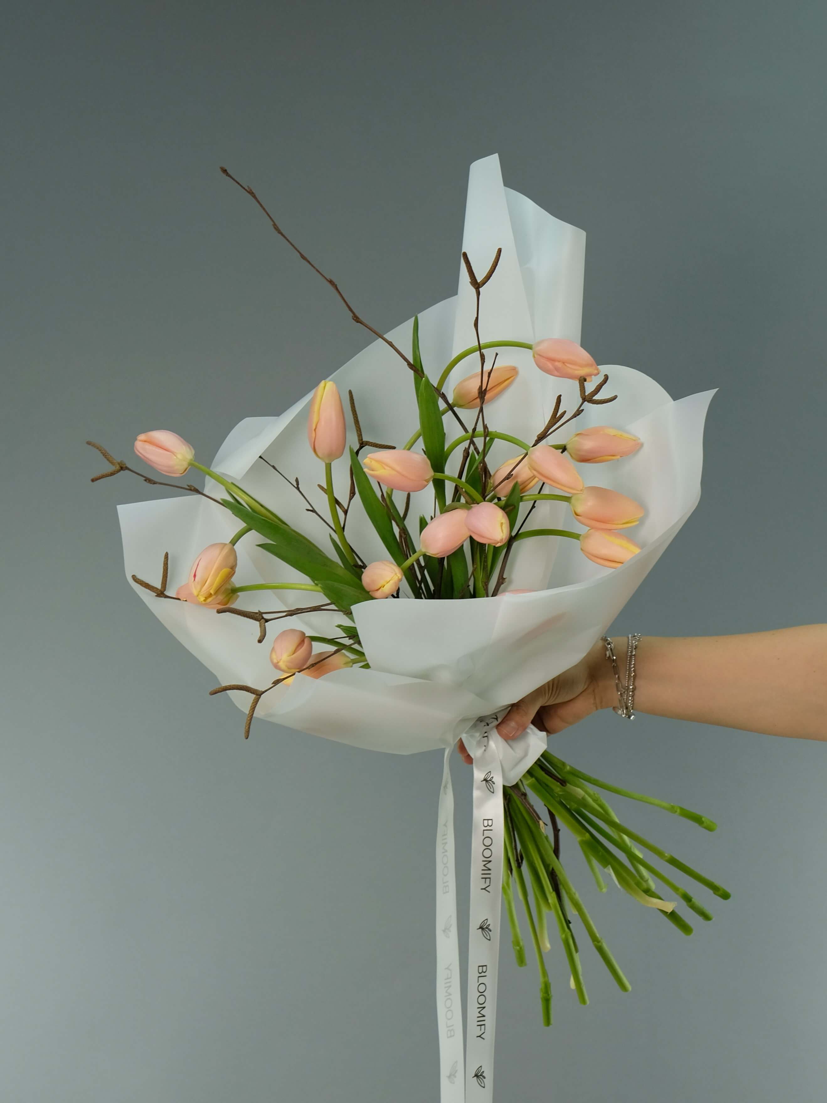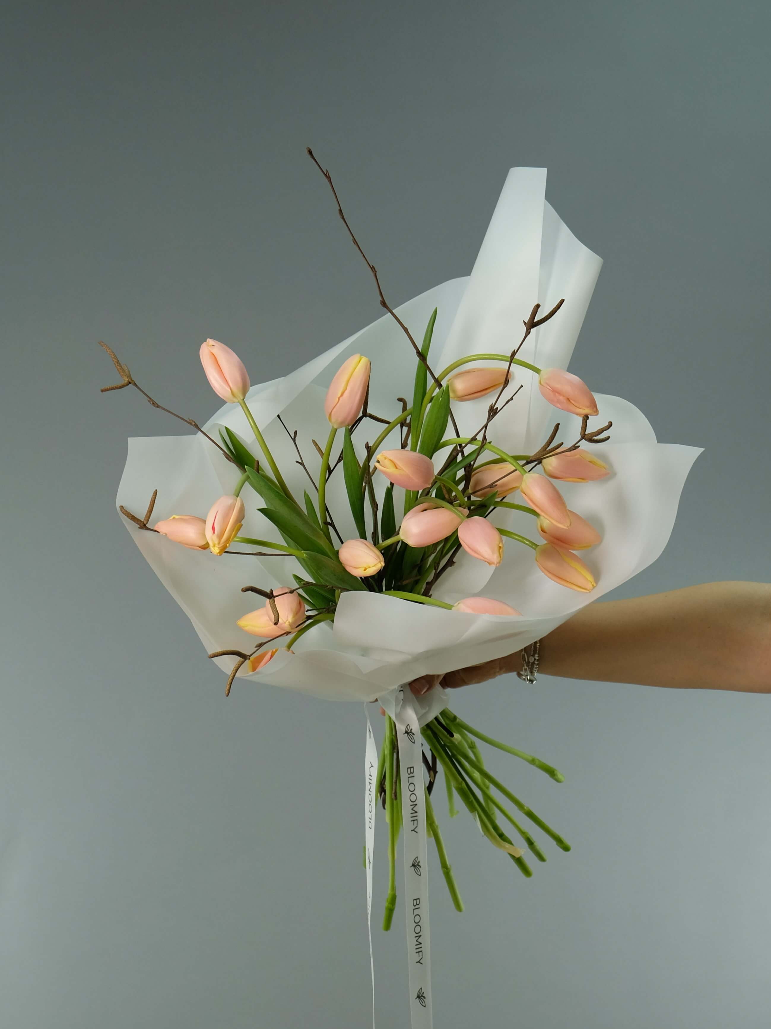 Комбо из невероятных лососевых тюльпанов Бутс и декоративных весенних веток. Идеален для вашего интерьера.