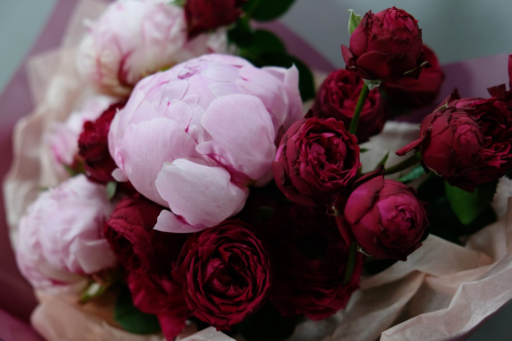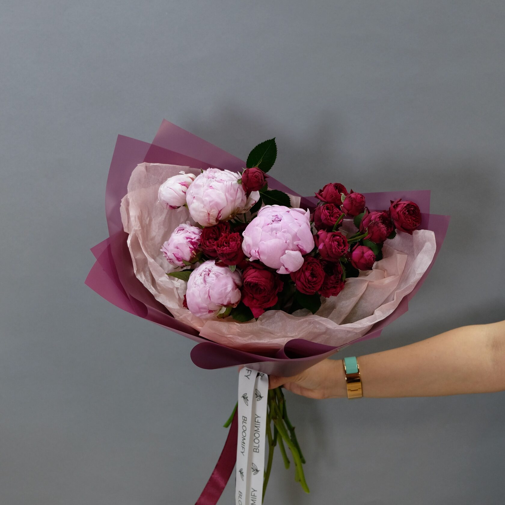 В составе: нежно-розовые пионы, винные пионовидные розы