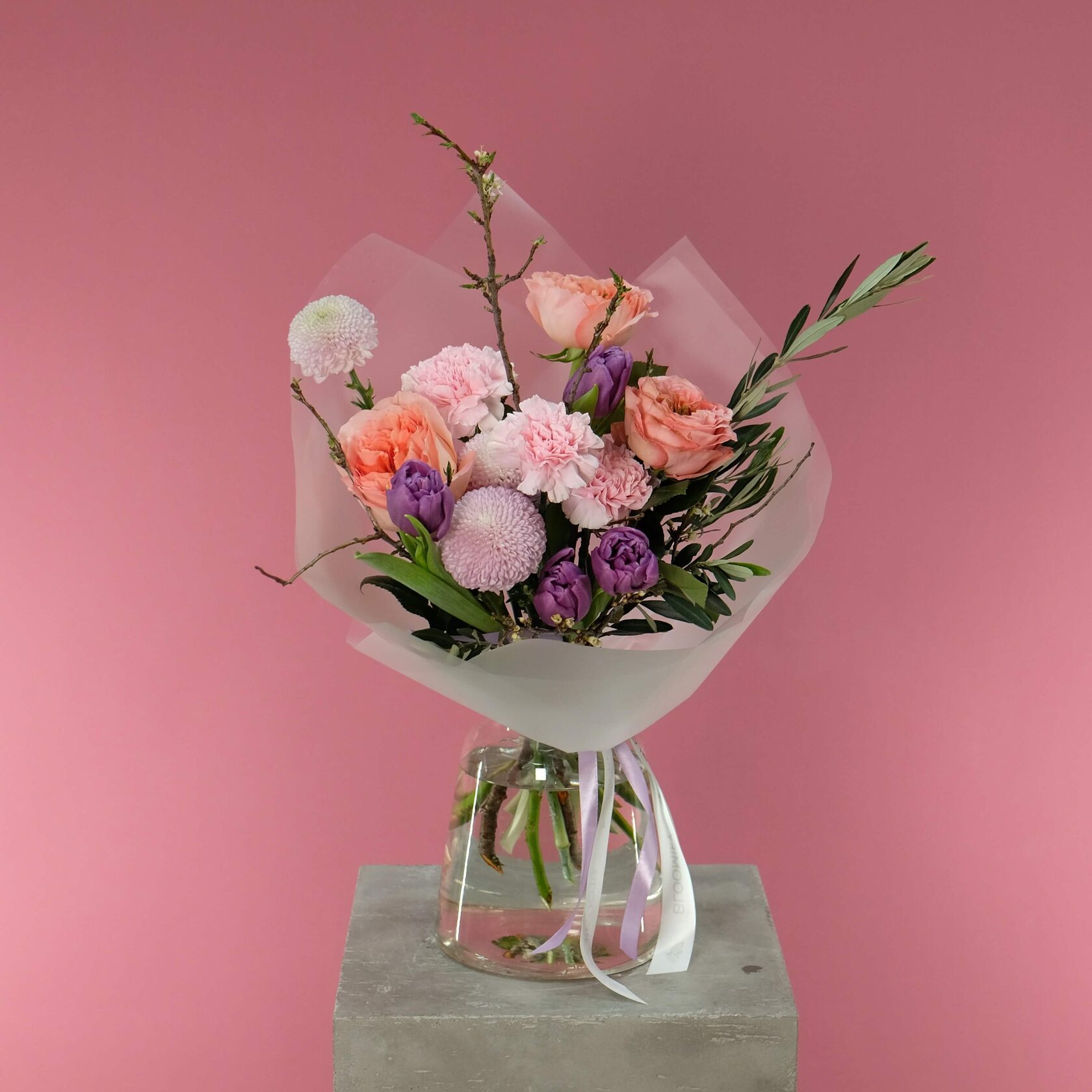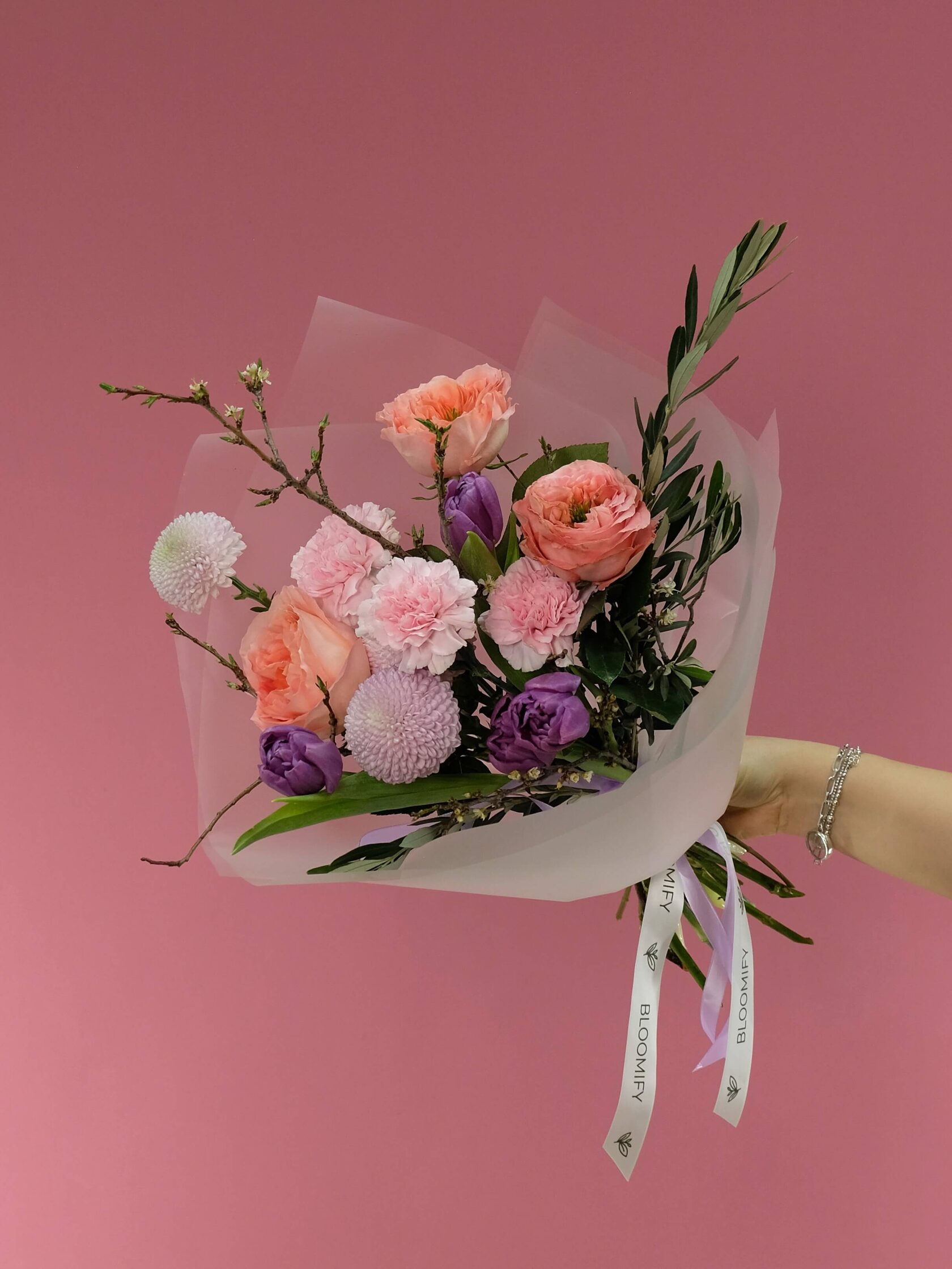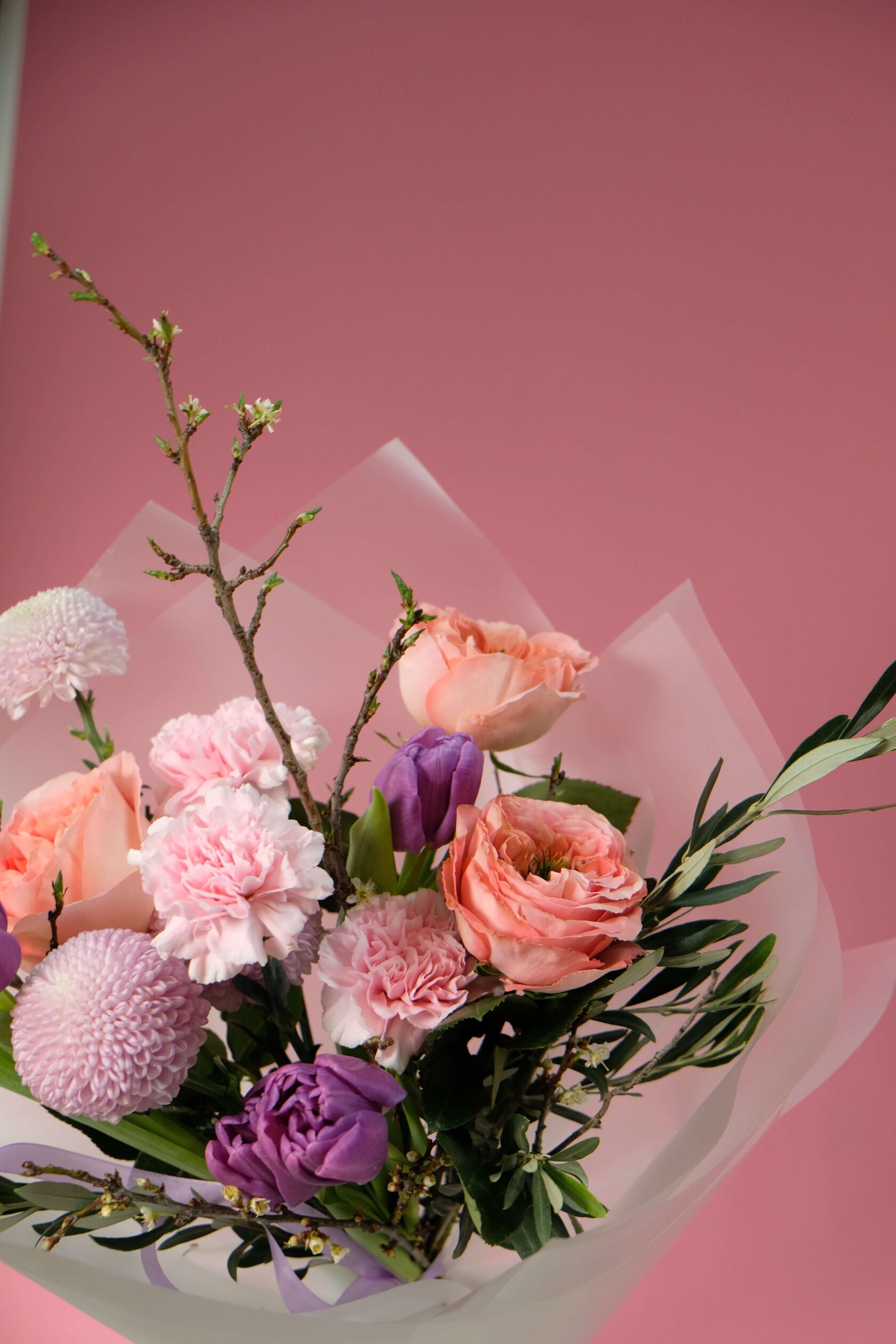 В составе: пионовидные розы, диантусы, хризантему Момоко, пионовидные тюльпаны, ветки