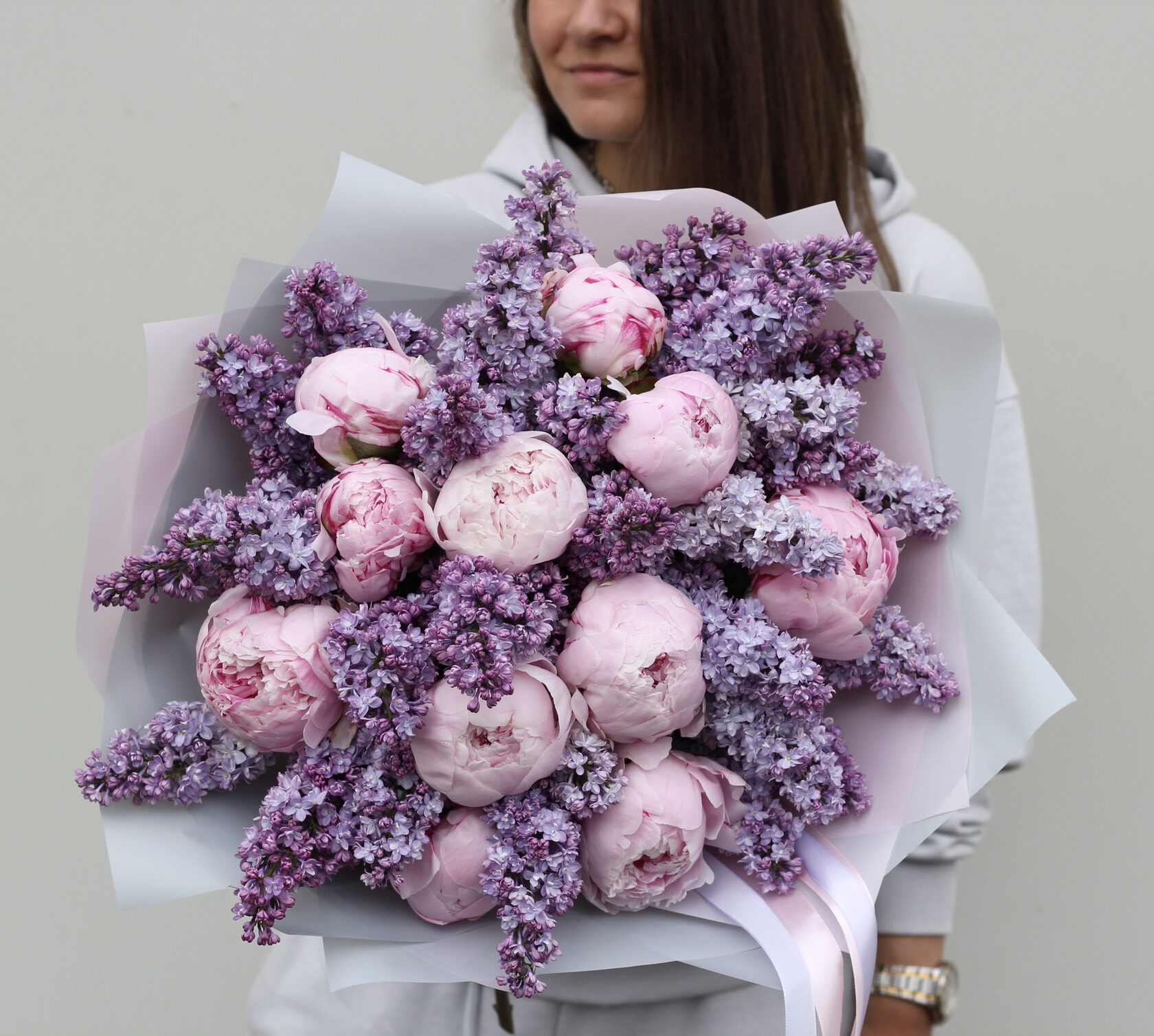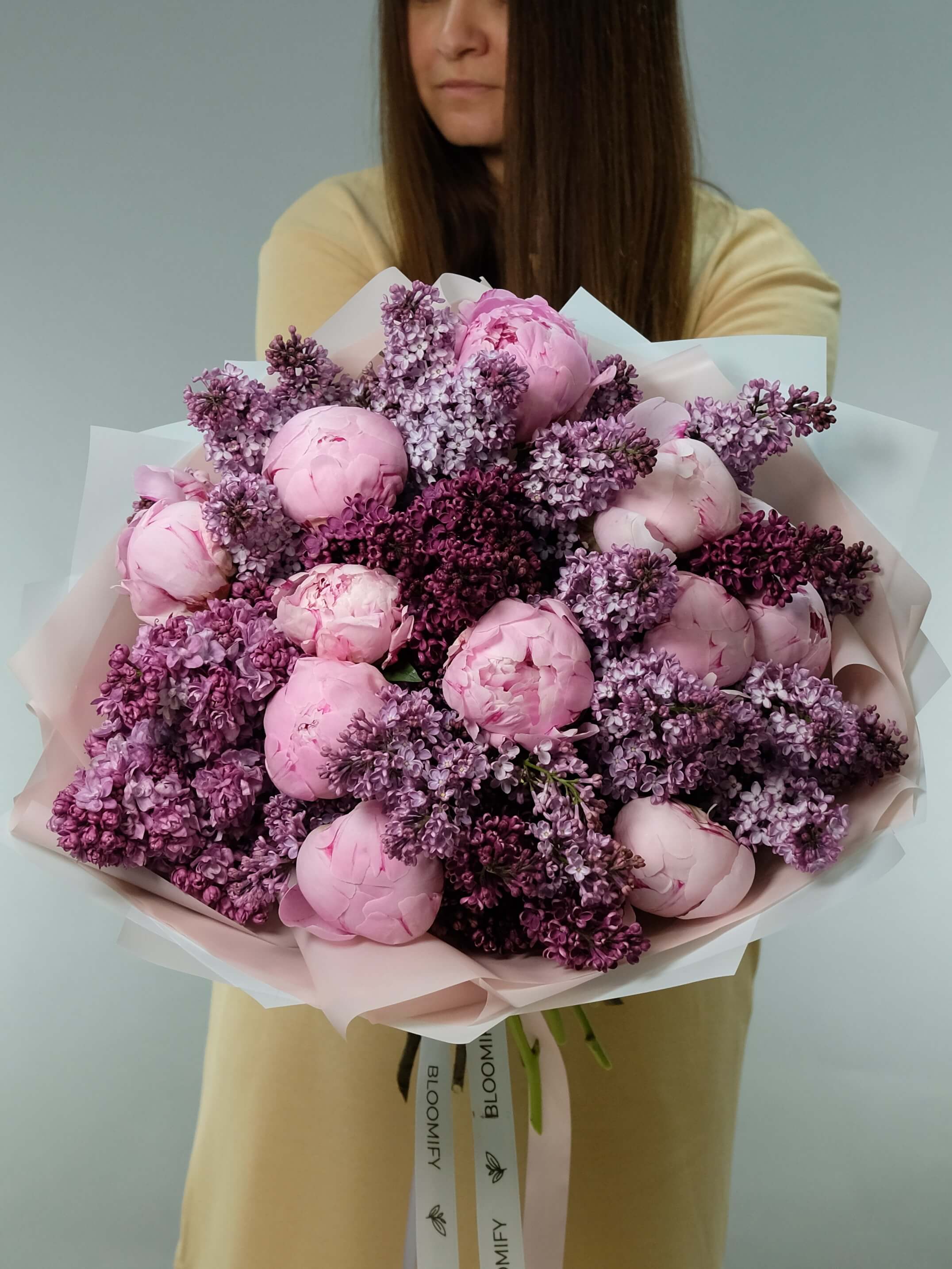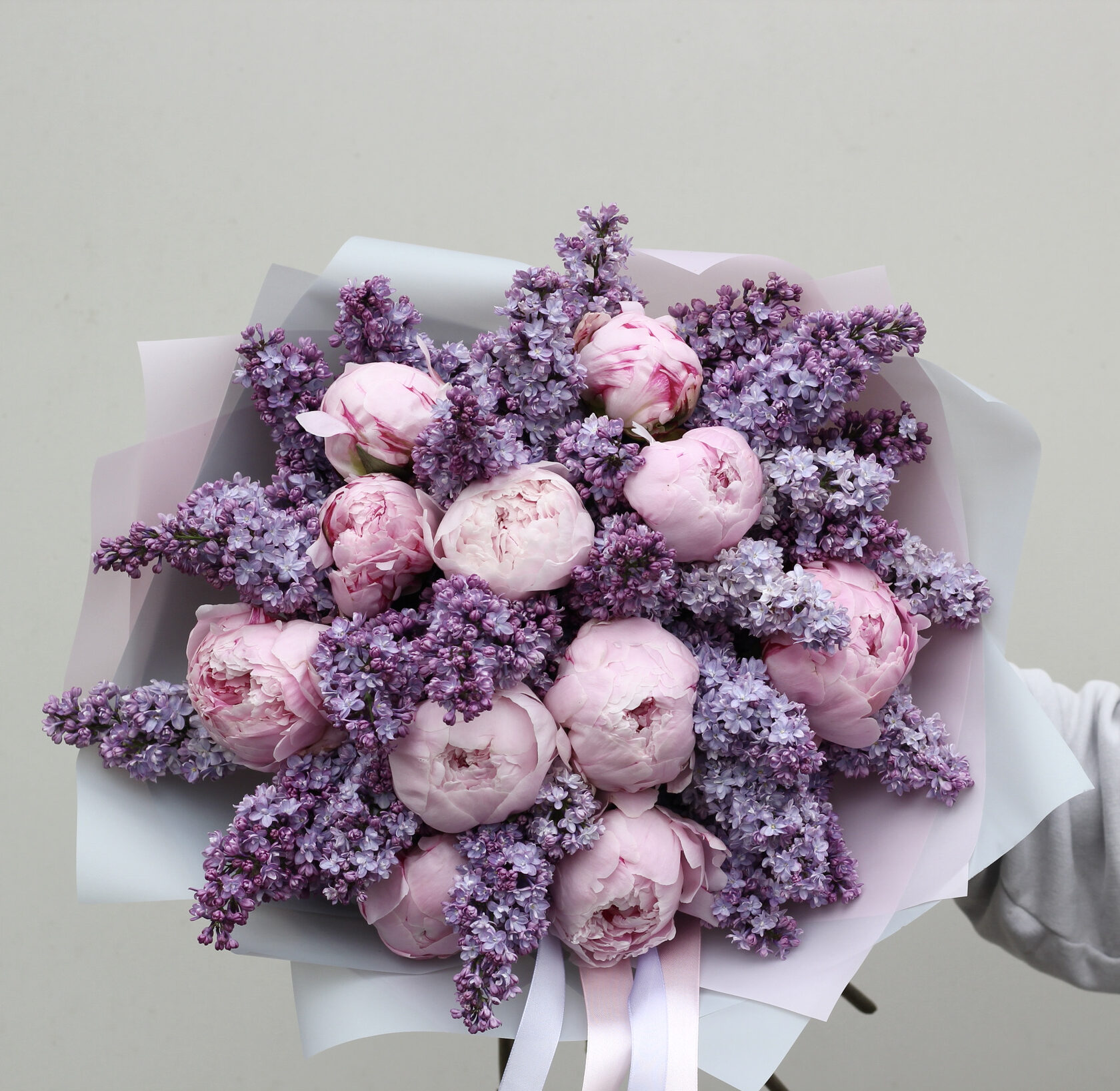 Дуобукет из нежнейших пионов и ароматной сирени.