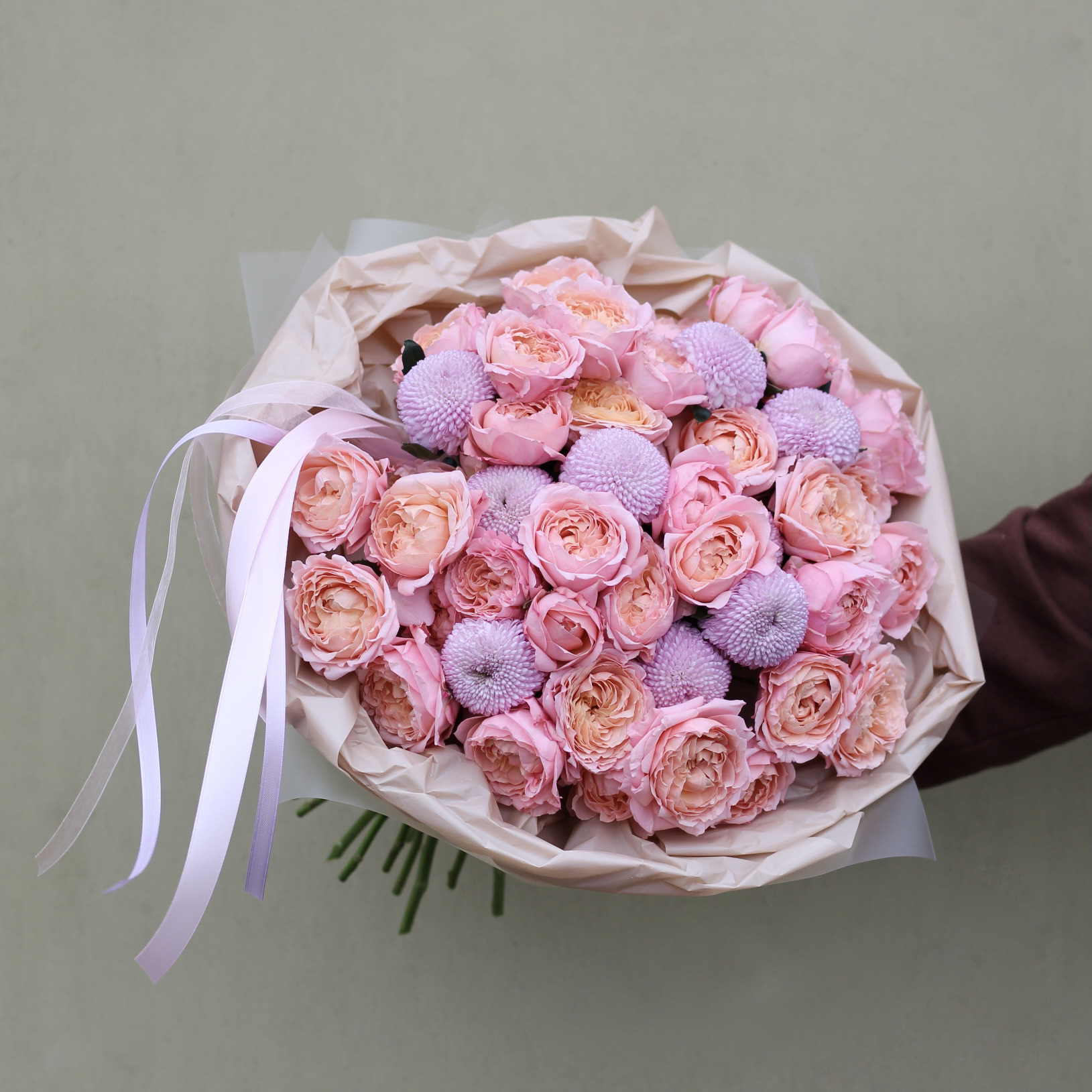 В составе: кустовая пионовидная роза Джульетта, одноголовая хризантема Момоко.