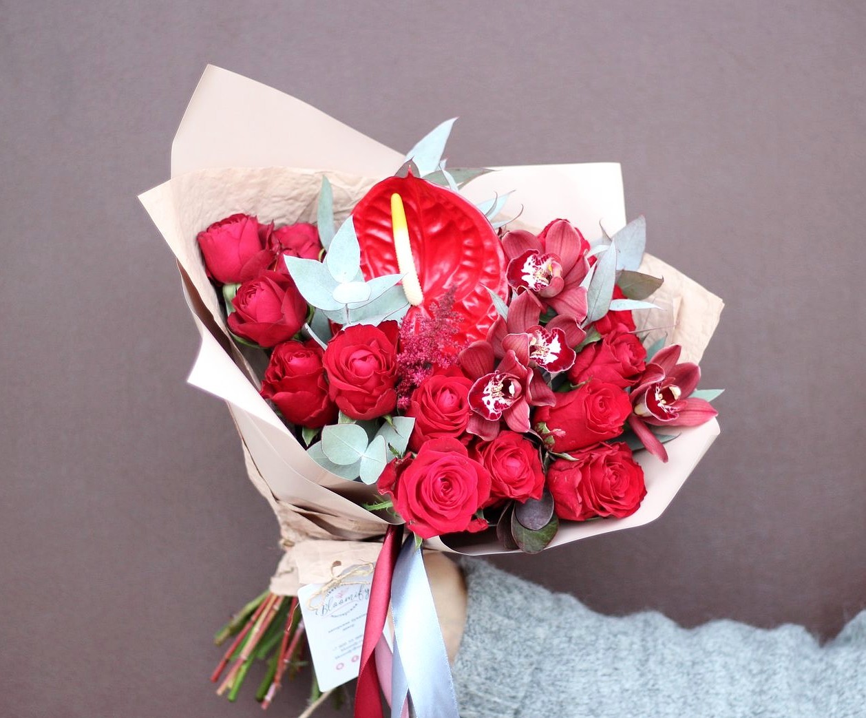 В составе: алые розы, антуриум, орхидеи, эвкалипт.