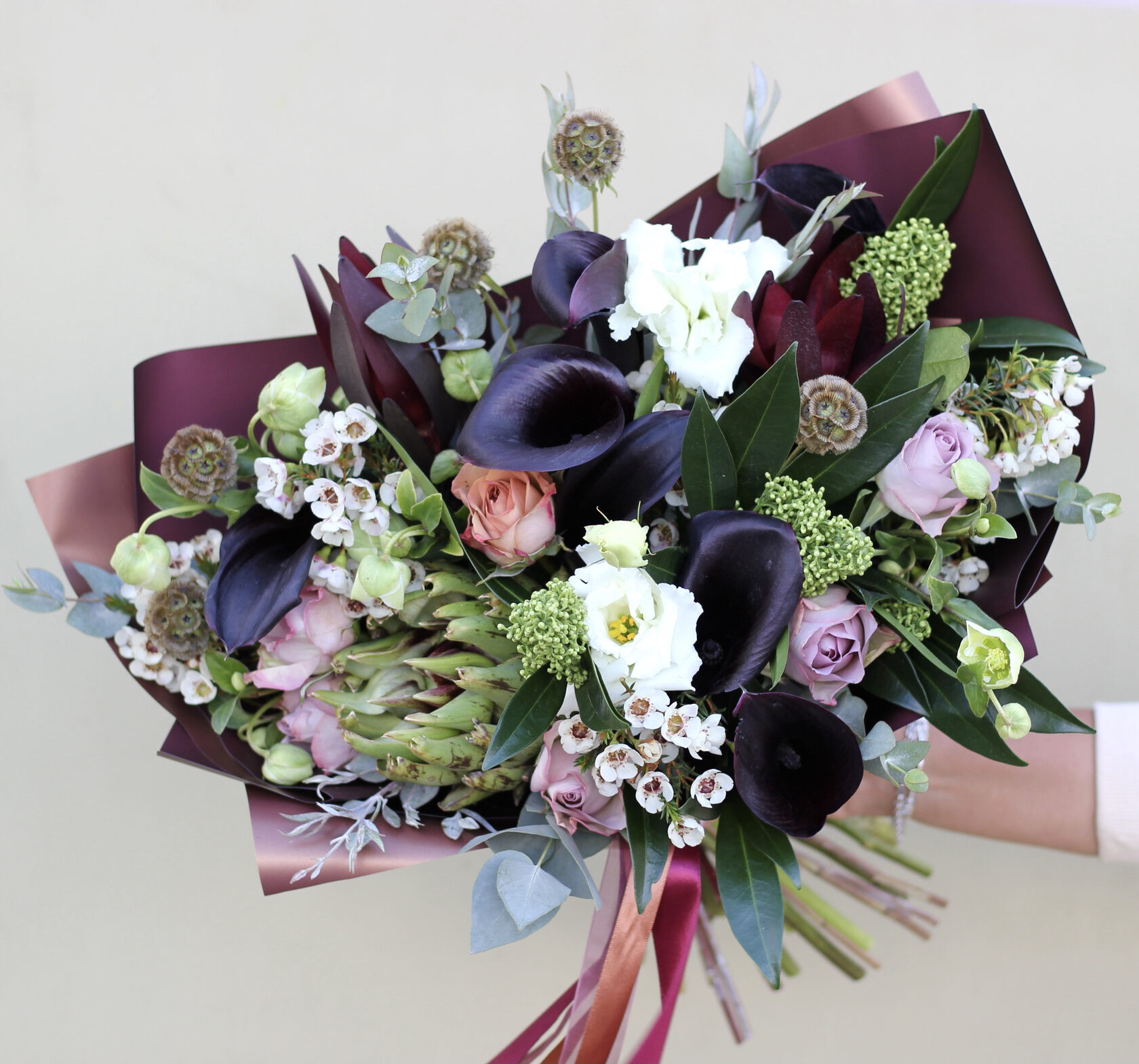 Раскидистый букет с черничными ранункулюсами, розами Капучино и артишоком
