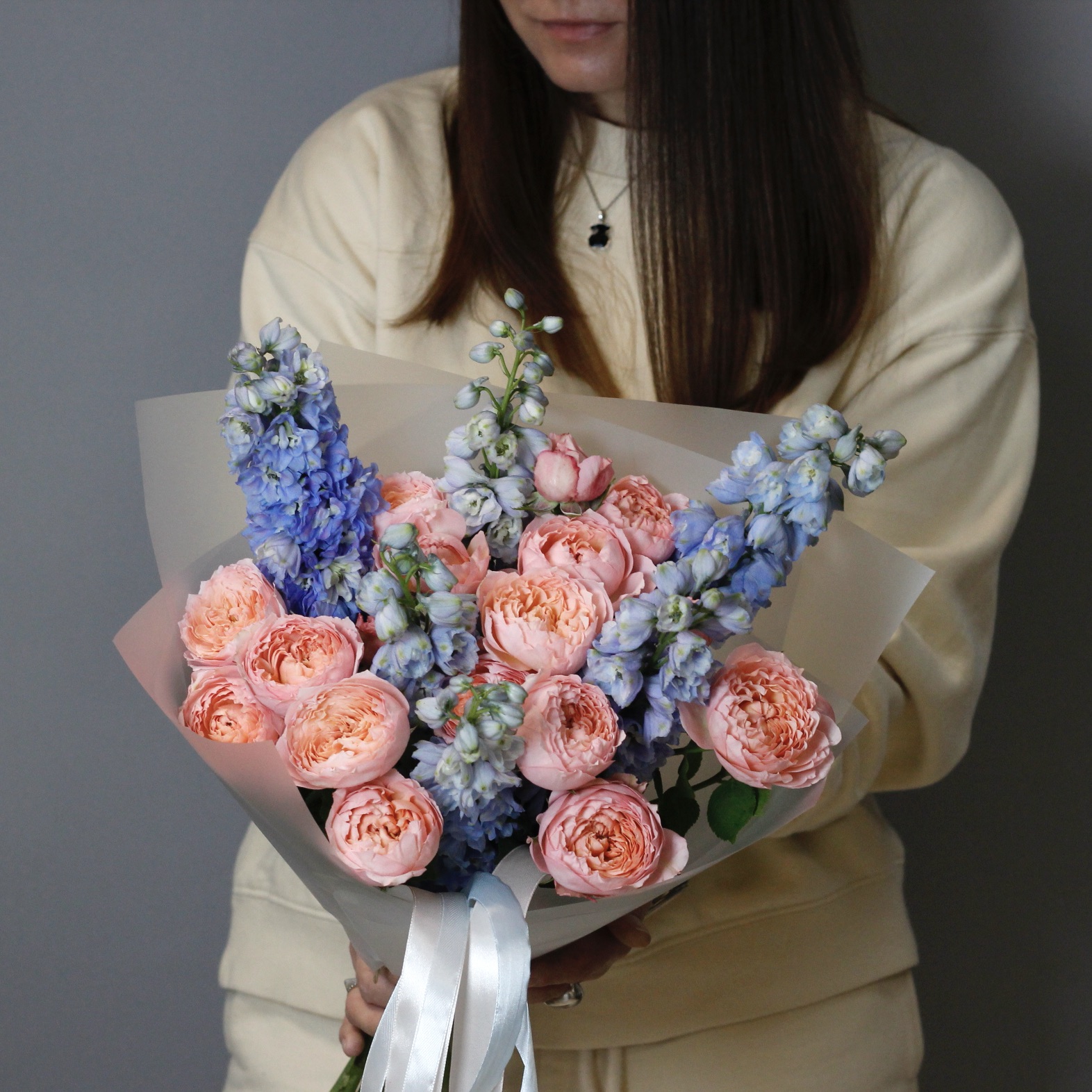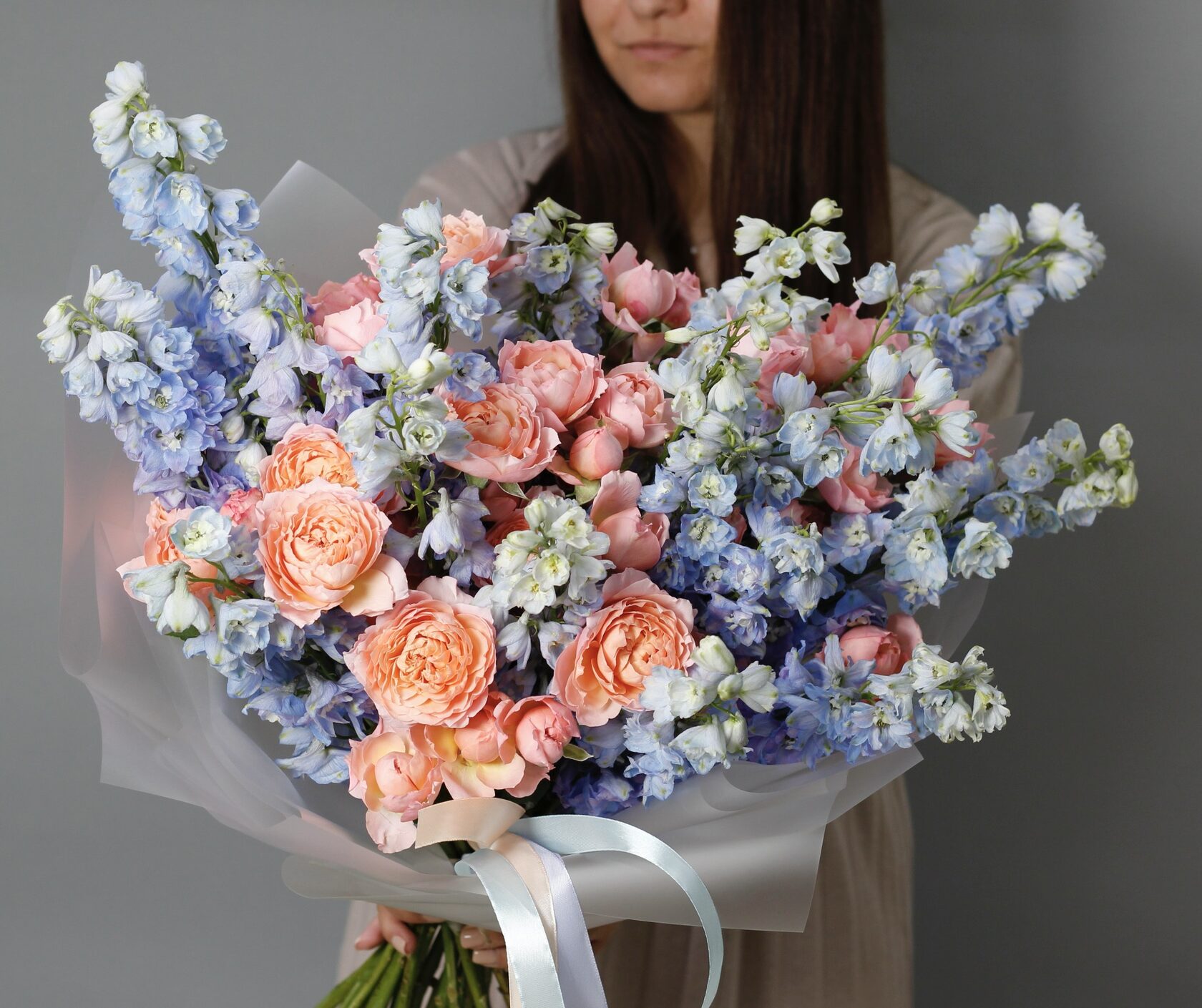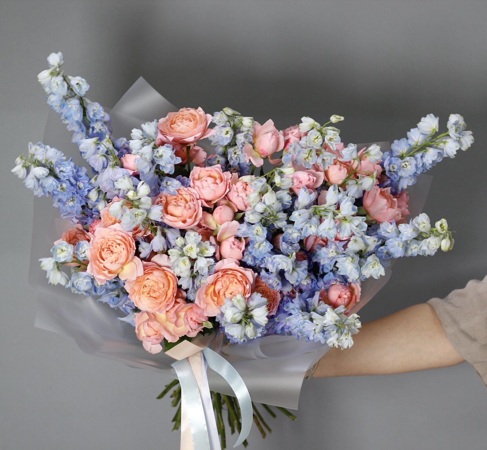 Раскидистый дуобукет из небесно-голубого дельфиниума и пионовидных роз Джульетта.