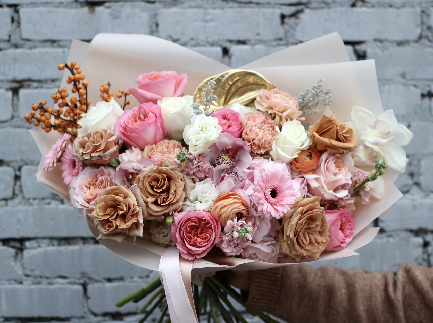 В составе: несколько сортов пионовидных роз, махровая эустома, мини-герберы, диантусы, орхидеи, гортензия, антуриум, маттиола, ранункулюсы, кохия.