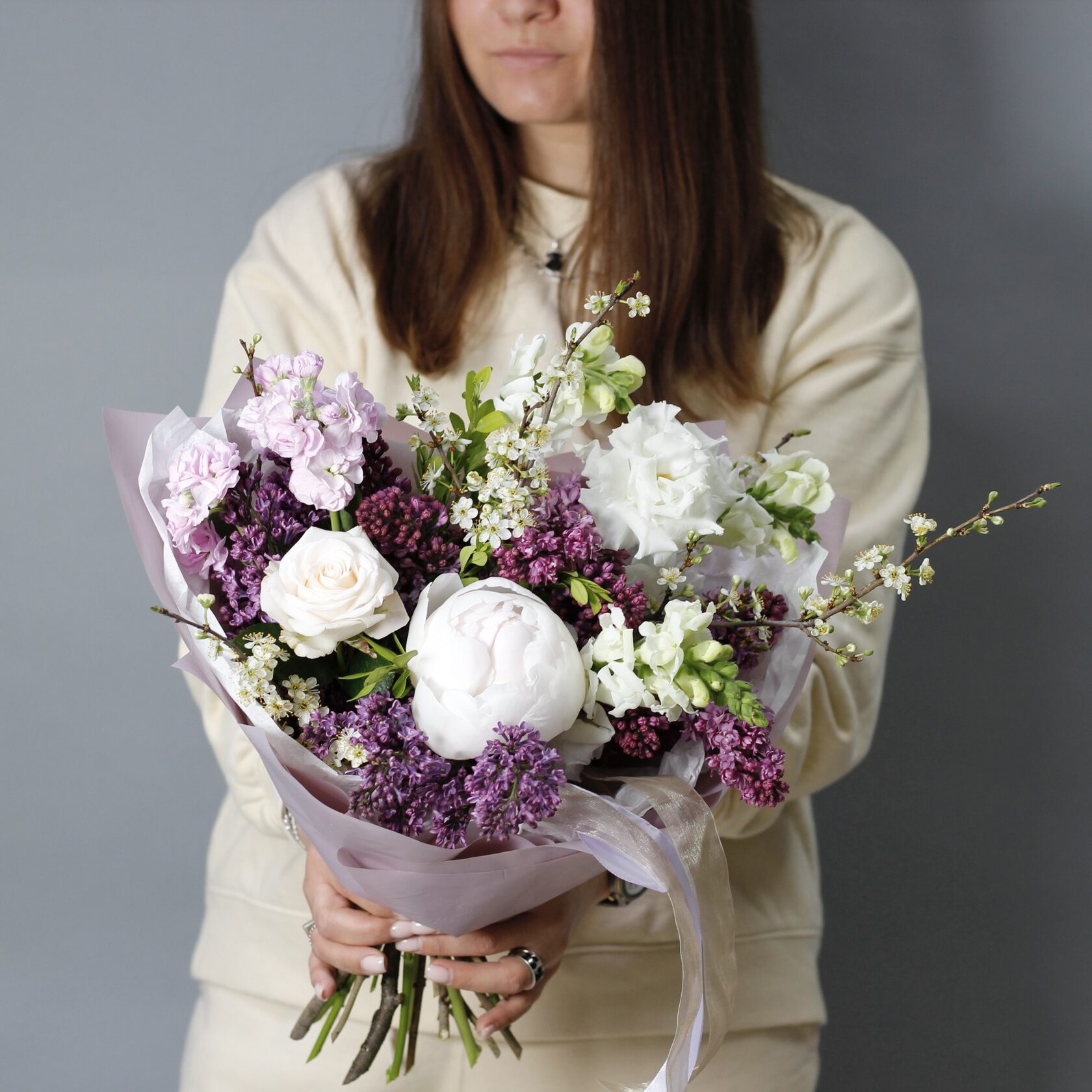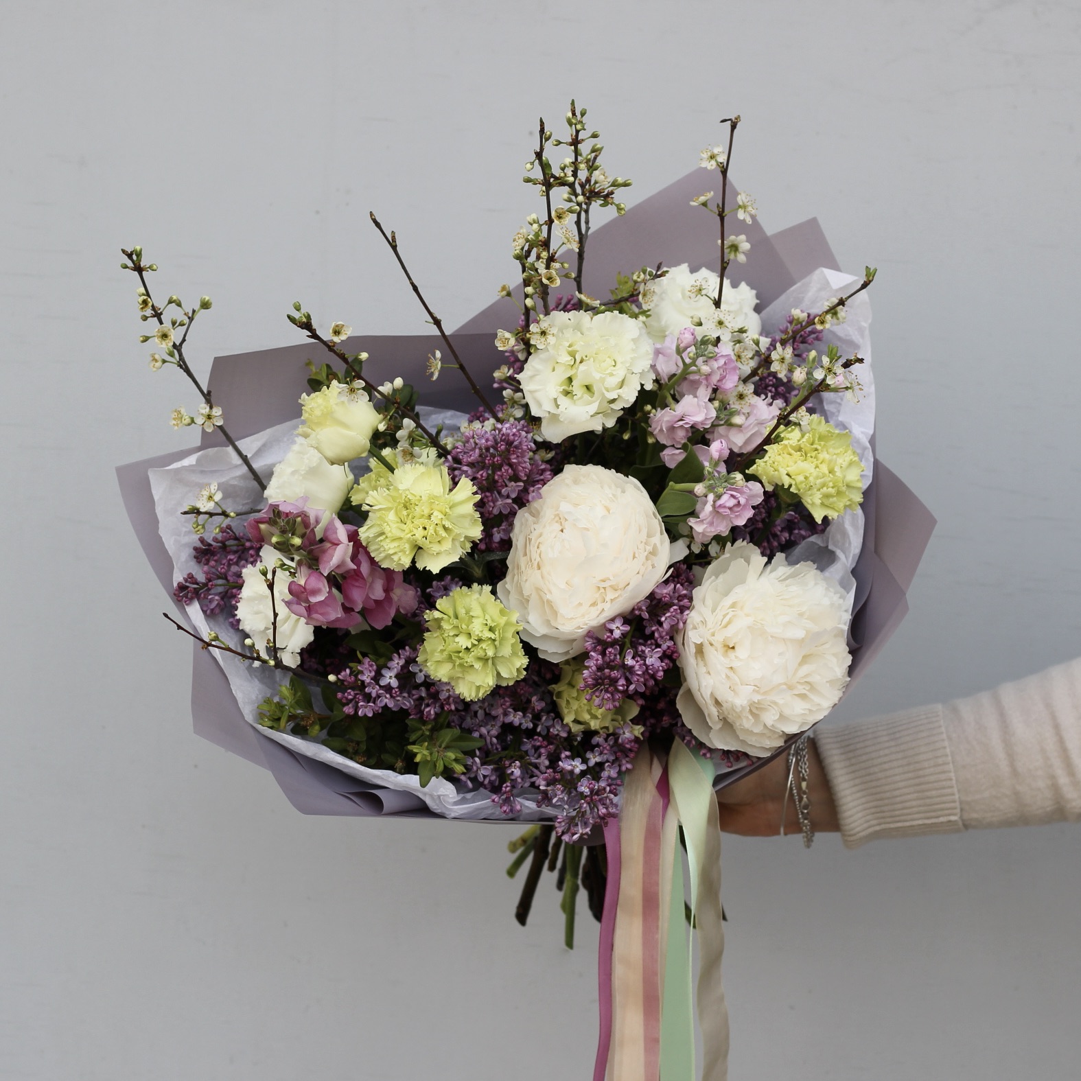 В составе: пионы, сирень, маттиола, диантусы, эустома, цветущие веточки.