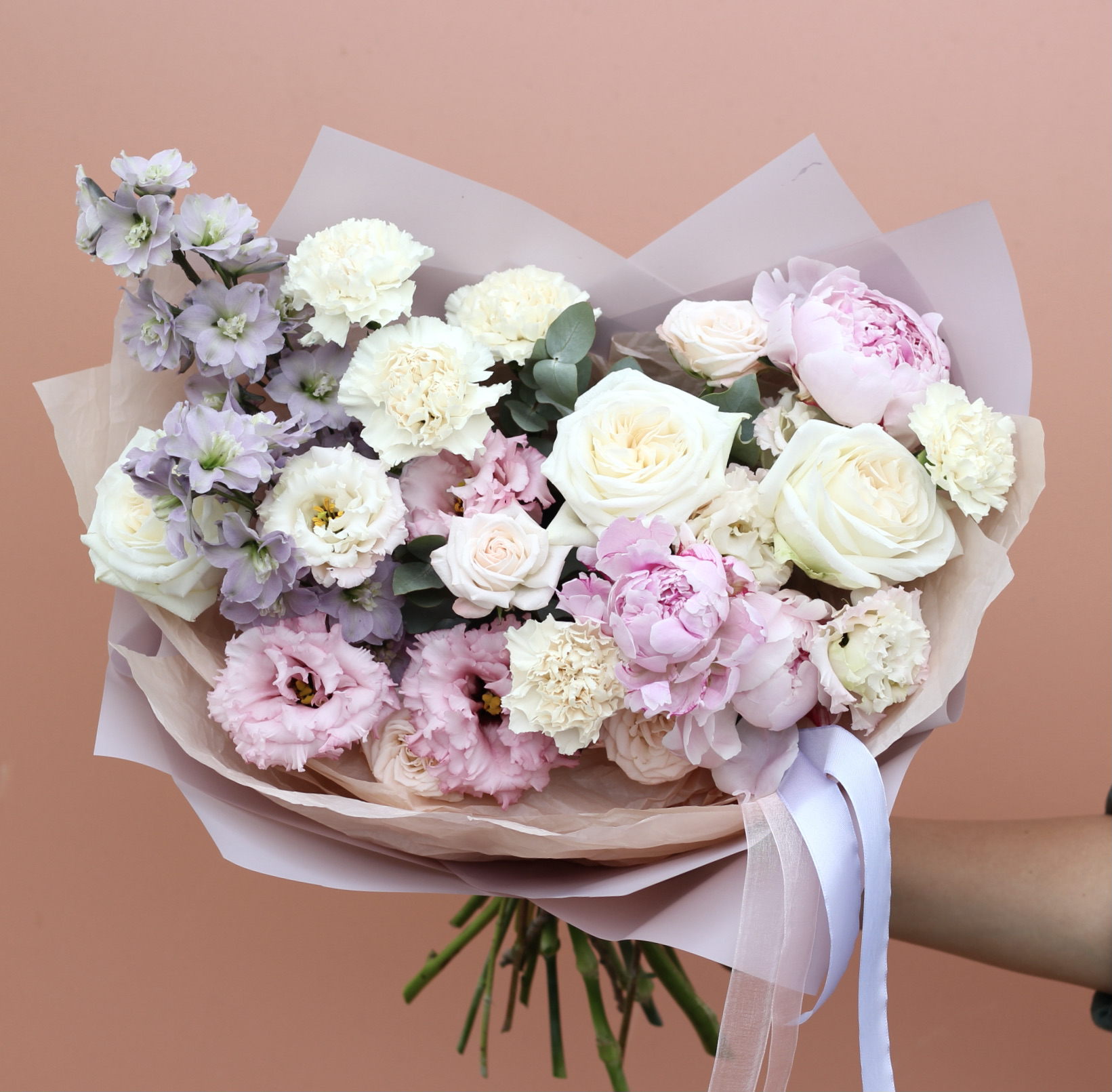 В составе: пионы, пионовидные розы, махровая эустома, дельфиниум, диантусы, зелень эвкалипта.