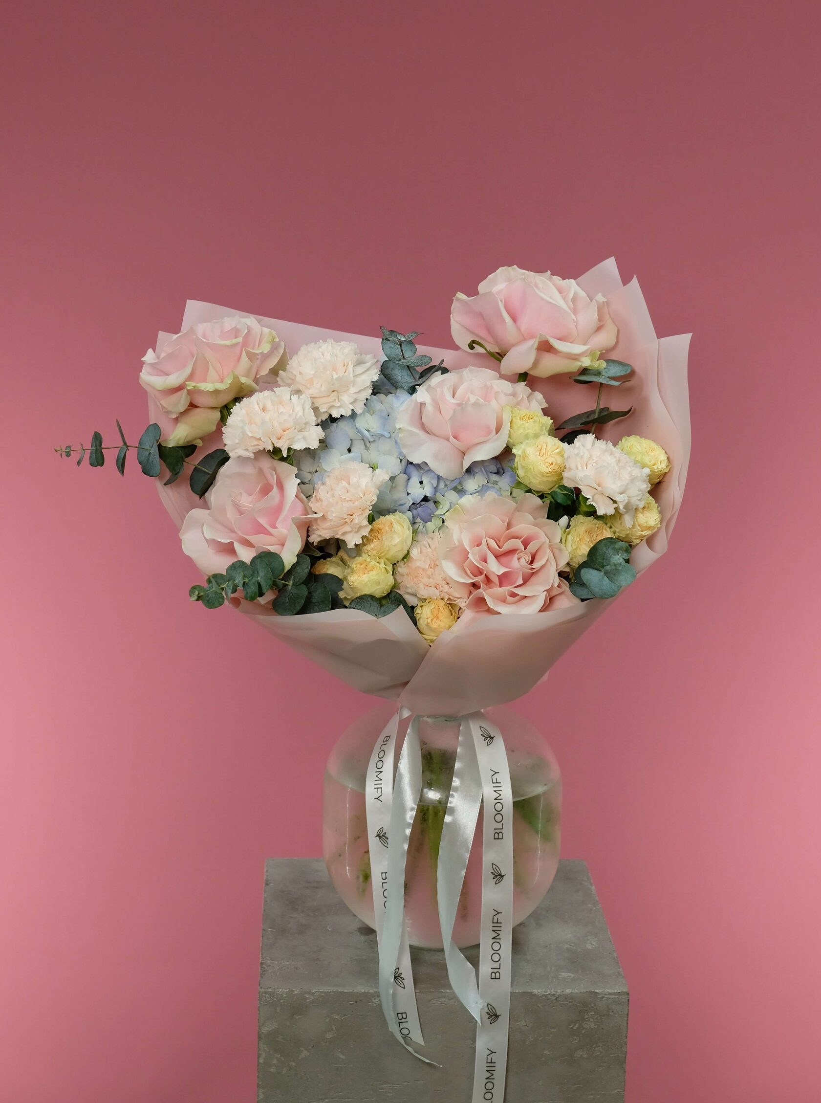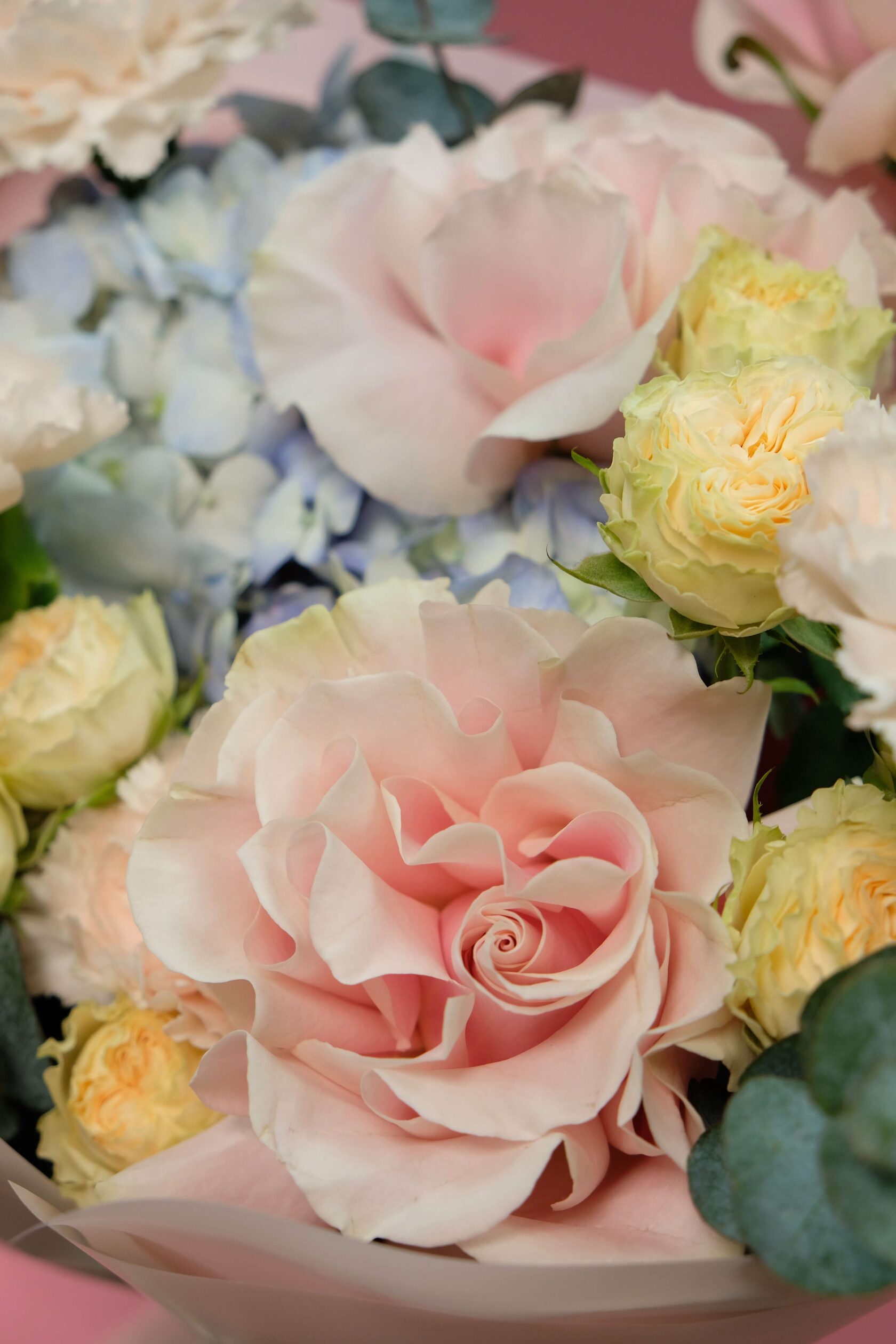 В составе: французские розы, гортензия, диантус, кустовая роза, зелень эвкалипта.