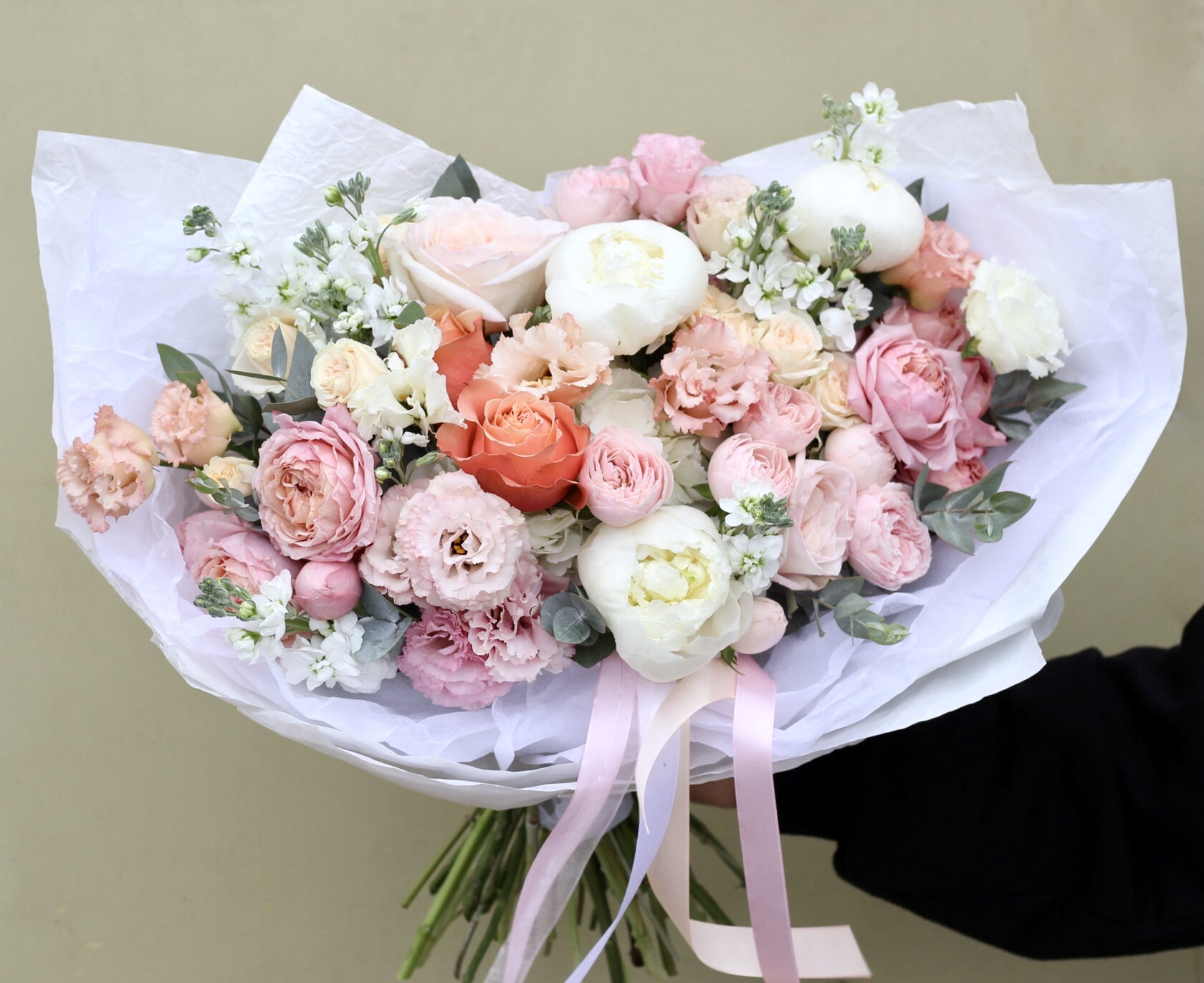 Раскидистый букет из нескольких сортов пионовидных роз нежных пастельных оттенков