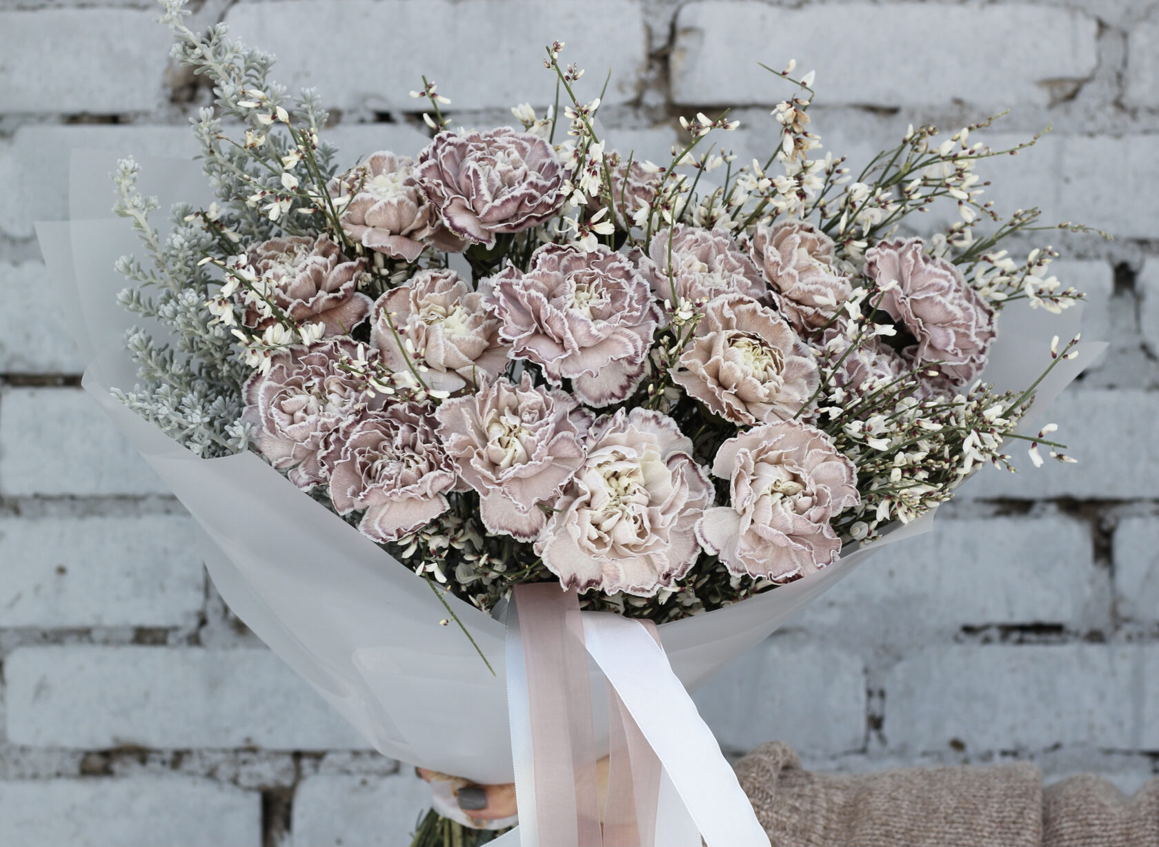 Букет из кофейных диантусов и ароматных веточек генисты. Утонченное и весеннее сочетание, которое оценят настоящие эстеты и любители необычного.