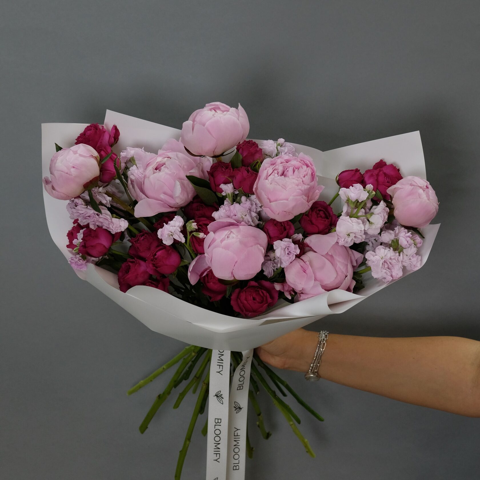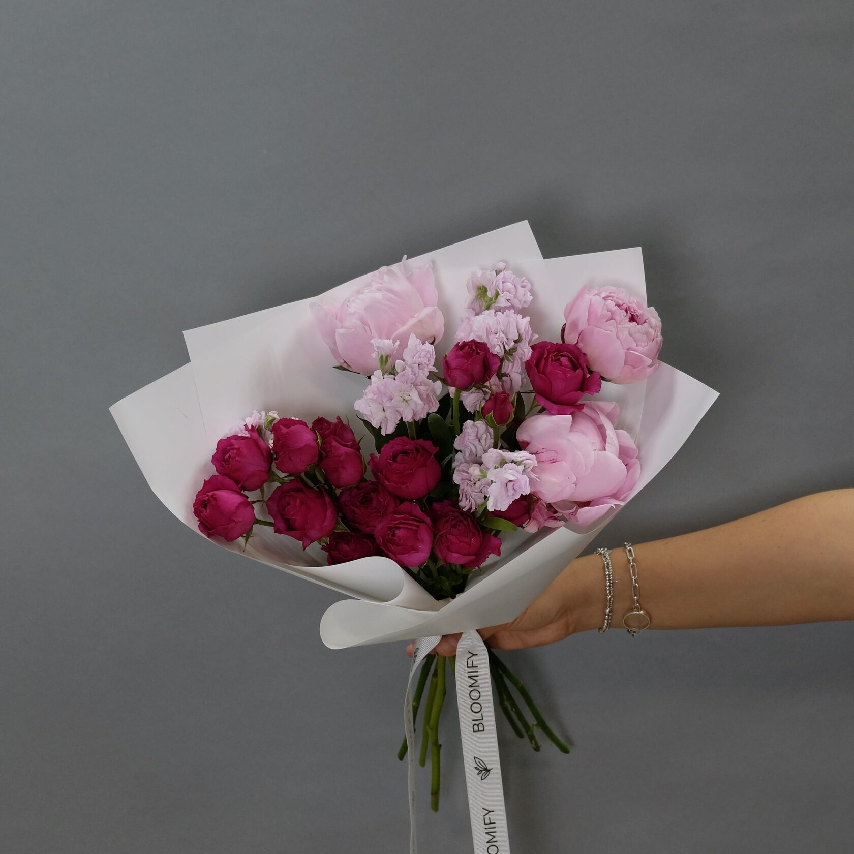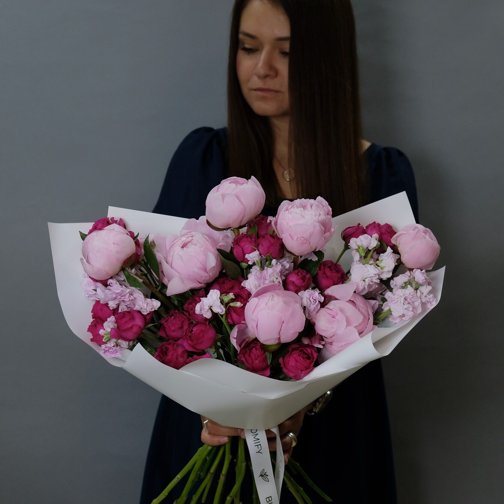 Компактный букет-комплимент c пионовидными розами и пионом - любимчиками абсолютно всех девушек! Красота воздушных фактурных соцветий их бутонов завораживают и восхищают, а нежный легкий аромат уносит прямиком в лето!