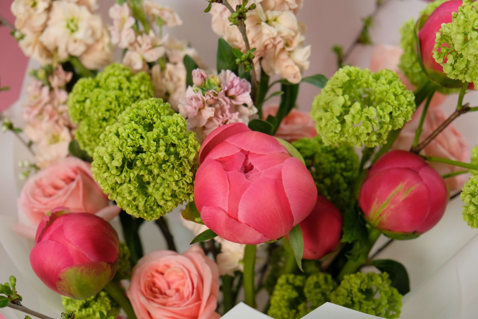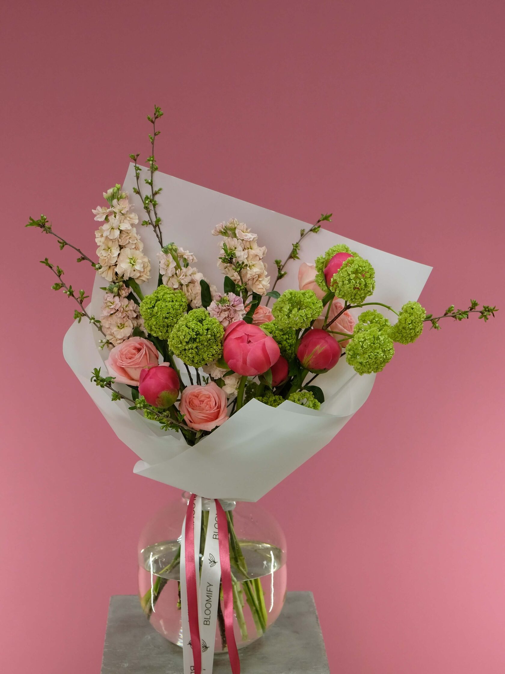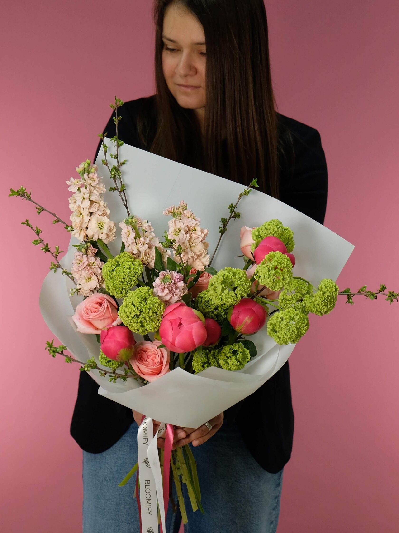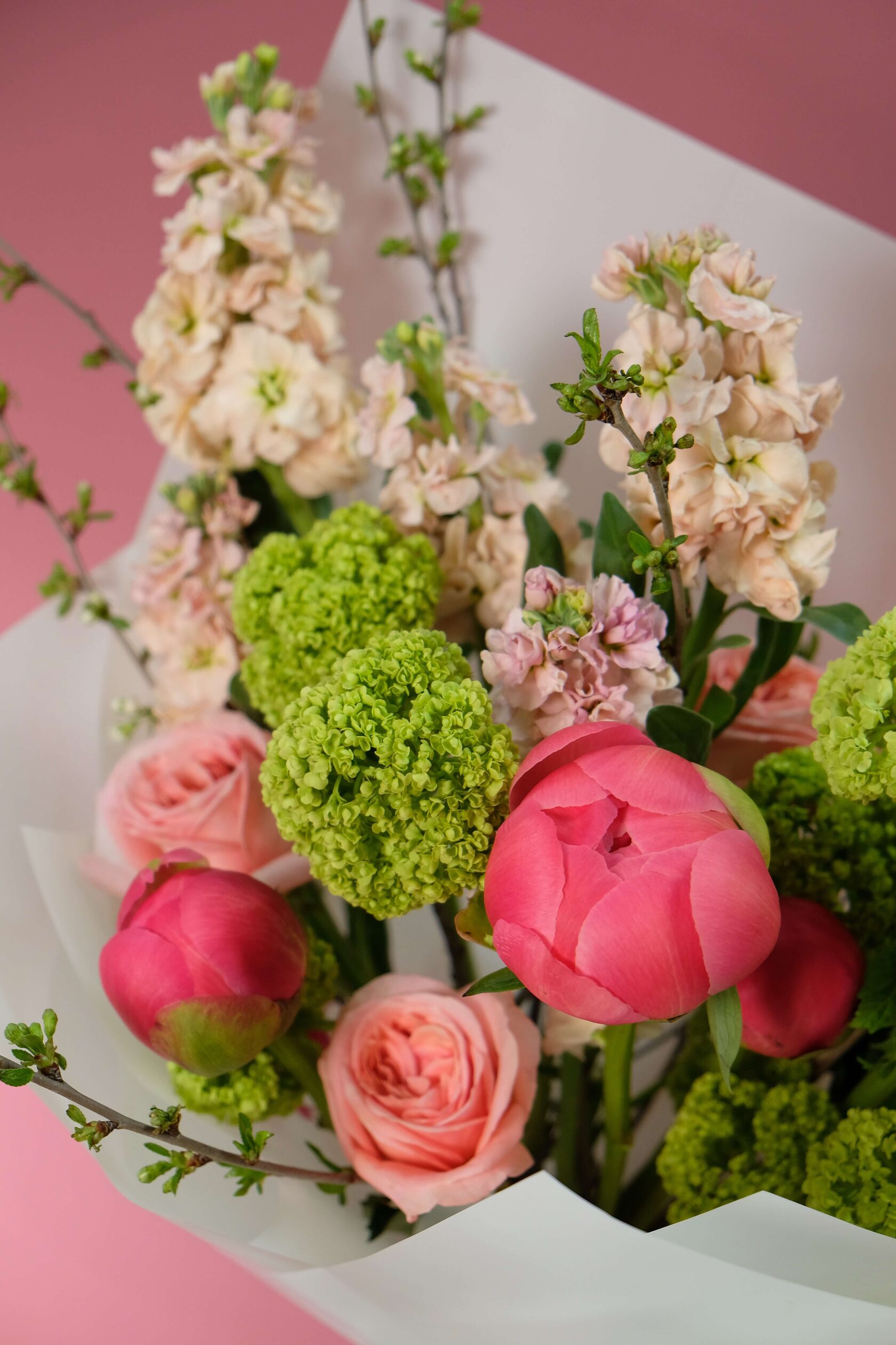 В составе: коралловые пионы, пионовидные розы, вибурнум, ароматная маттиола, цветущие ветки.
