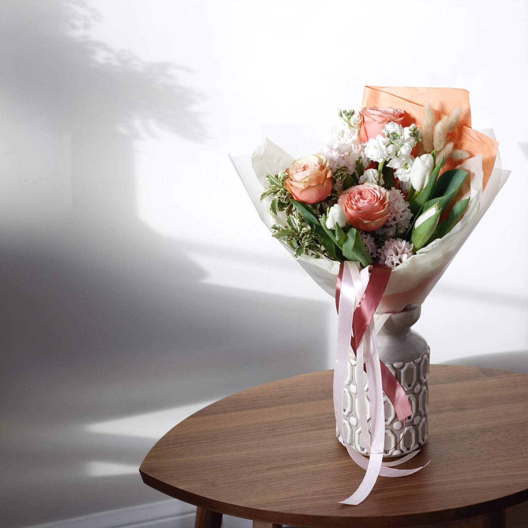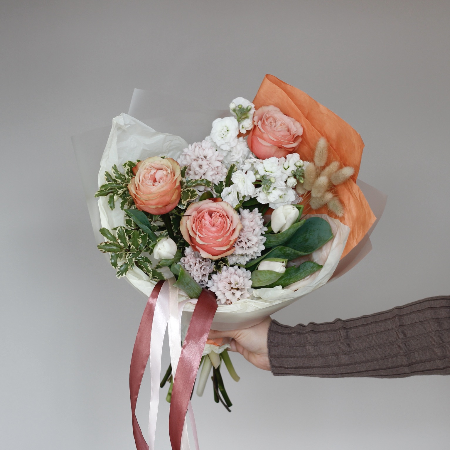 В составе: персиковые пионовидные розы, маттиола, тюльпаны, гиацинты, зелень питоспорума, лагурус.