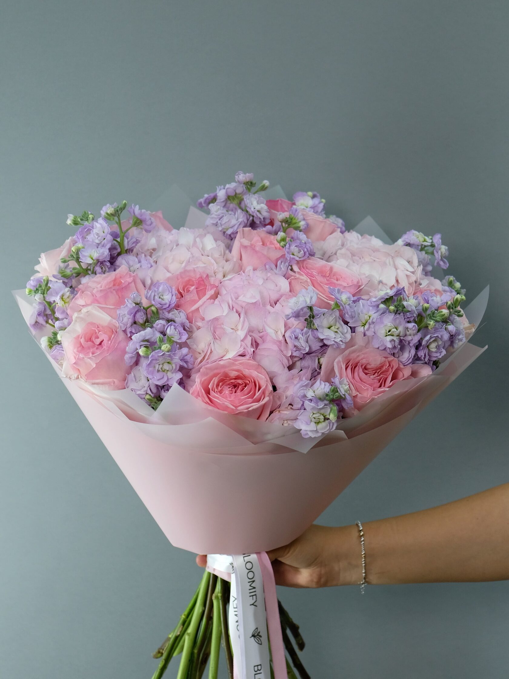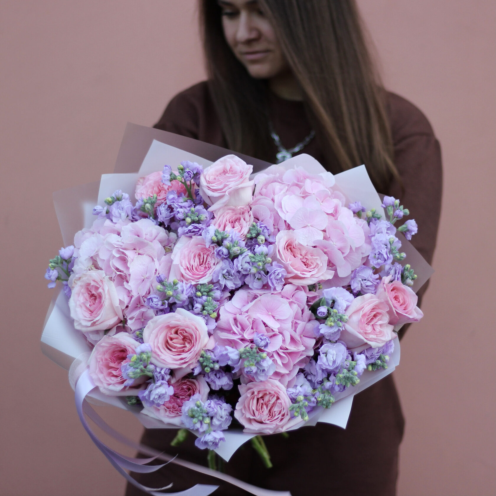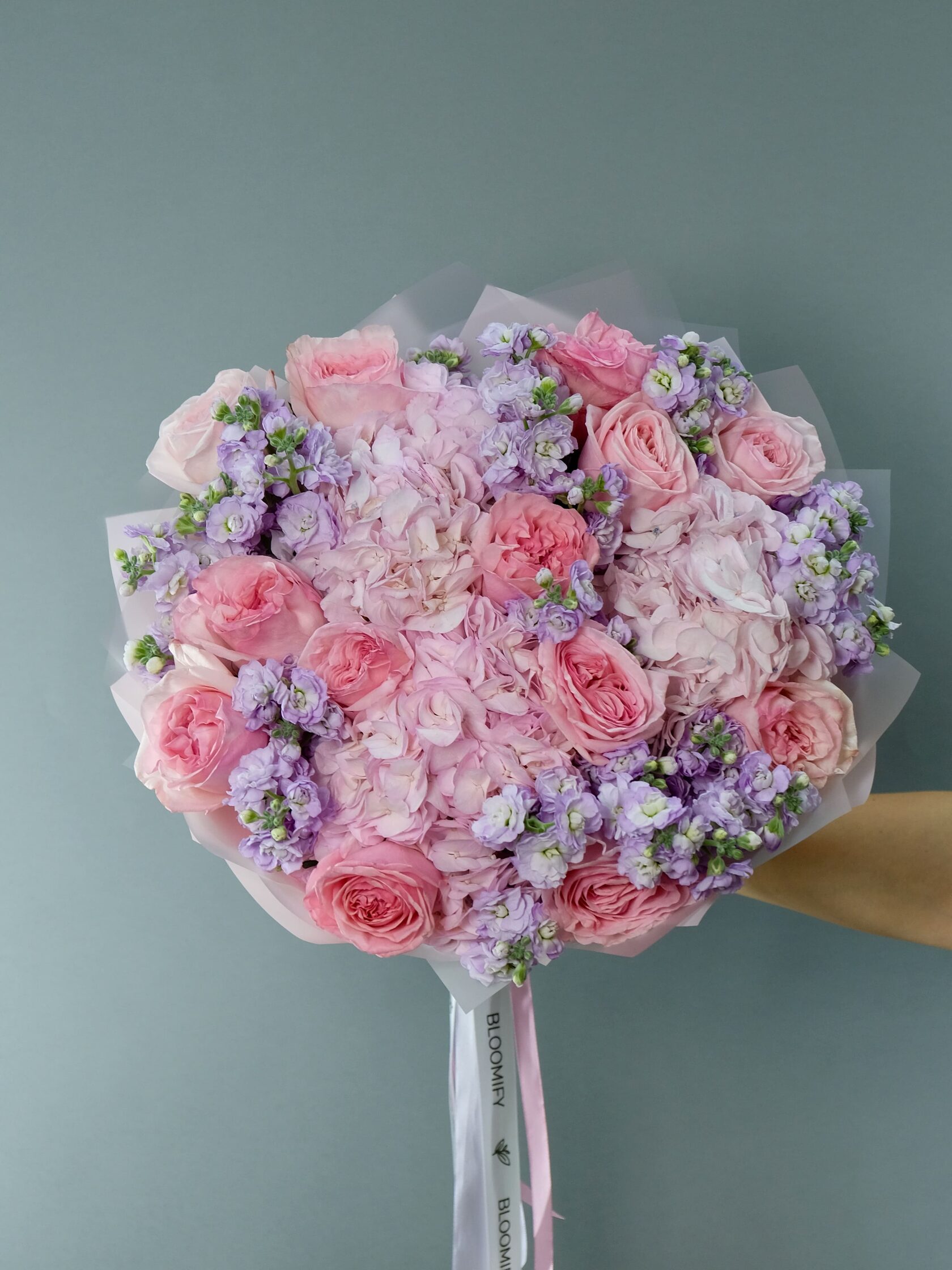 В составе: пионовидная роза Пинк Охара, кустовая маттиола, гортензии.