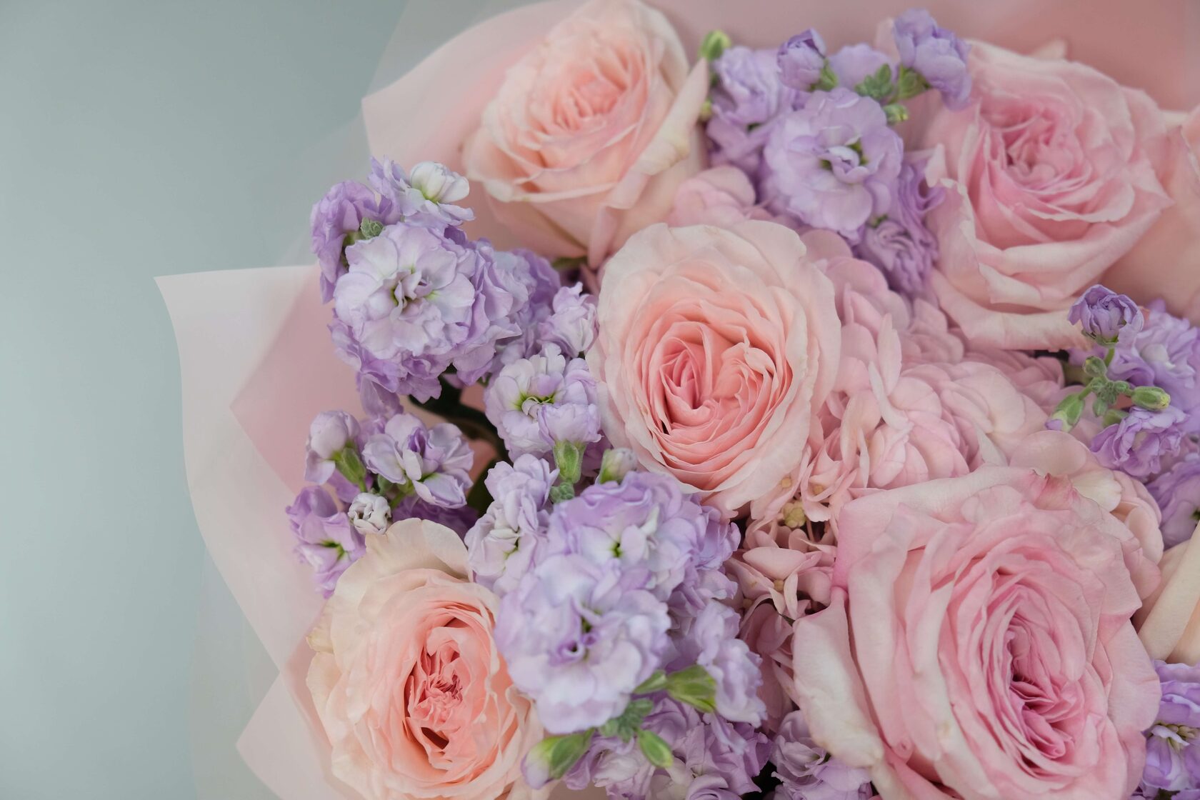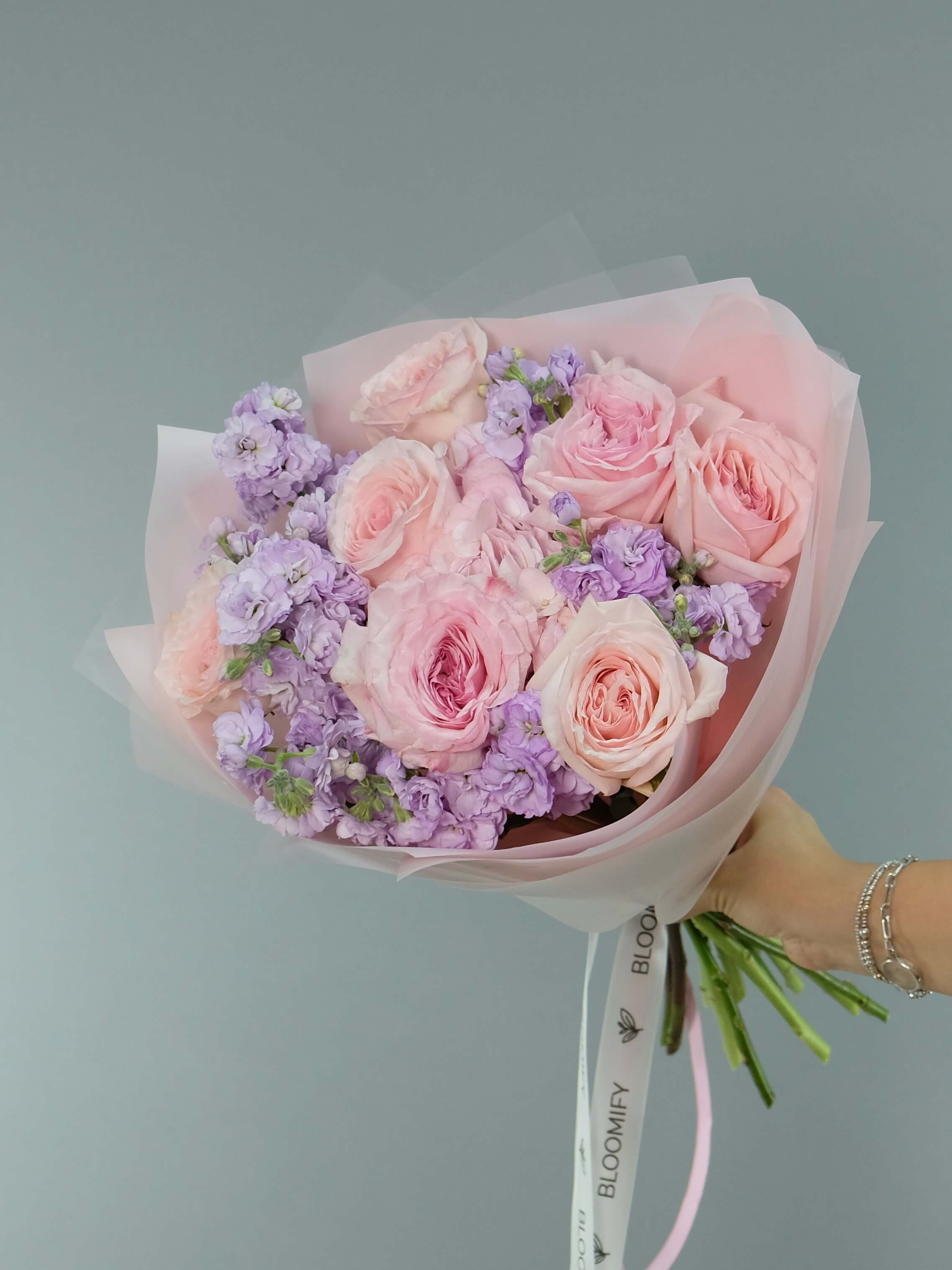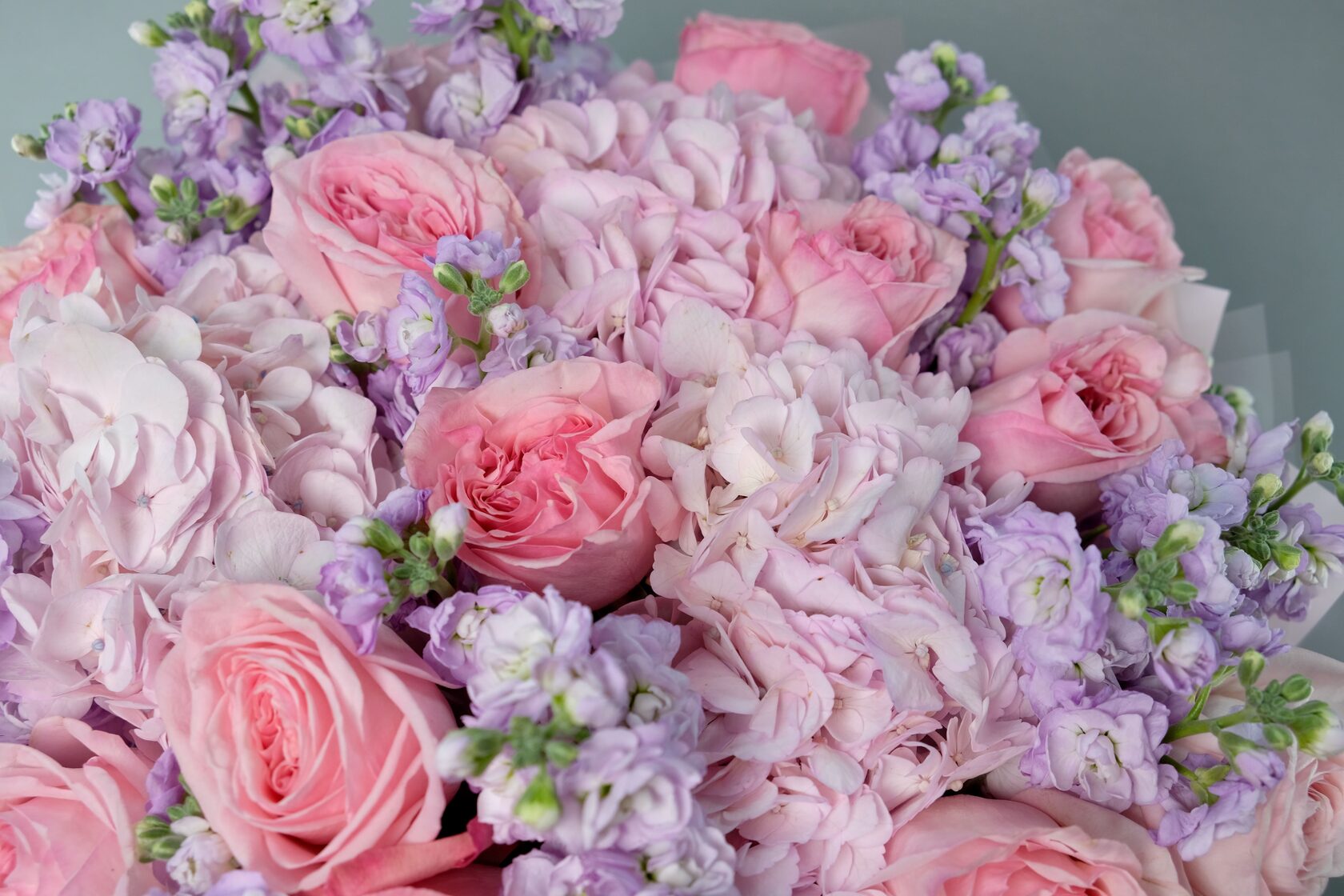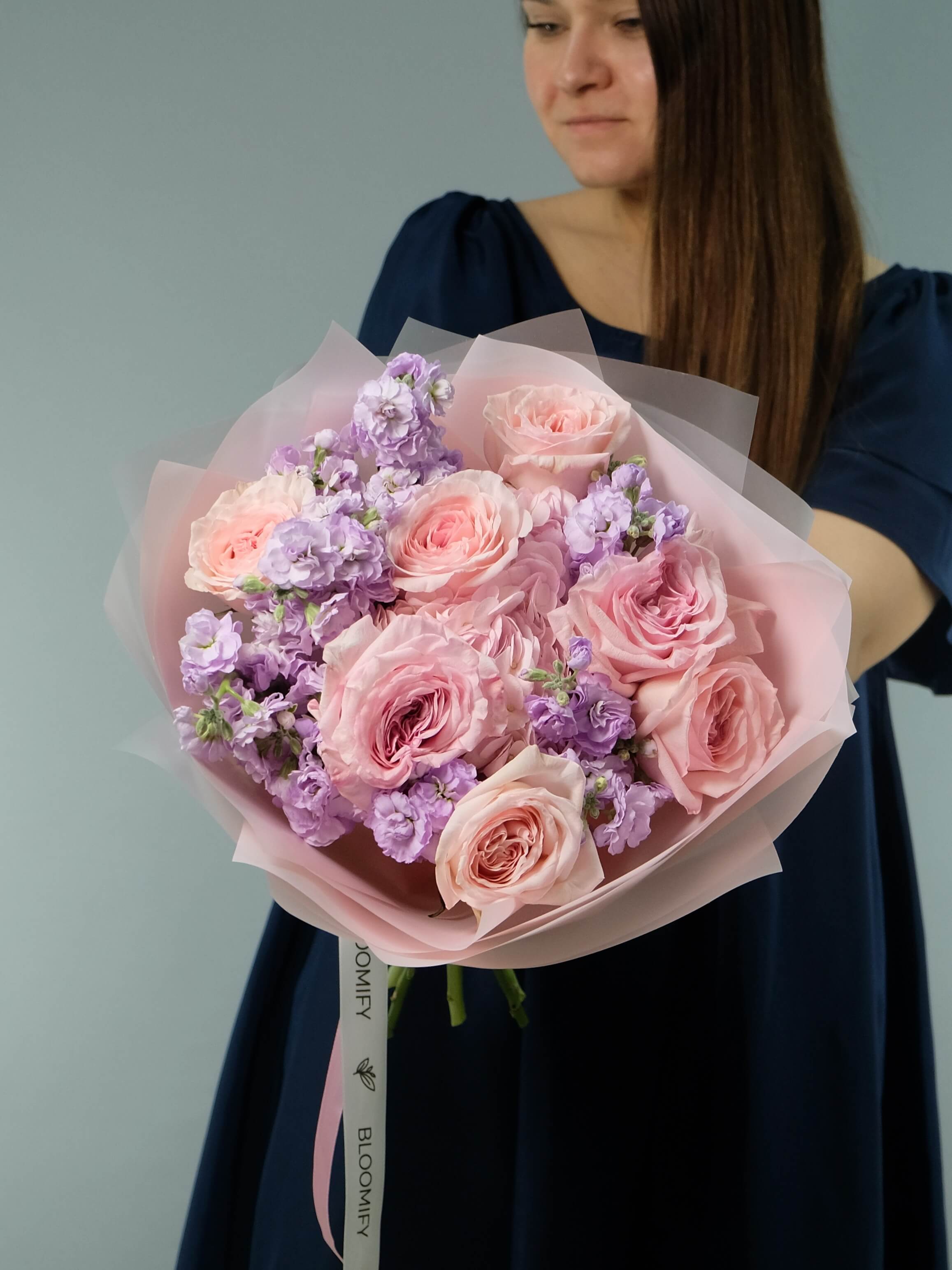В составе: пионовидная роза Пинк Охара, кустовая маттиола, гортензии.